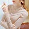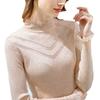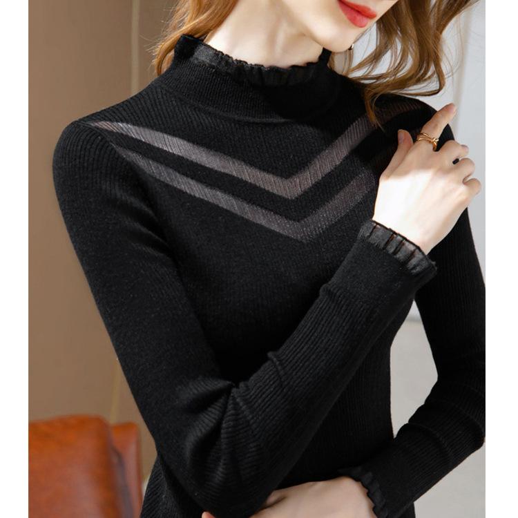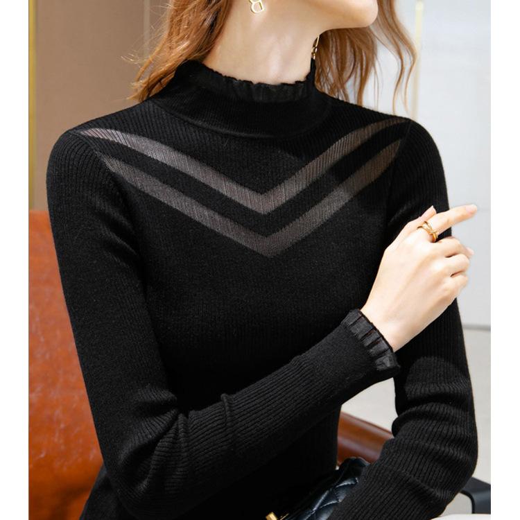 Otoño e invierno nuevo suéter interior delgado y adelgazante para mujer estilo dulce y picante cuello semi alto borde de volantes tejido de malla camiseta básica para mujer