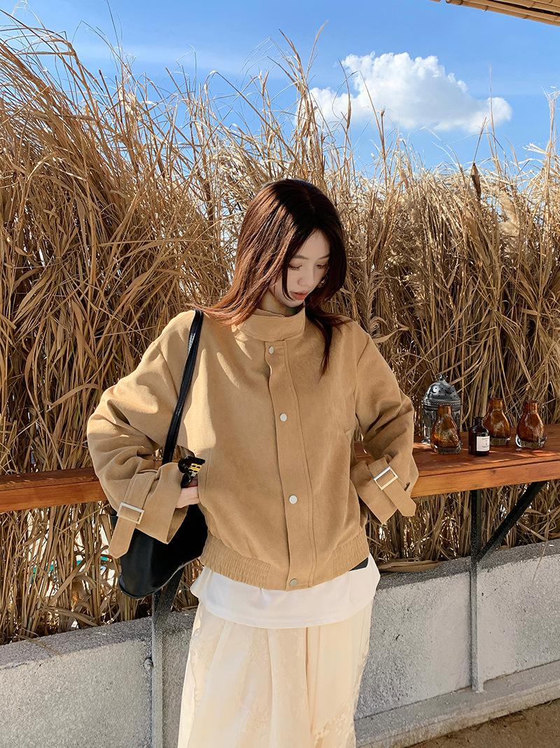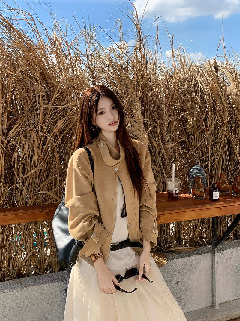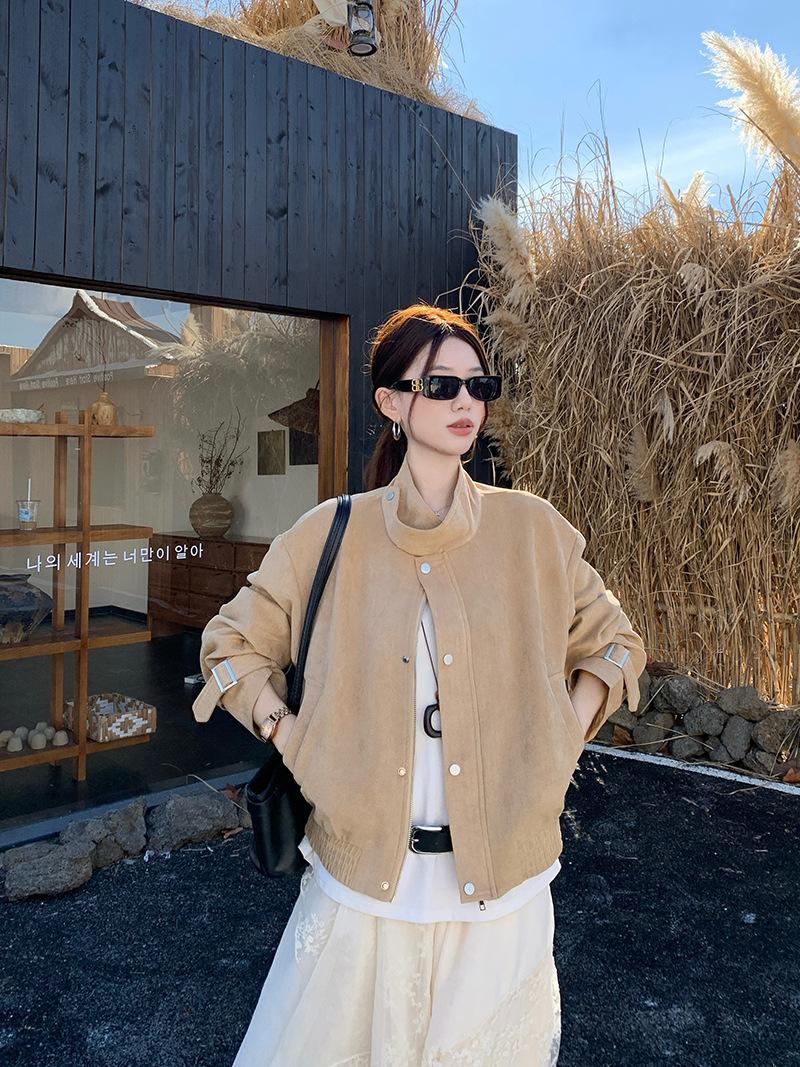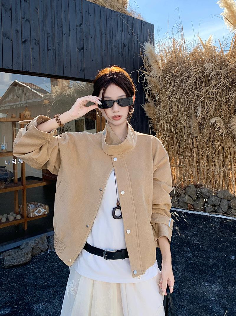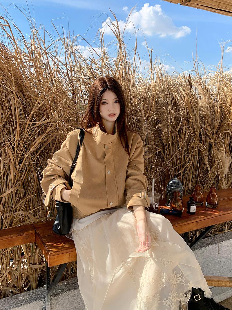 Foto real Americana holgada adelgazante casual versátil chaqueta color arena viento de granero pequeño cuello alto otoño abrigo corto mujer