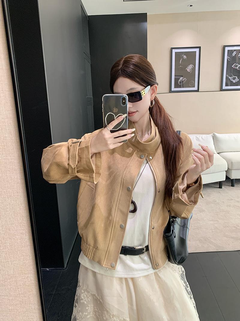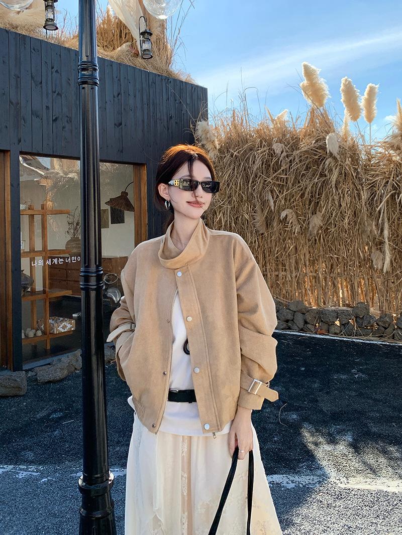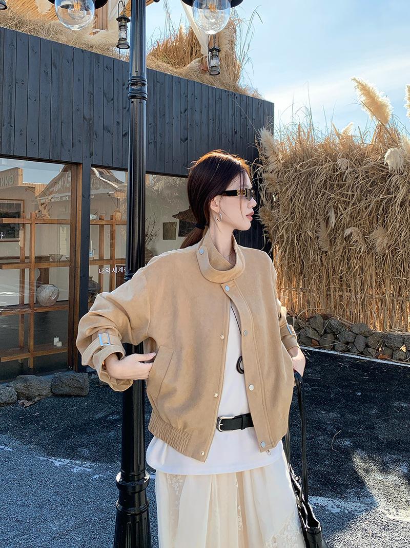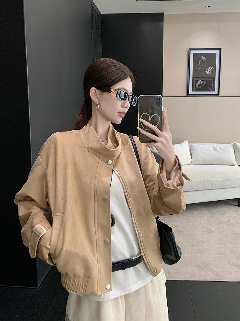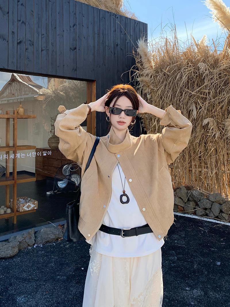 Foto real Americana holgada adelgazante casual versátil chaqueta color arena viento de granero pequeño cuello alto otoño abrigo corto mujer