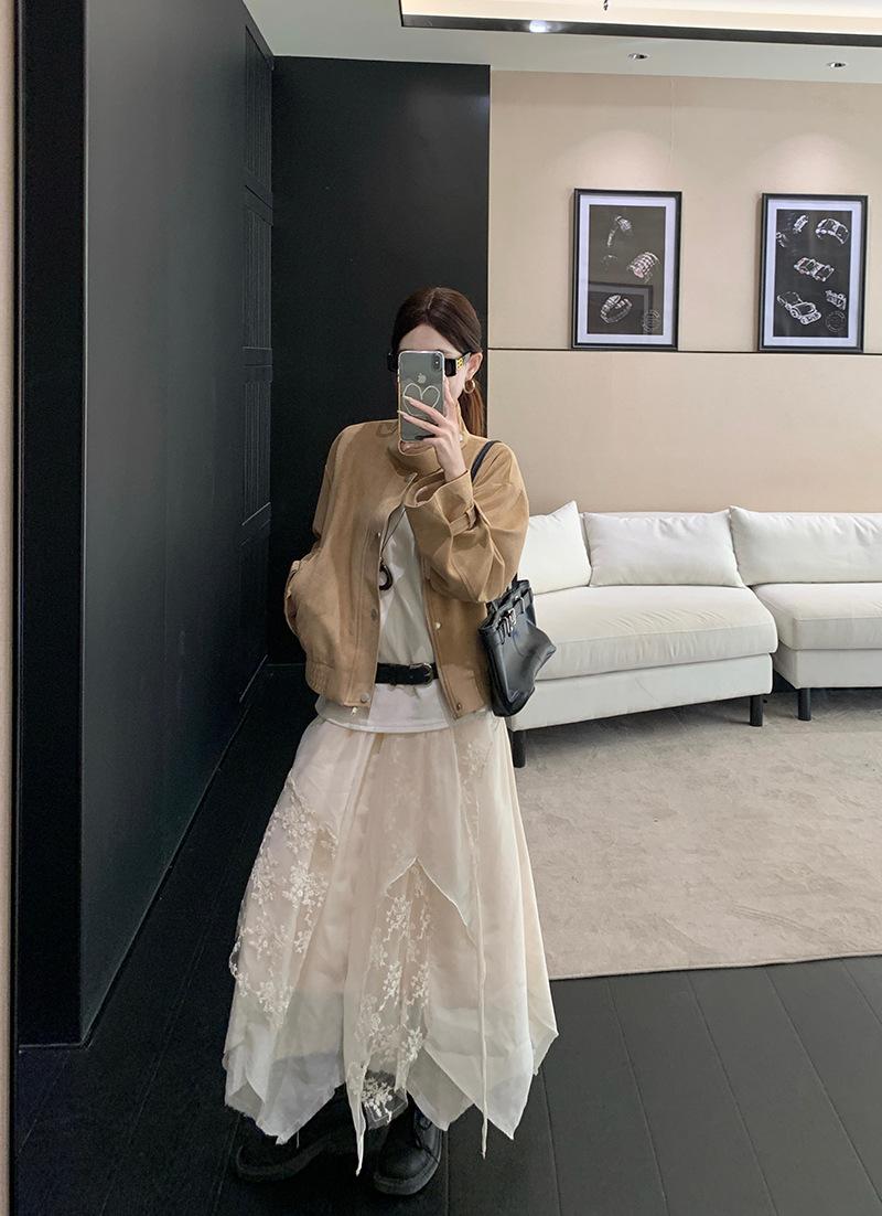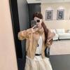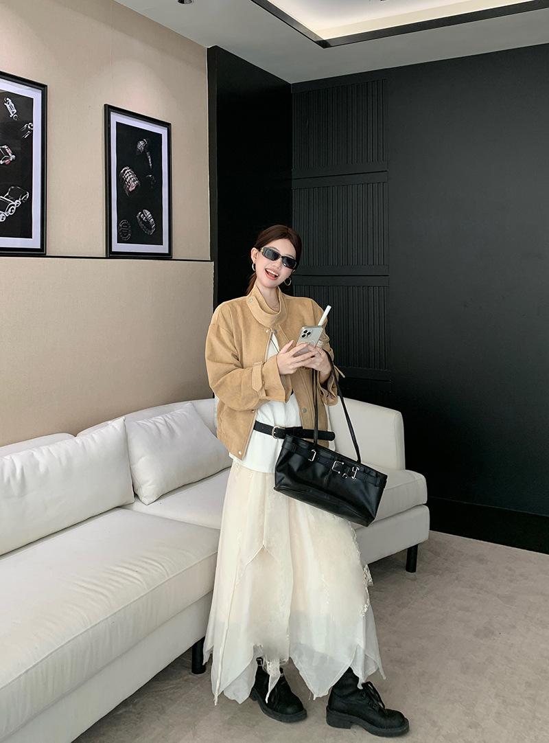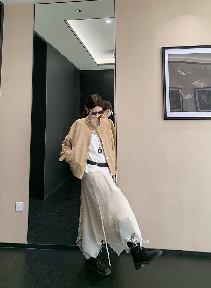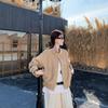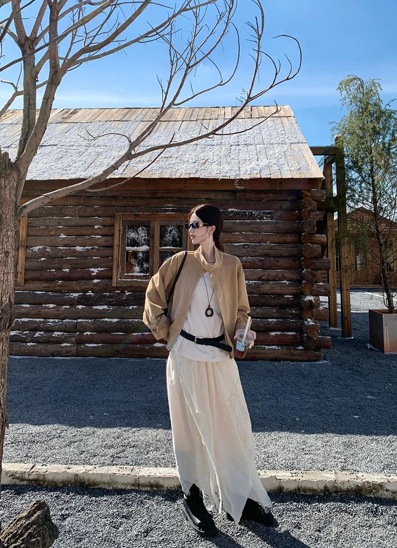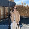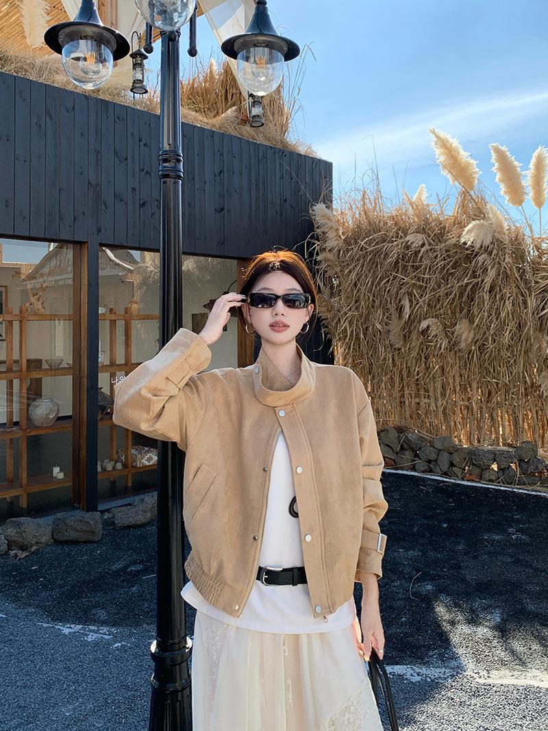 Foto real Americana holgada adelgazante casual versátil chaqueta color arena viento de granero pequeño cuello alto otoño abrigo corto mujer