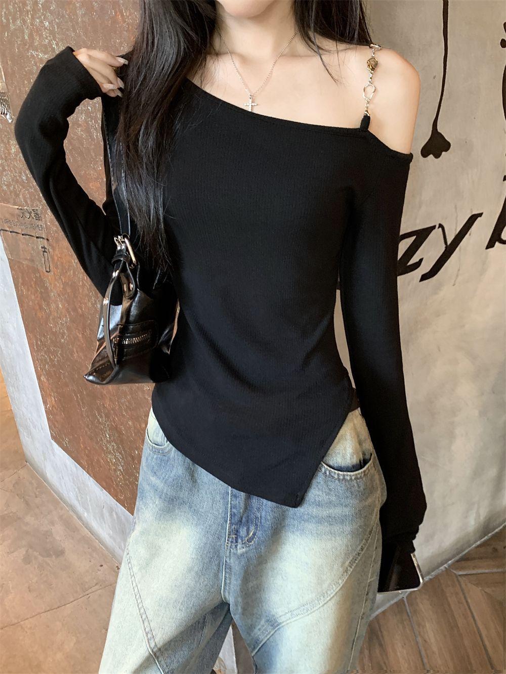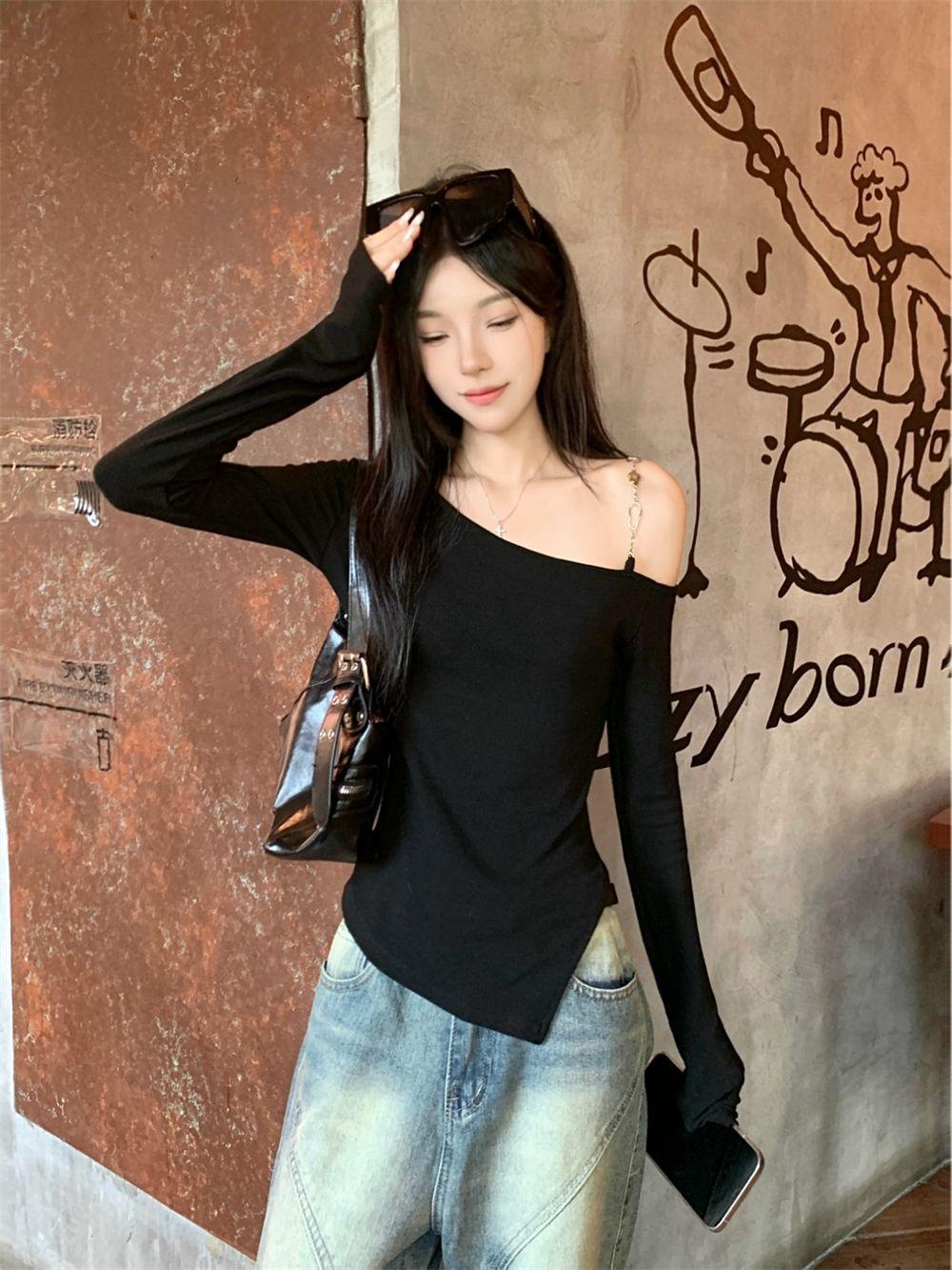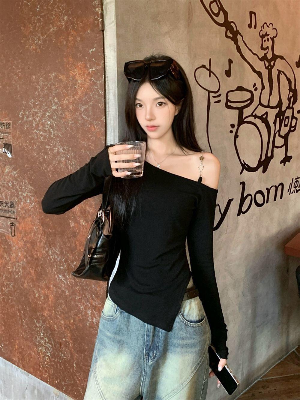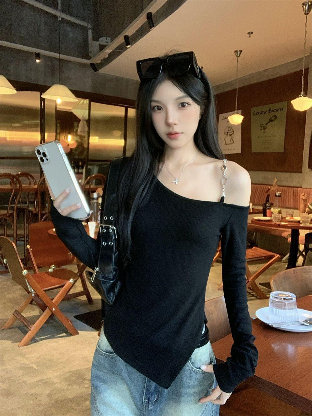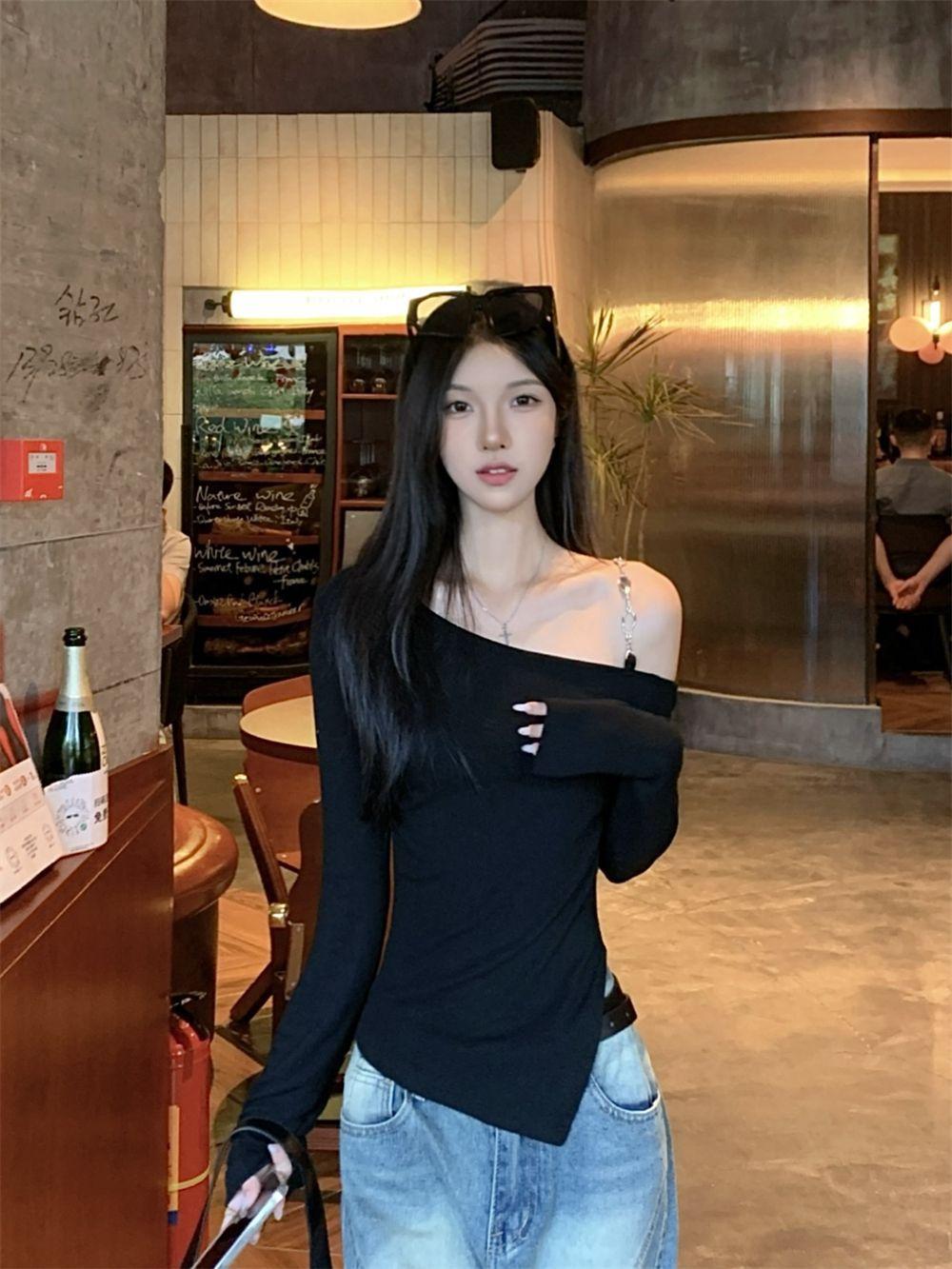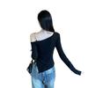 Chica Picante Sexy Camiseta de Manga Larga con Hombros Descubiertos para Mujer Diseño de Principios de Otoño Sencilla Adelgazante Color Sólido Camiseta Básica Top