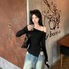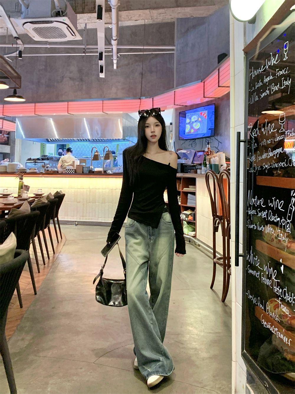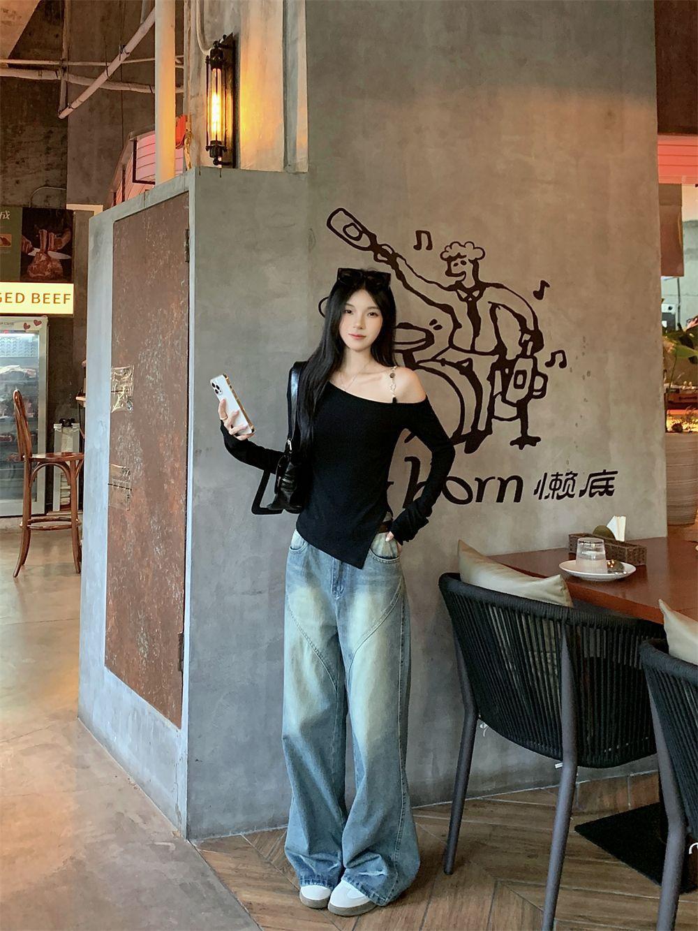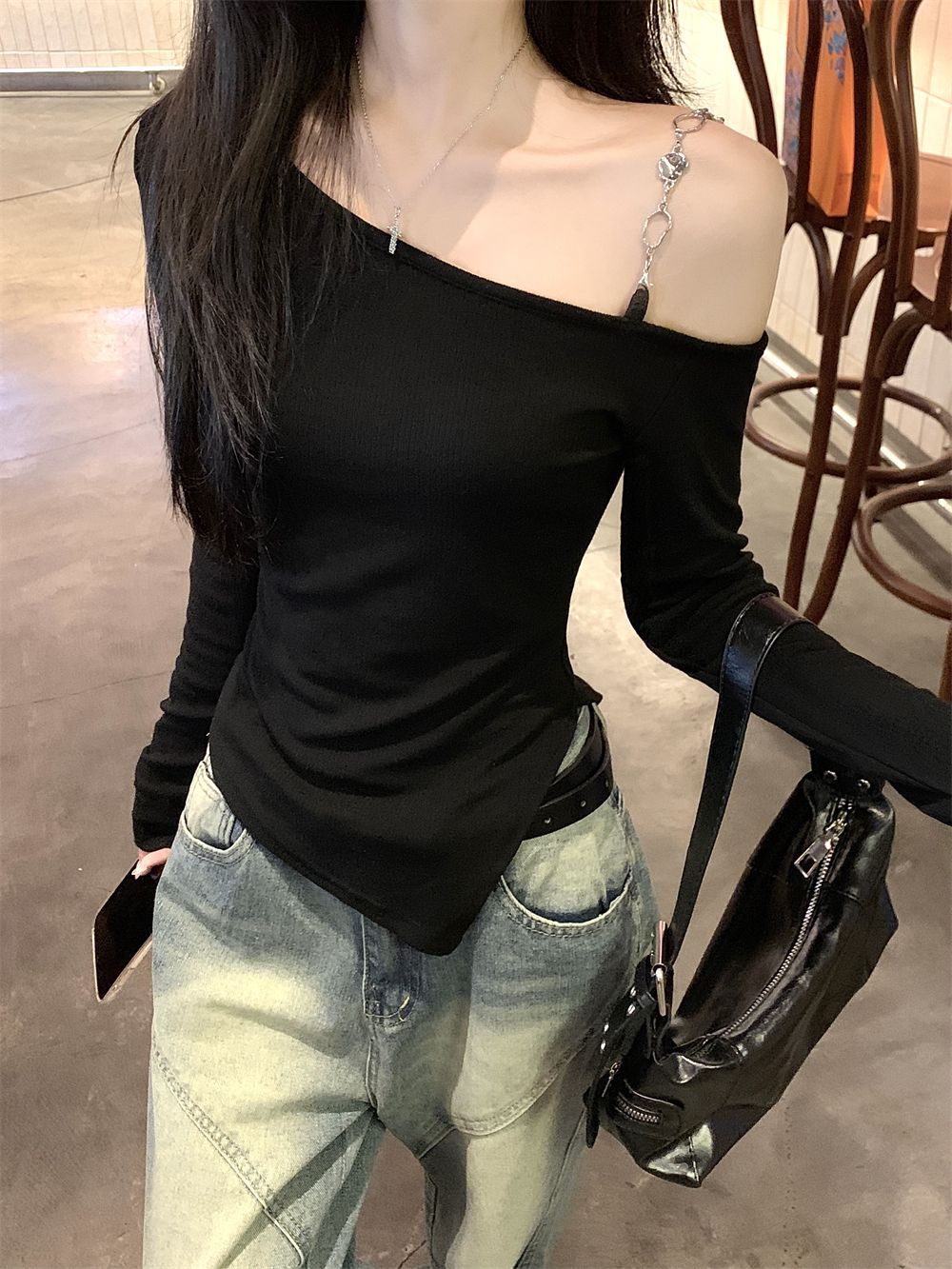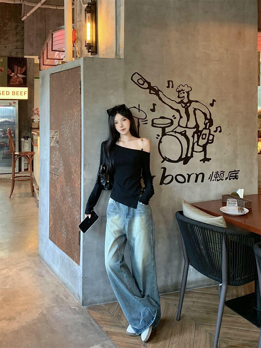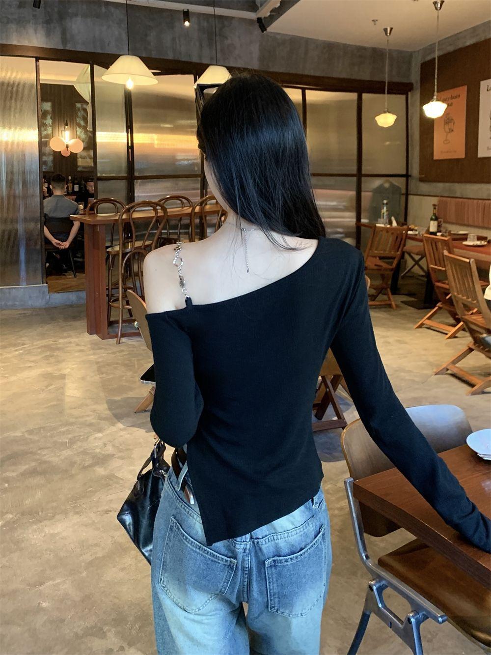 Chica Picante Sexy Camiseta de Manga Larga con Hombros Descubiertos para Mujer Diseño de Principios de Otoño Sencilla Adelgazante Color Sólido Camiseta Básica Top
