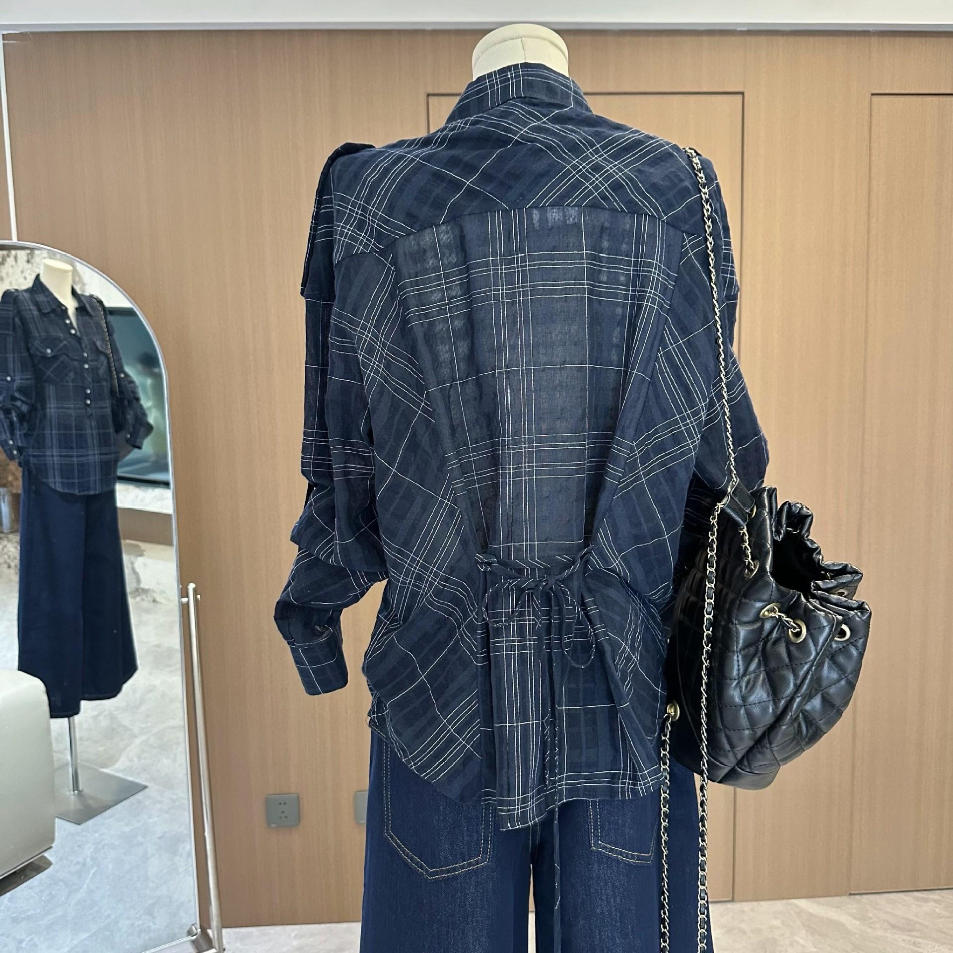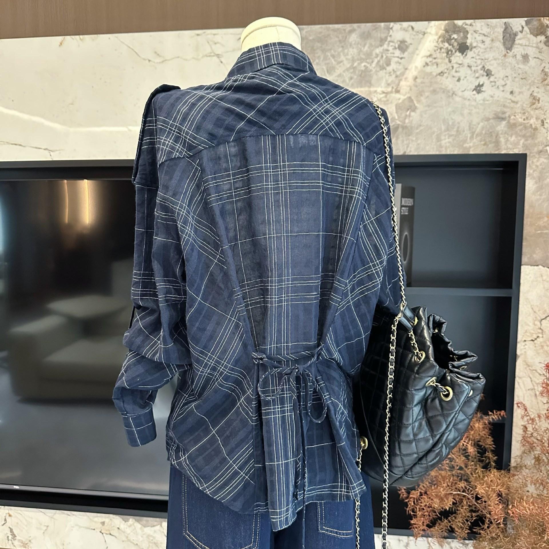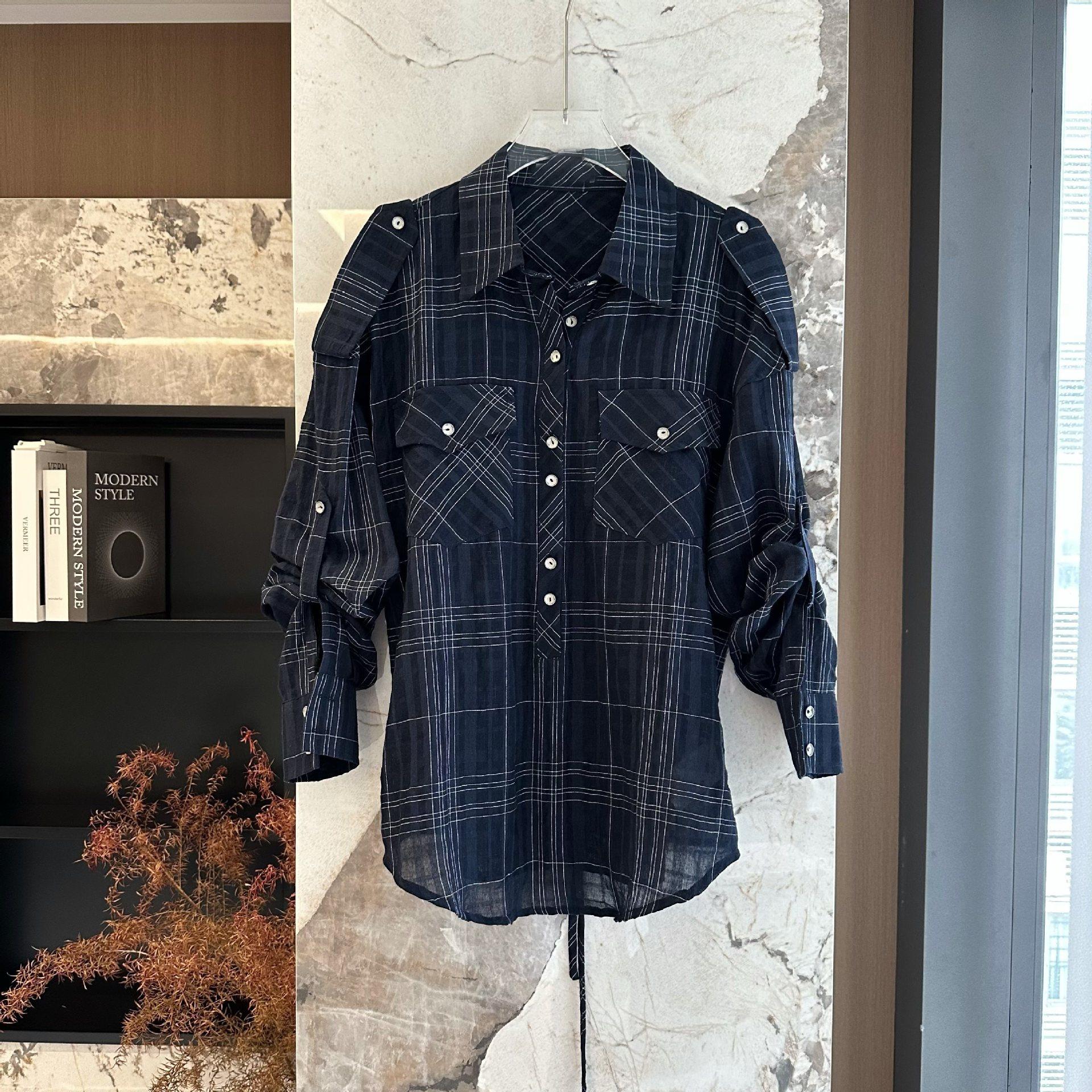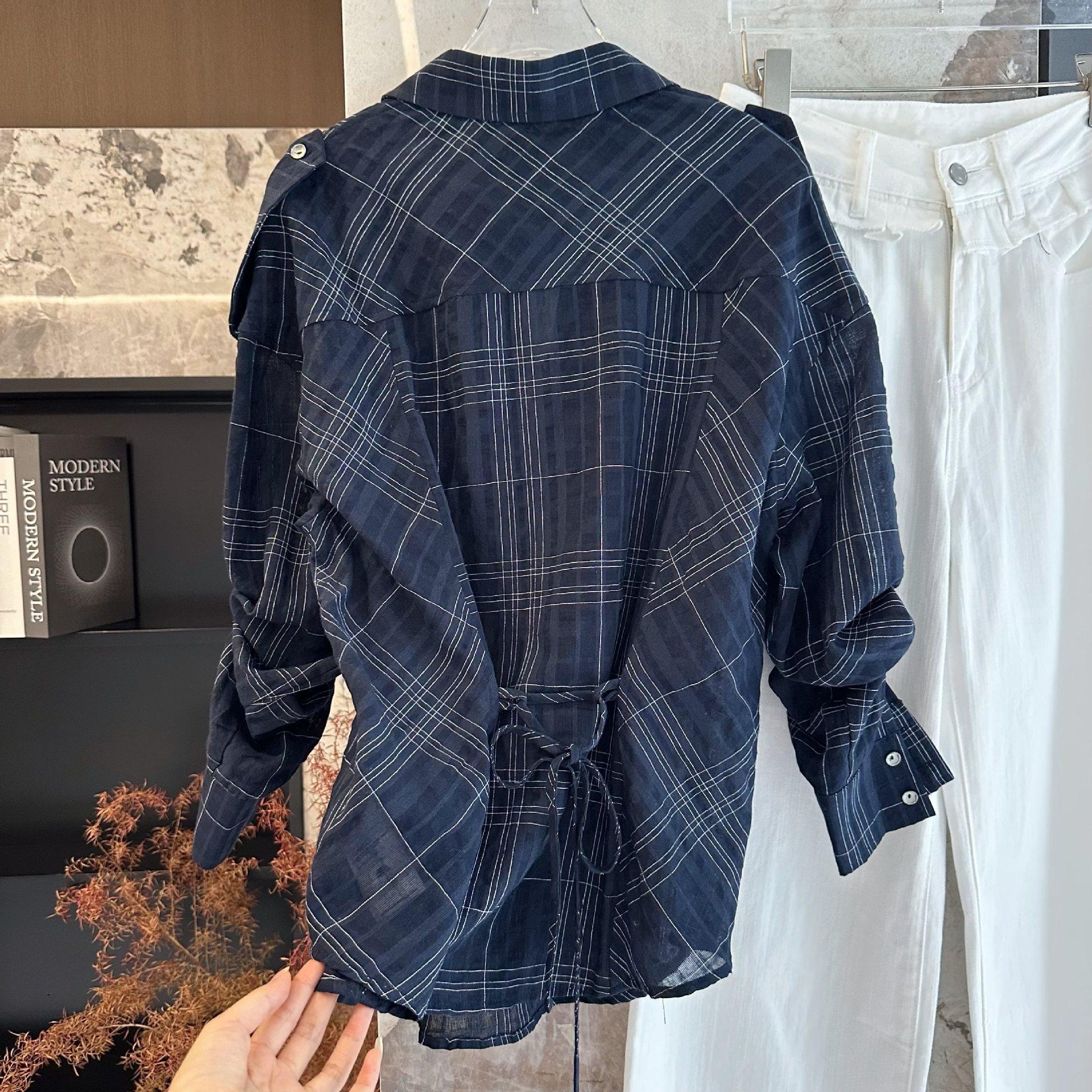 Camisa Holgada Irregular Azul Marino Texturizada a Cuadros con Pestañas Ajustables en las Mangas y Lazo en la Cintura Trasera con Hebilla Metálica