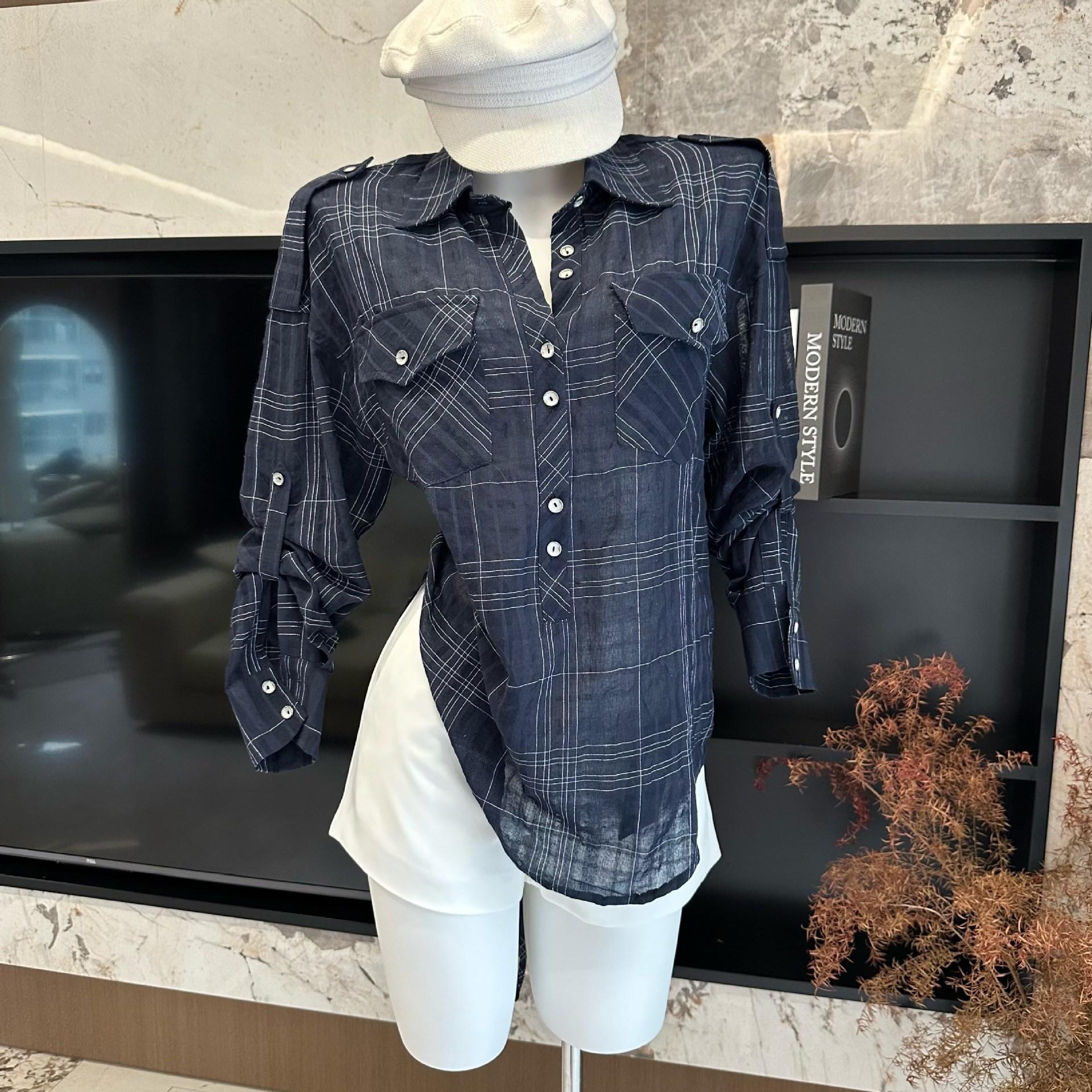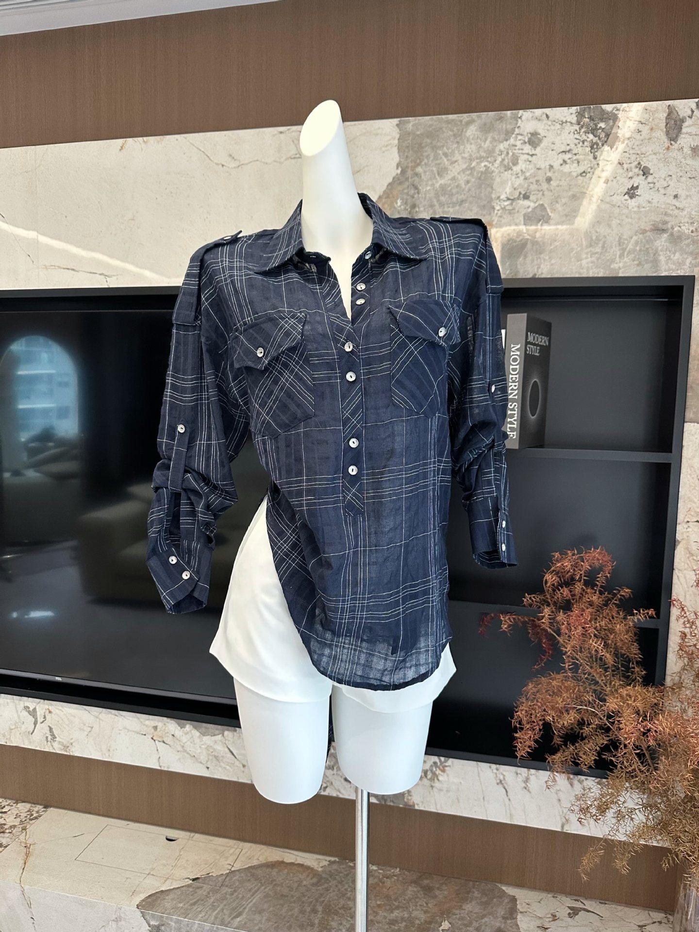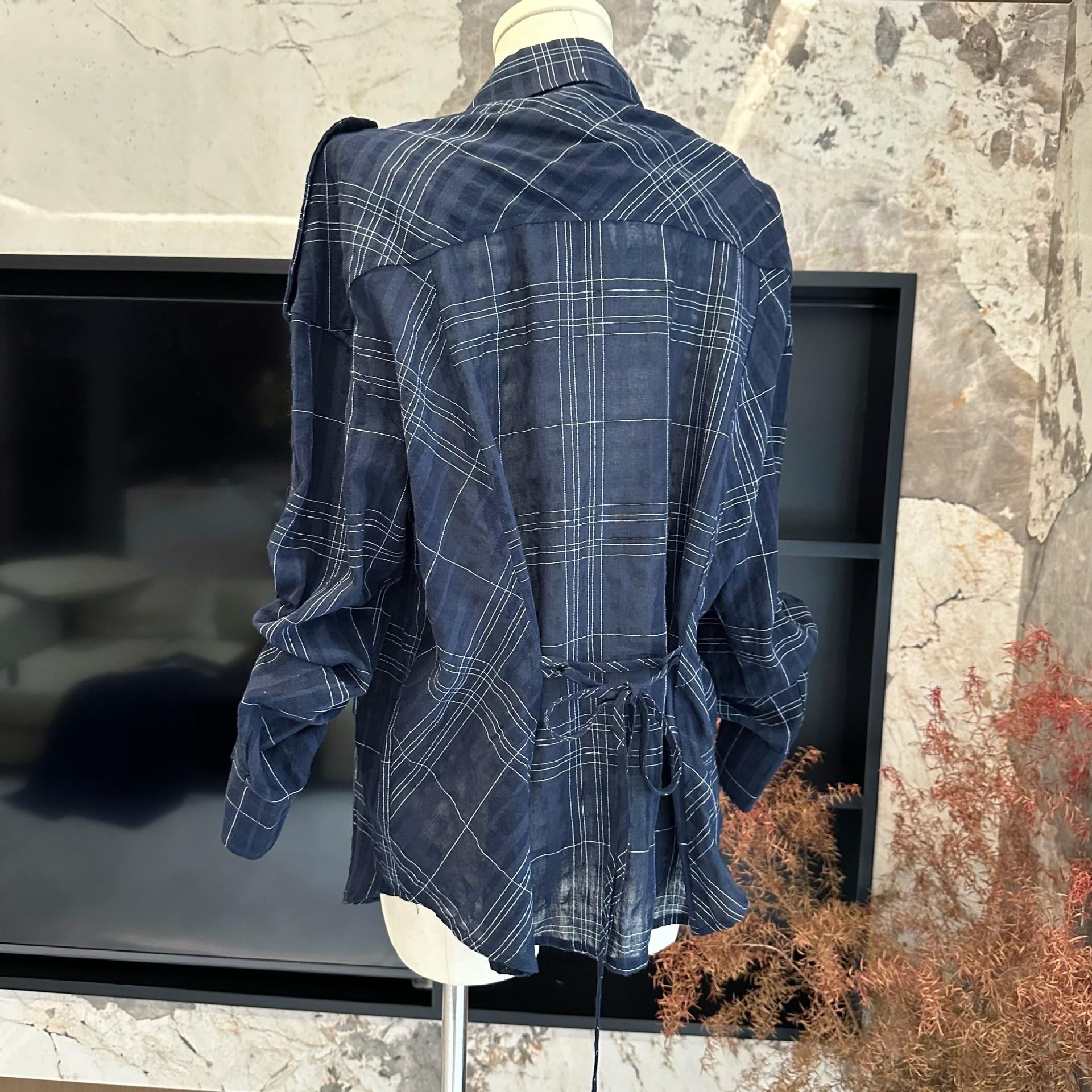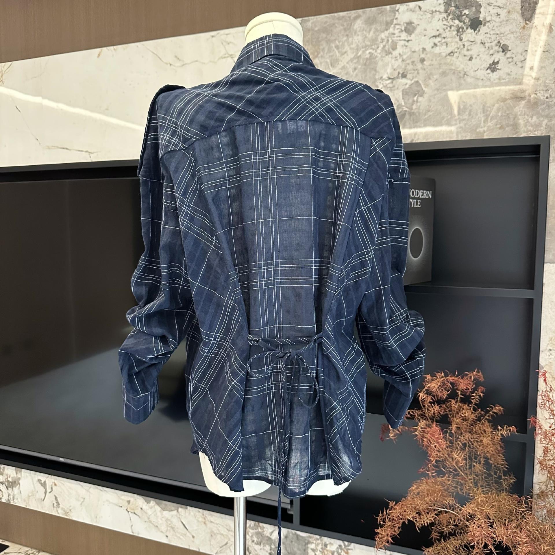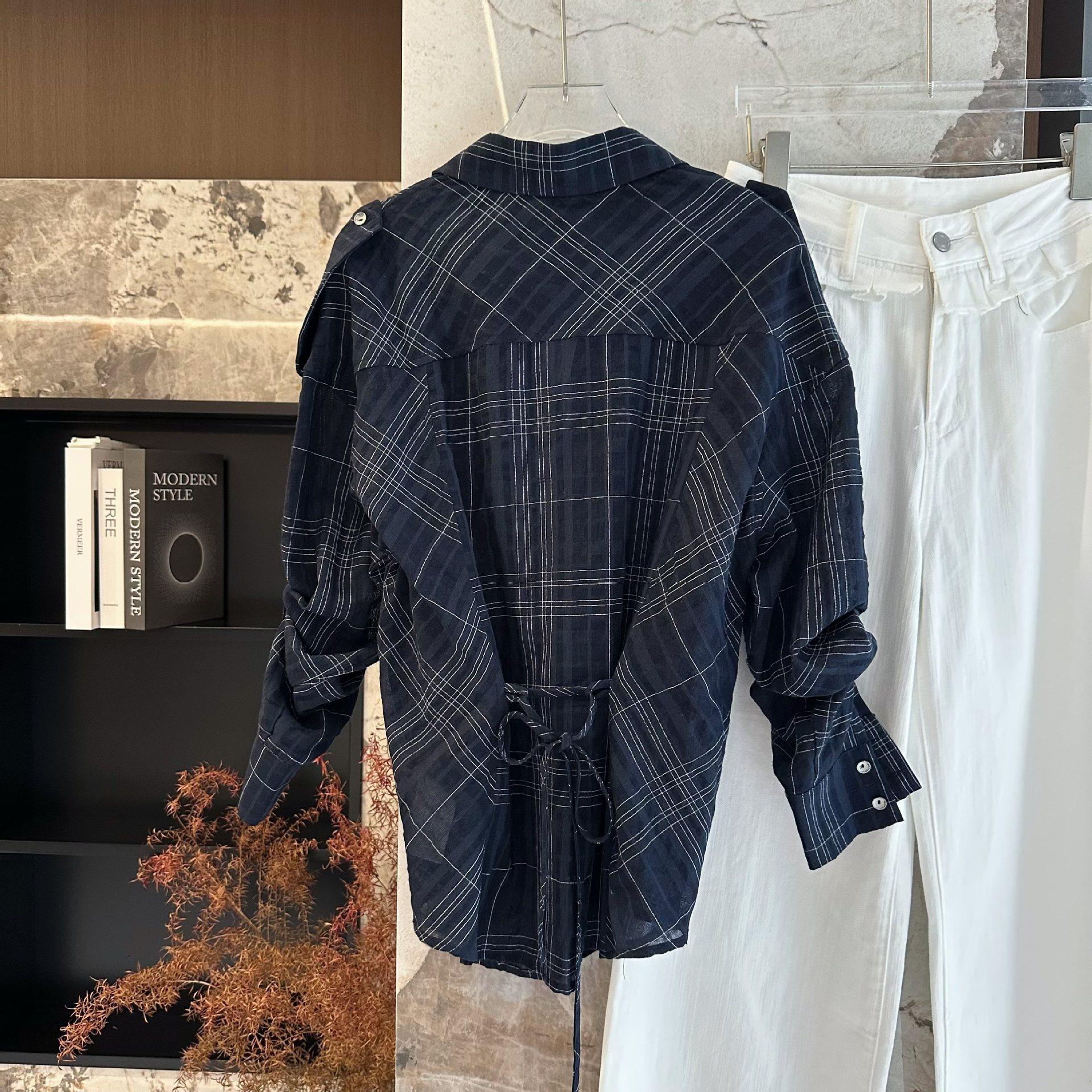 Camisa Holgada Irregular Azul Marino Texturizada a Cuadros con Pestañas Ajustables en las Mangas y Lazo en la Cintura Trasera con Hebilla Metálica