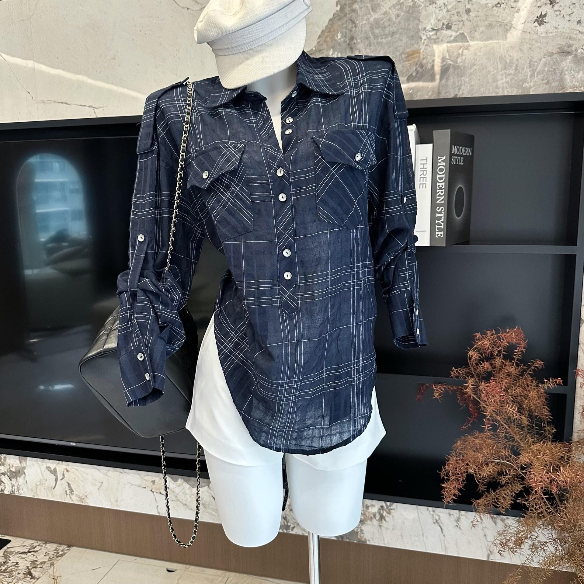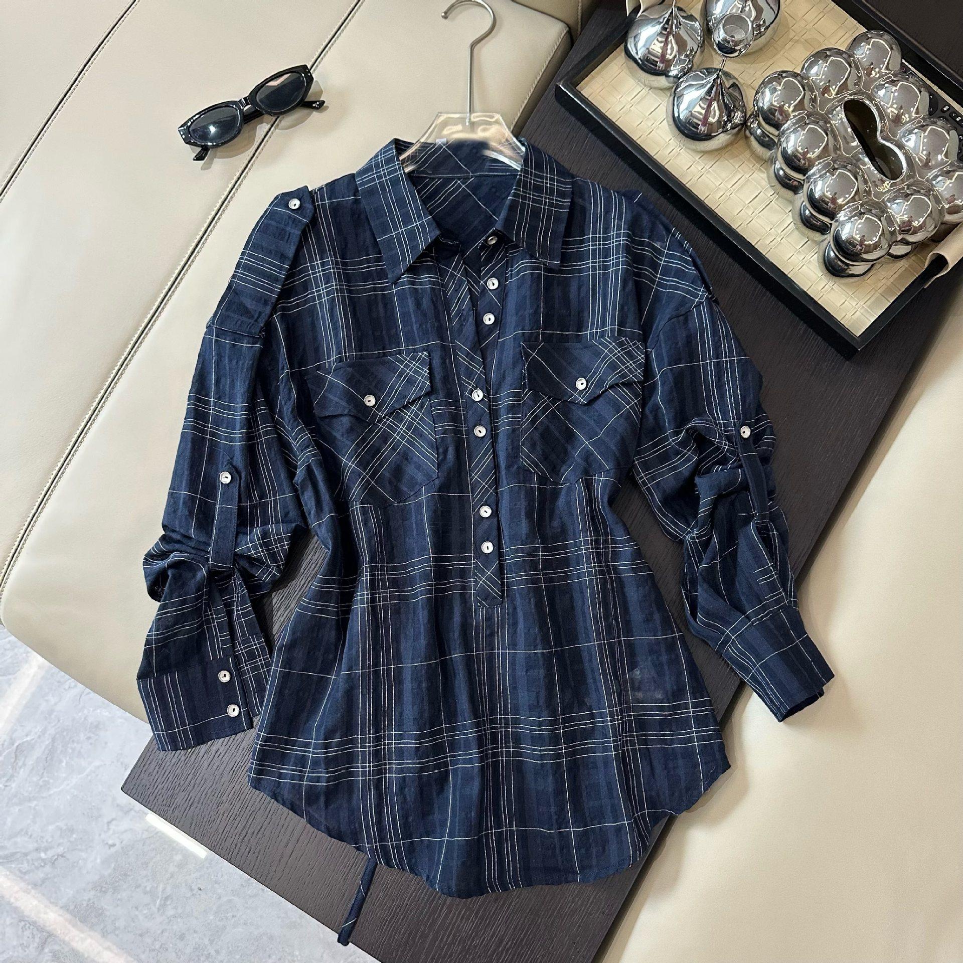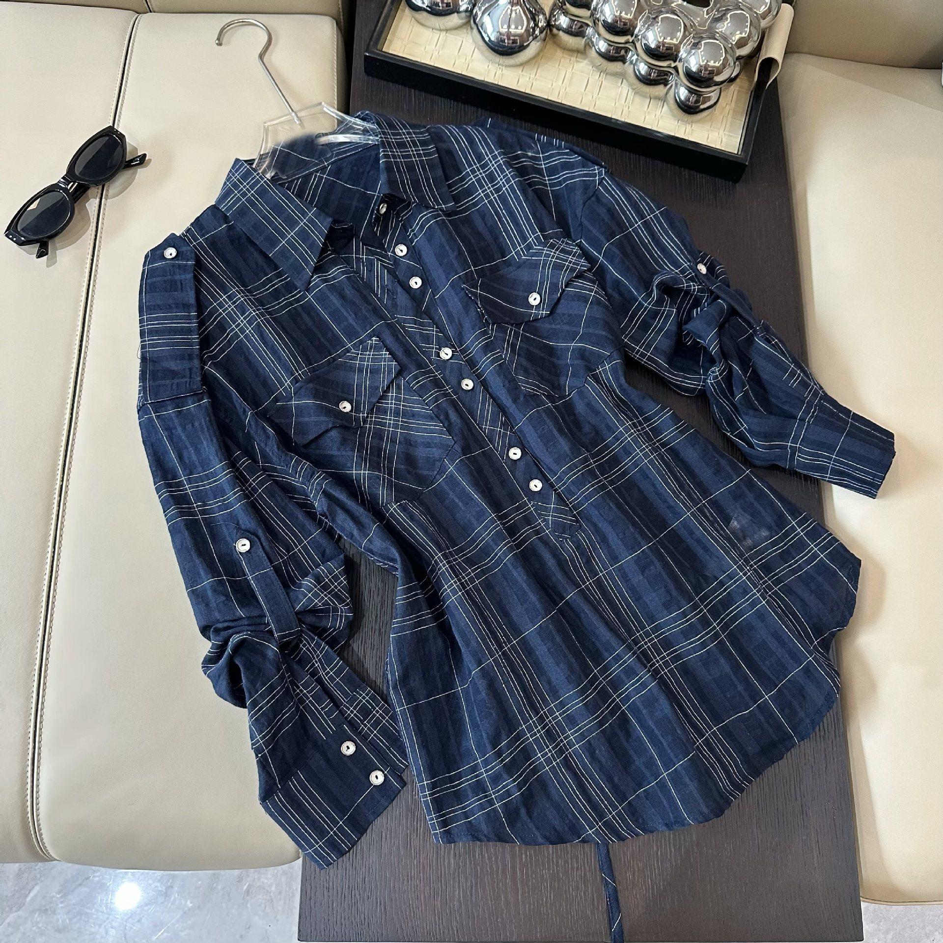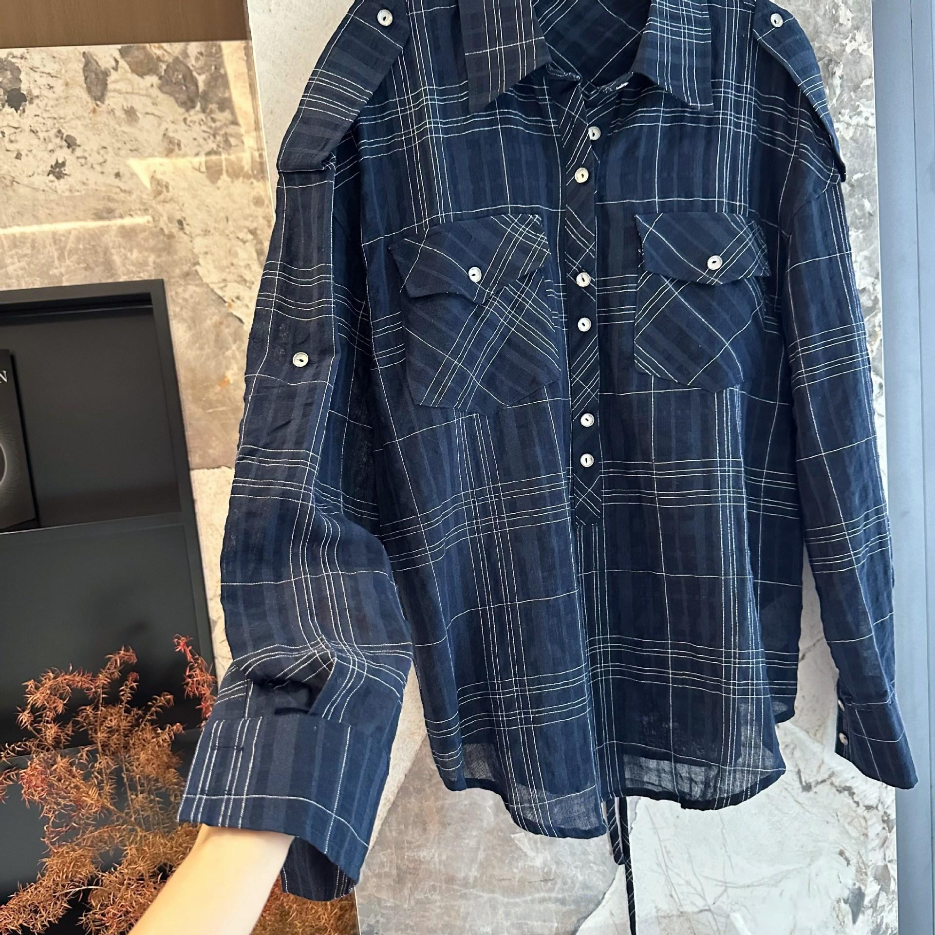 Camisa Holgada Irregular Azul Marino Texturizada a Cuadros con Pestañas Ajustables en las Mangas y Lazo en la Cintura Trasera con Hebilla Metálica