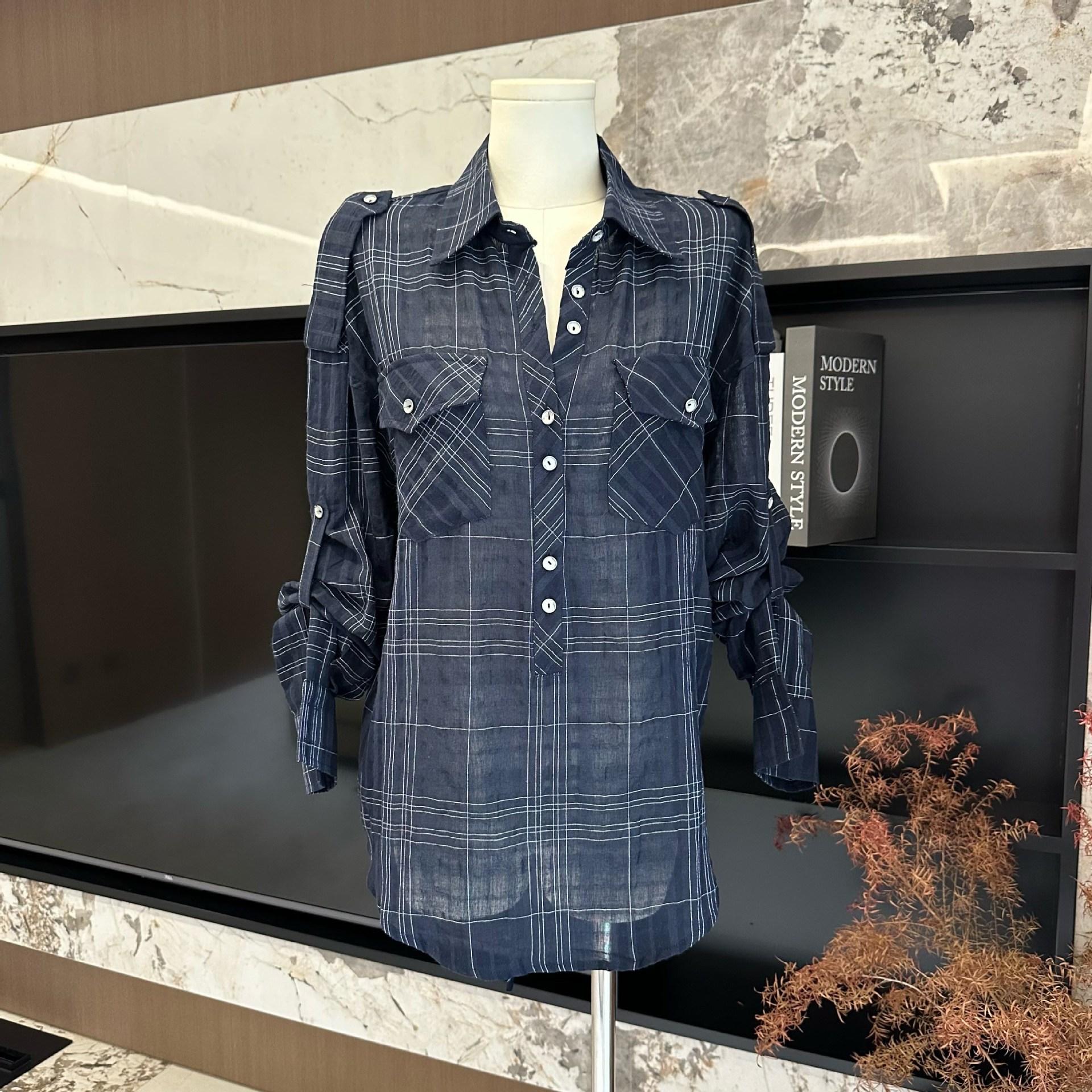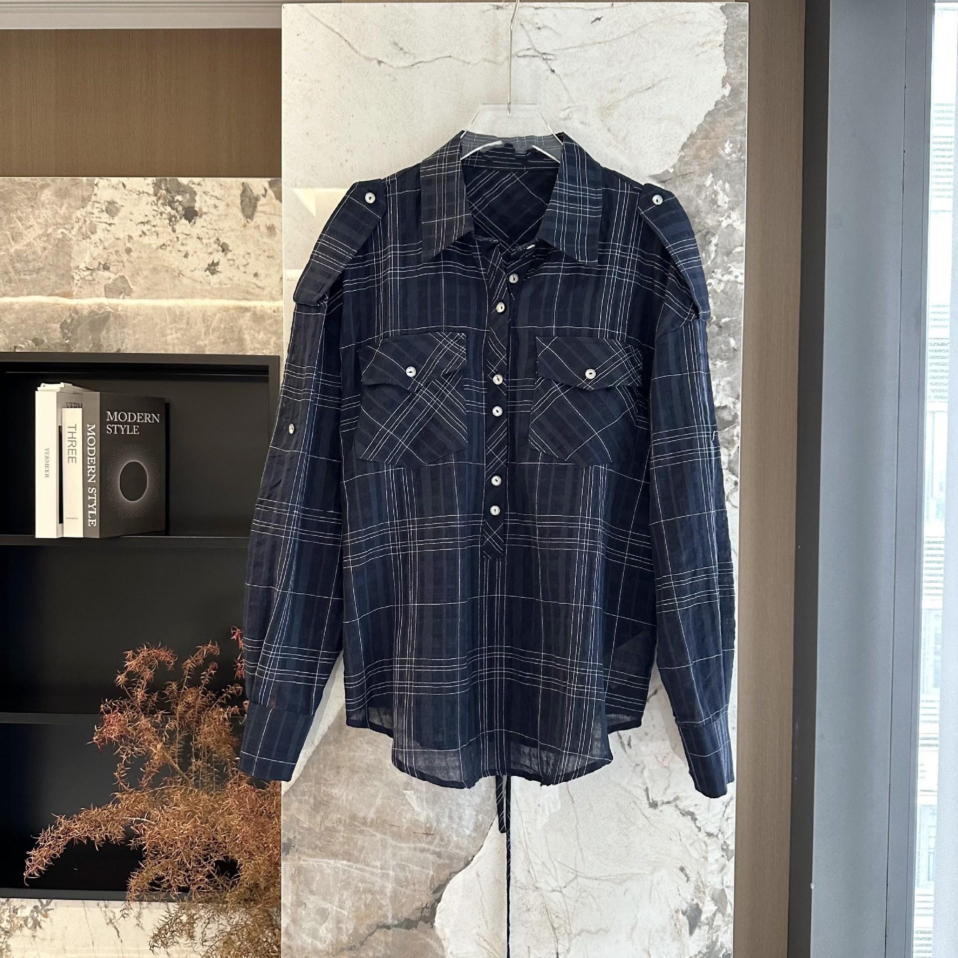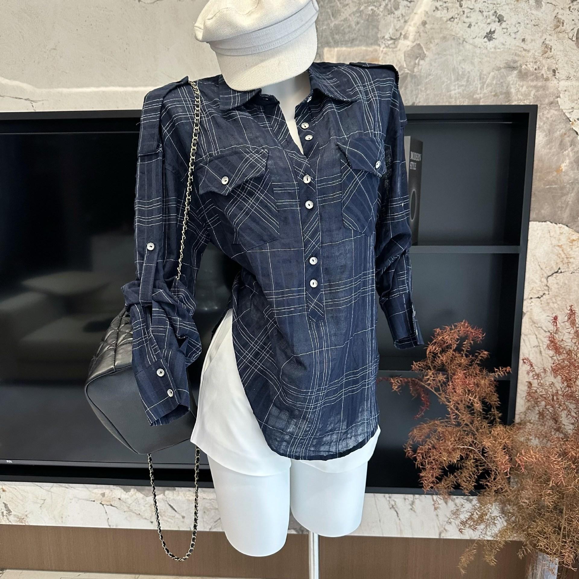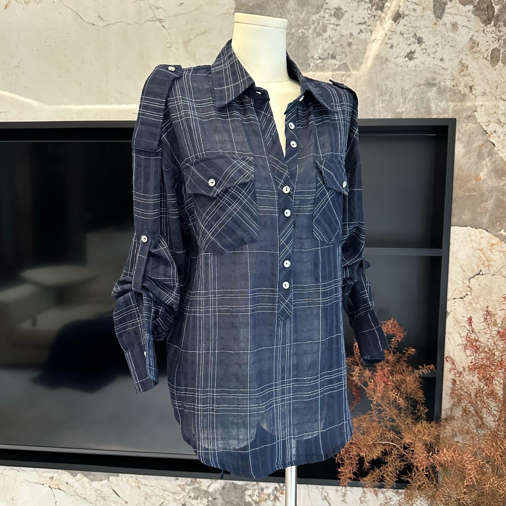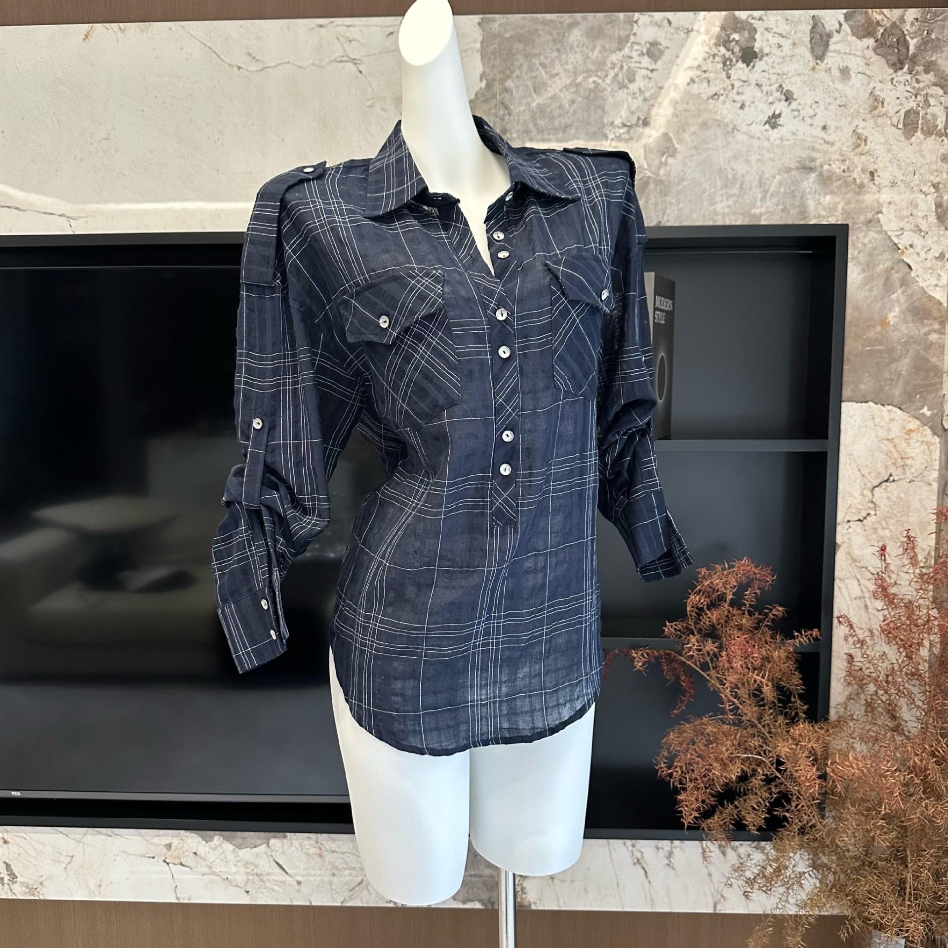 Camisa Holgada Irregular Azul Marino Texturizada a Cuadros con Pestañas Ajustables en las Mangas y Lazo en la Cintura Trasera con Hebilla Metálica
