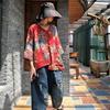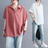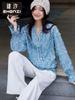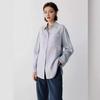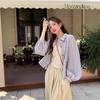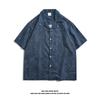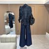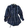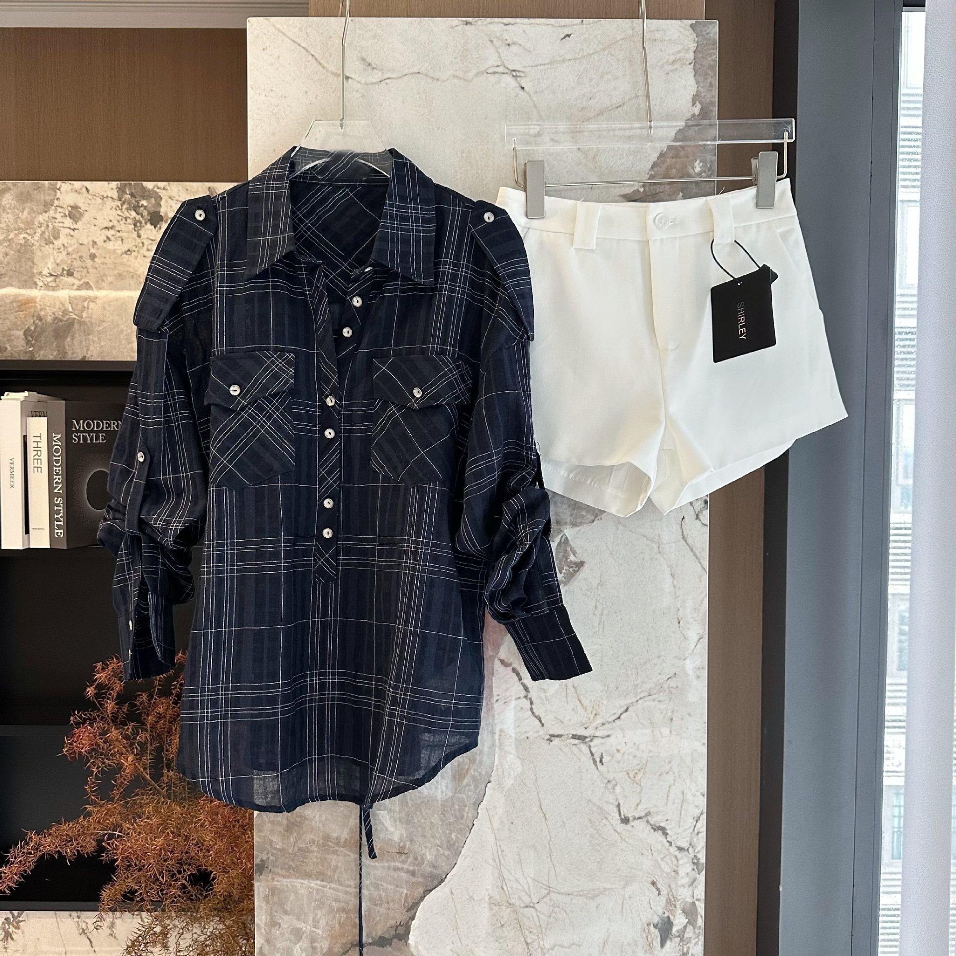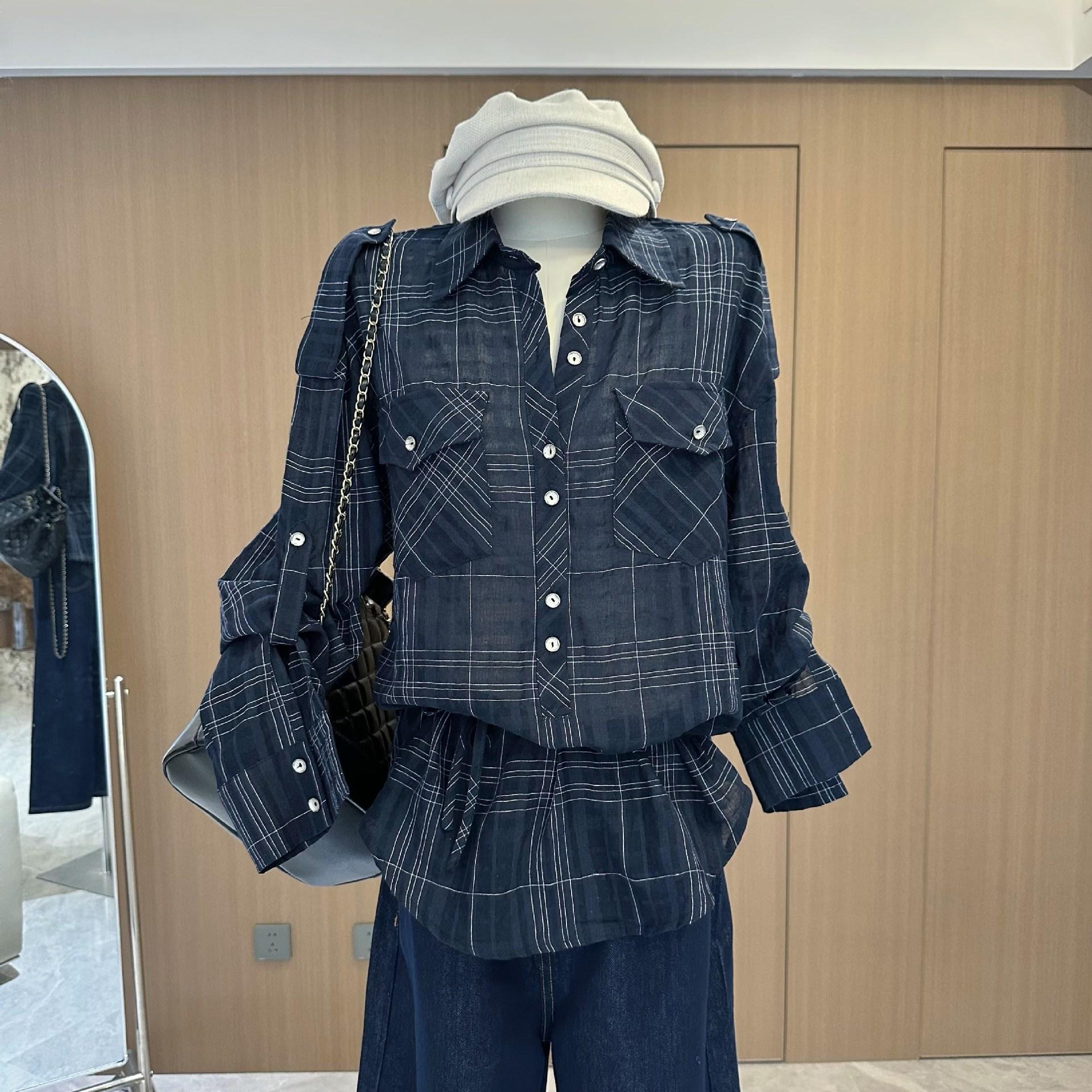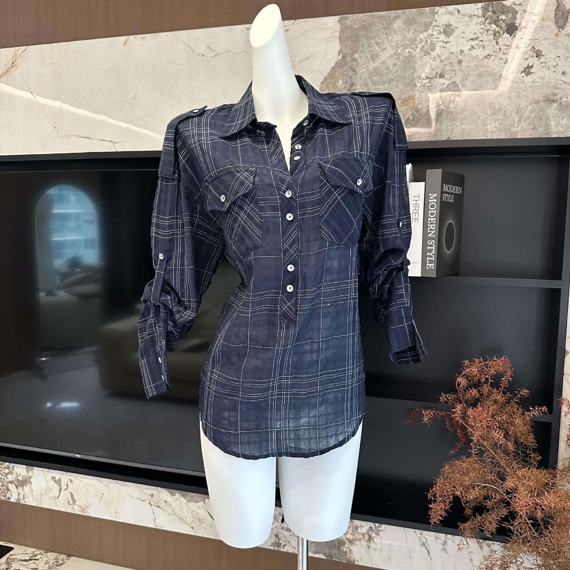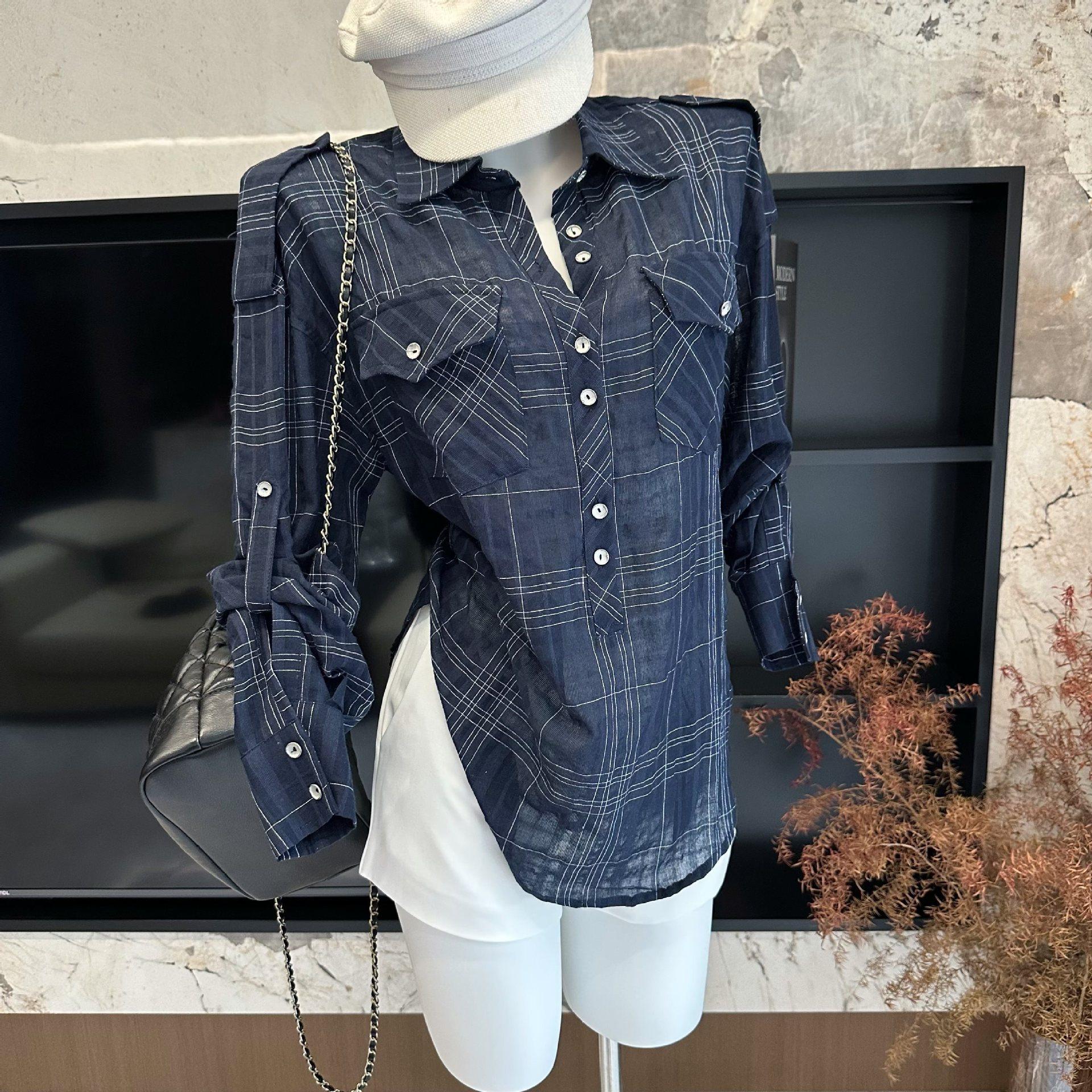 Camisa Holgada Irregular Azul Marino Texturizada a Cuadros con Pestañas Ajustables en las Mangas y Lazo en la Cintura Trasera con Hebilla Metálica