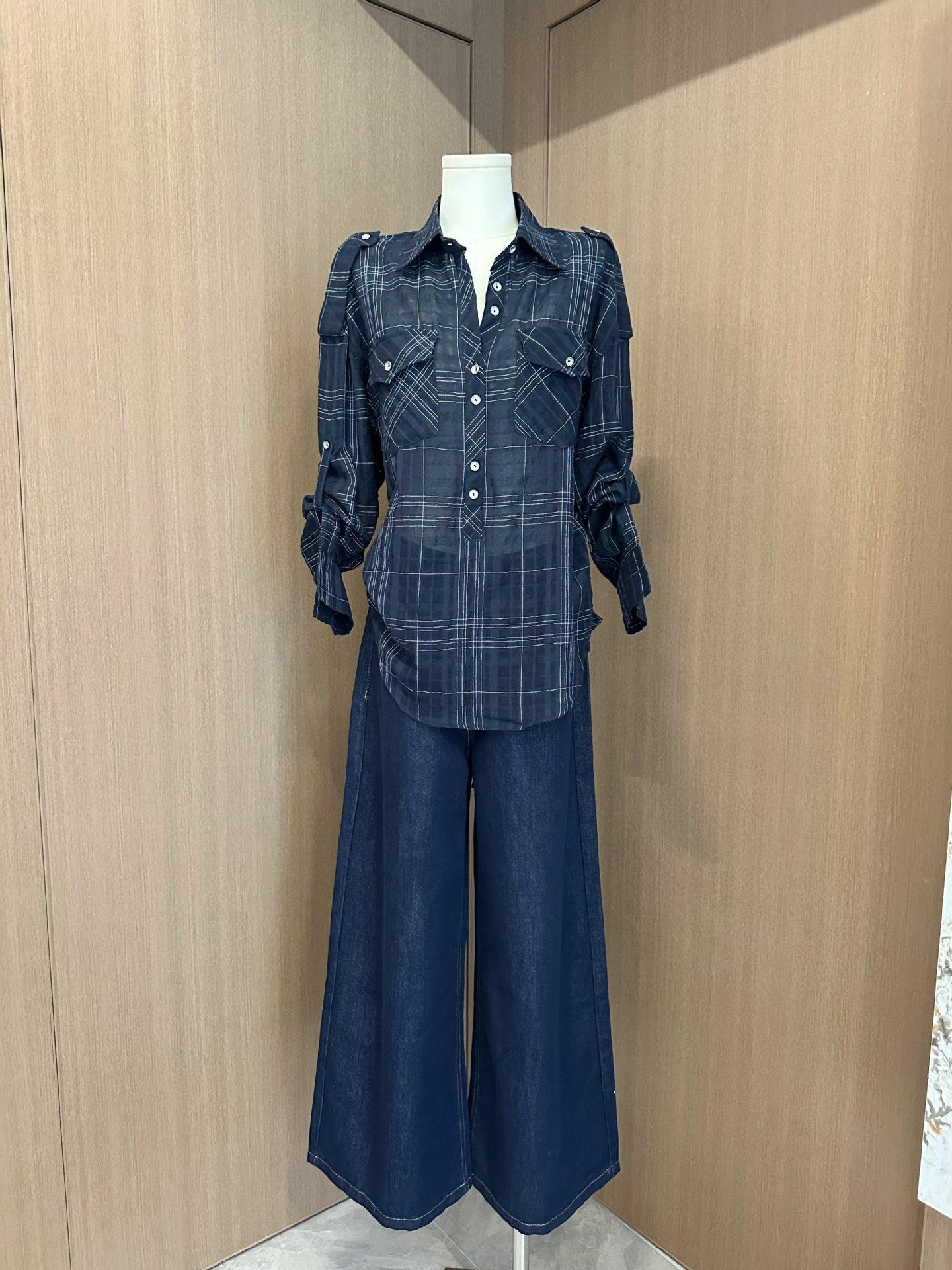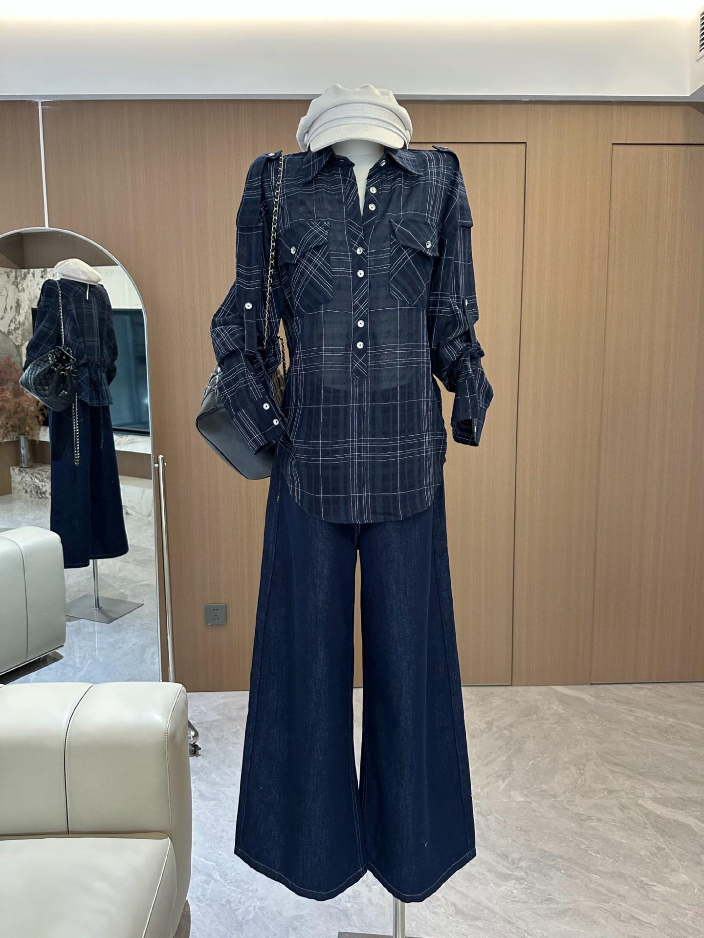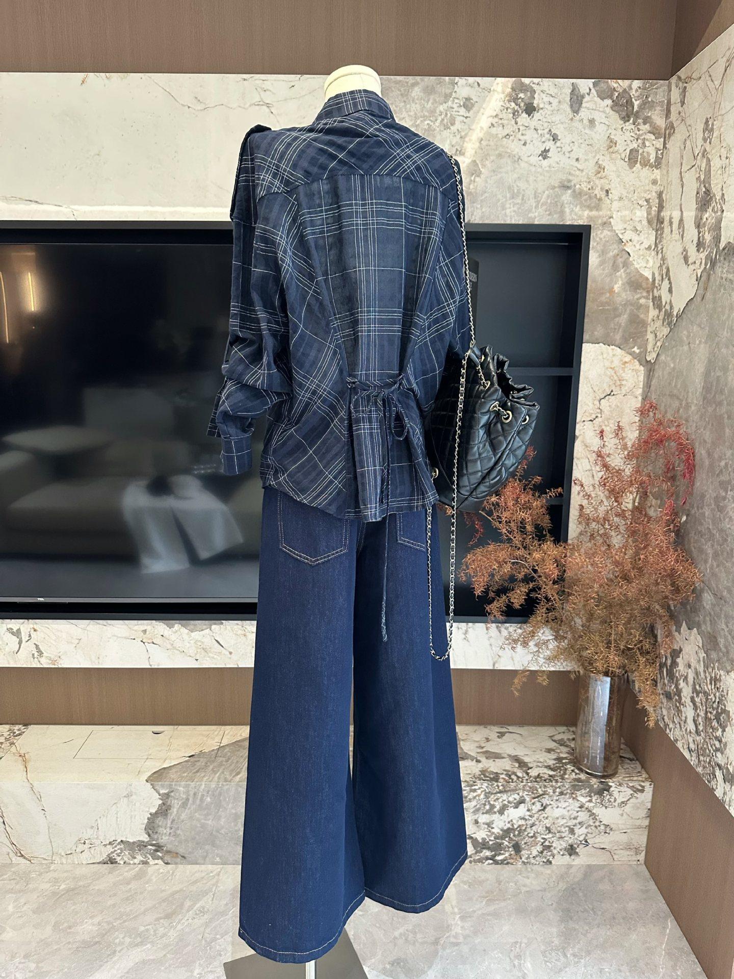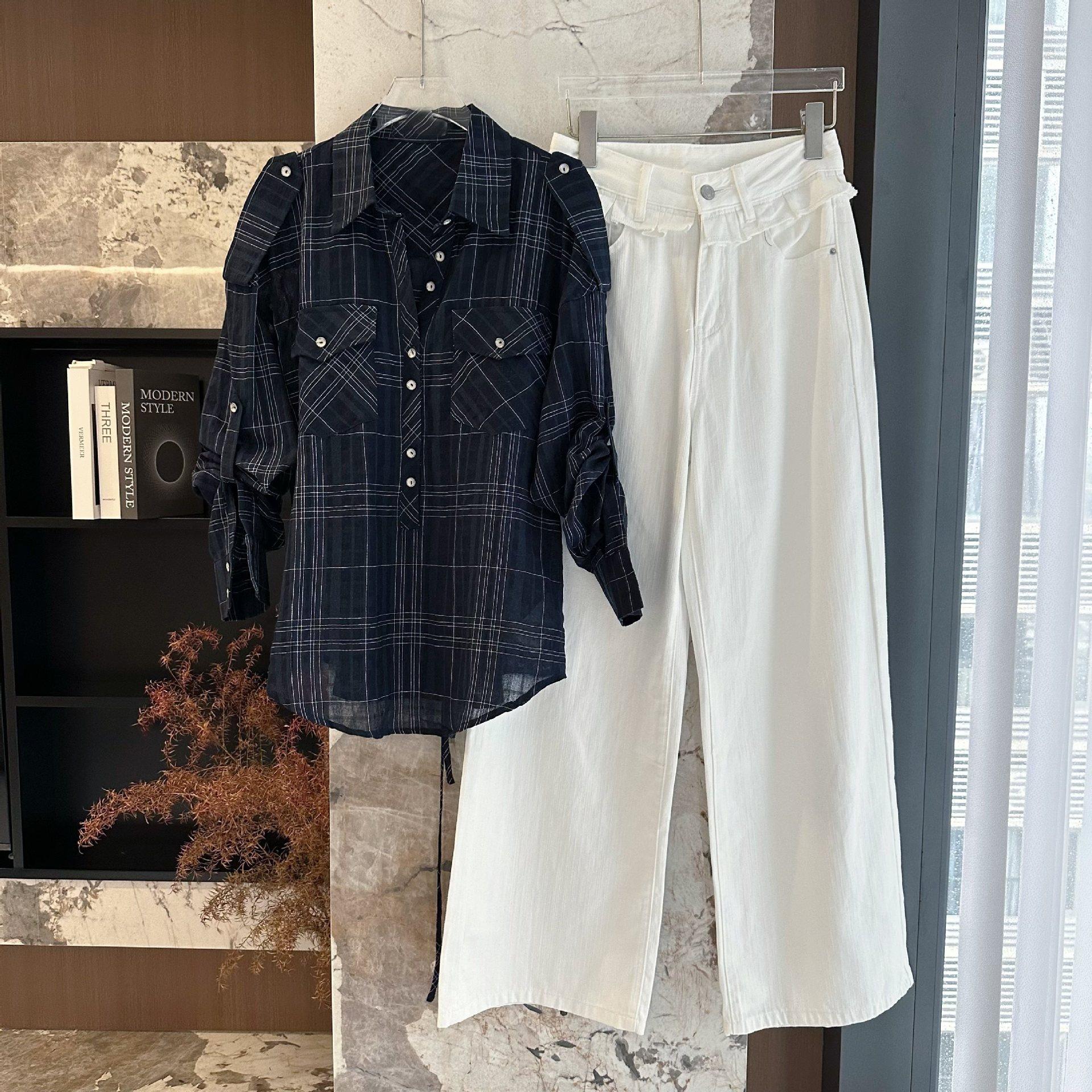 Navy blue plaid shirt, Denim wide-leg jeans, White jeans