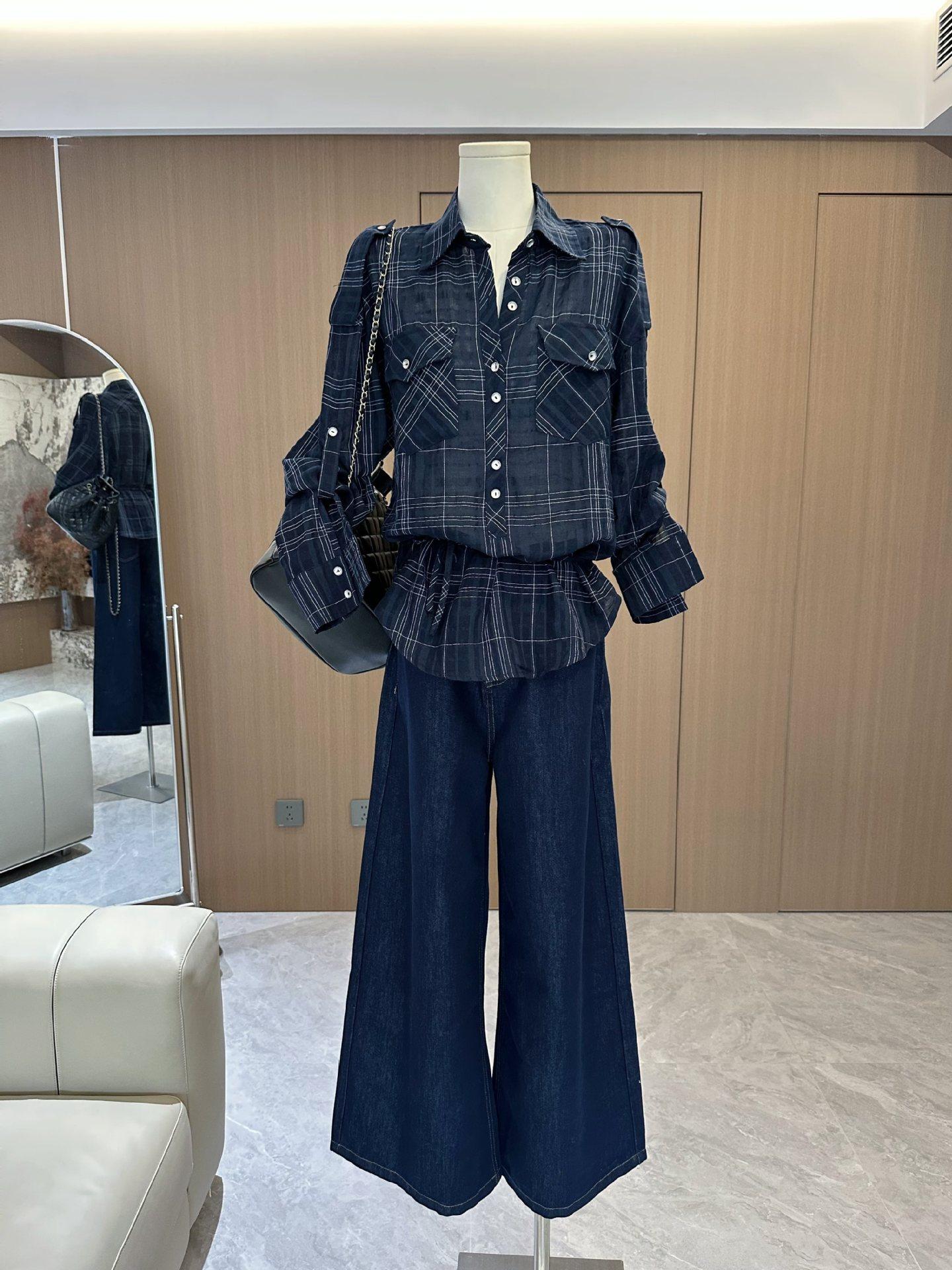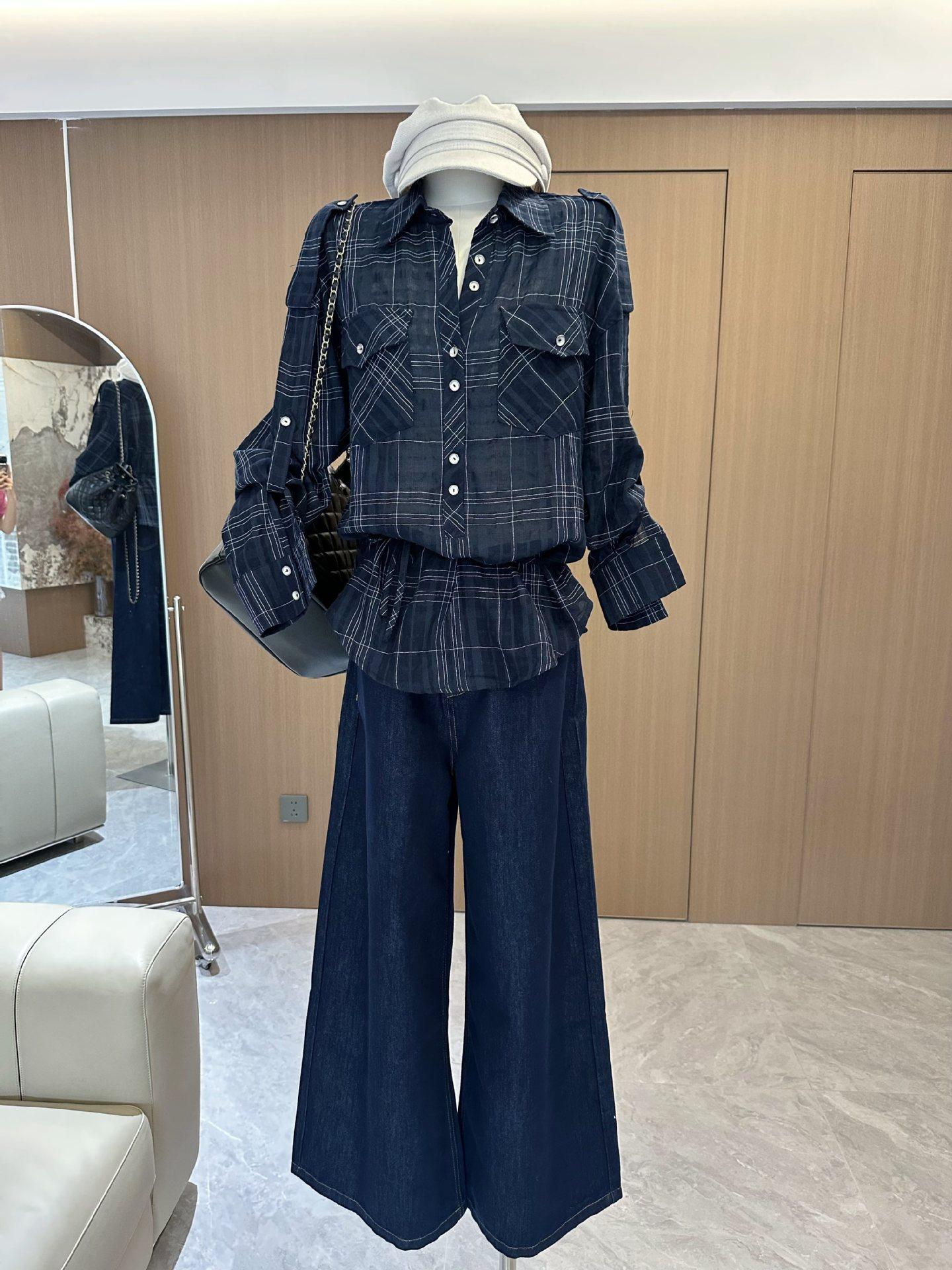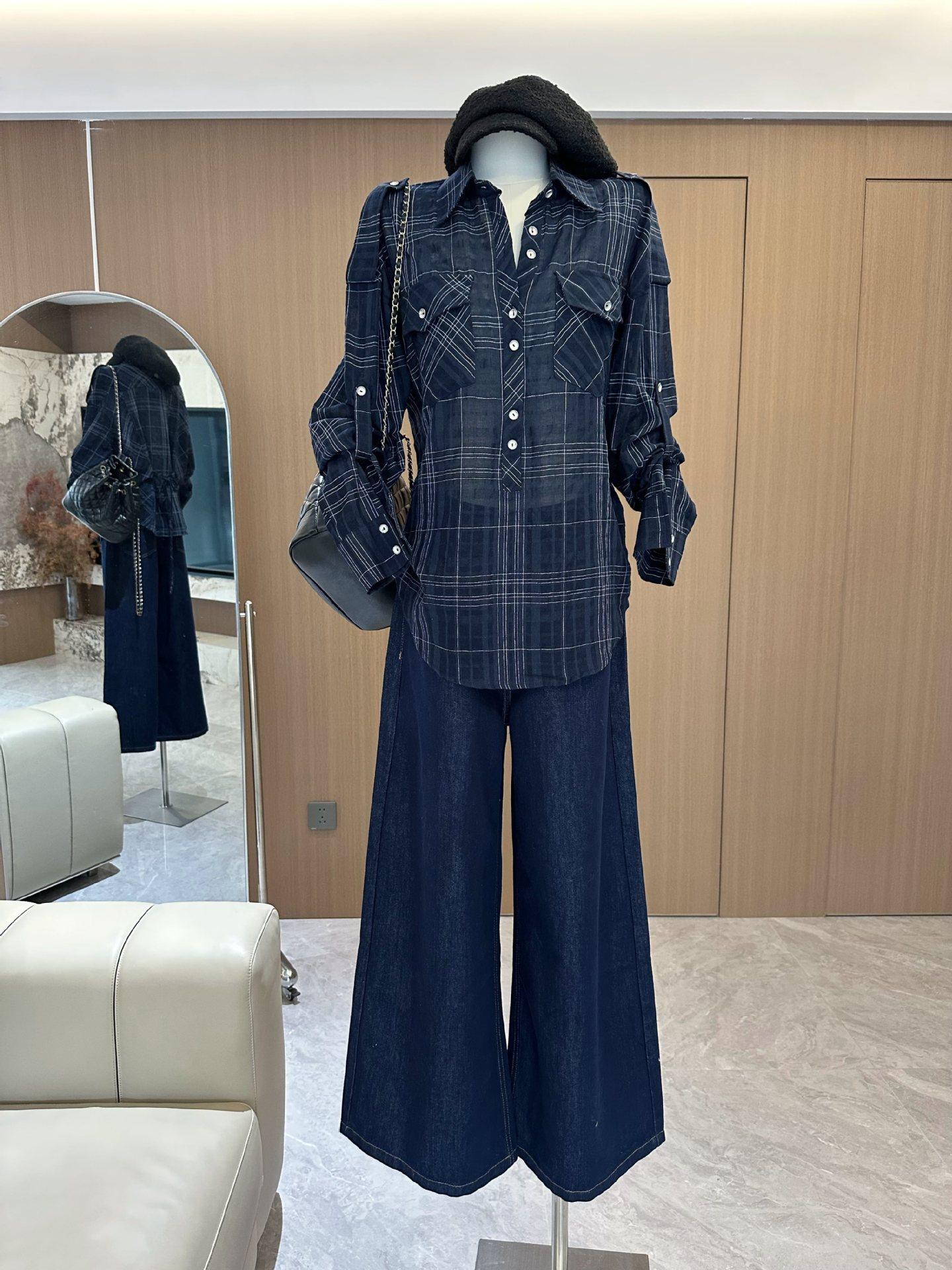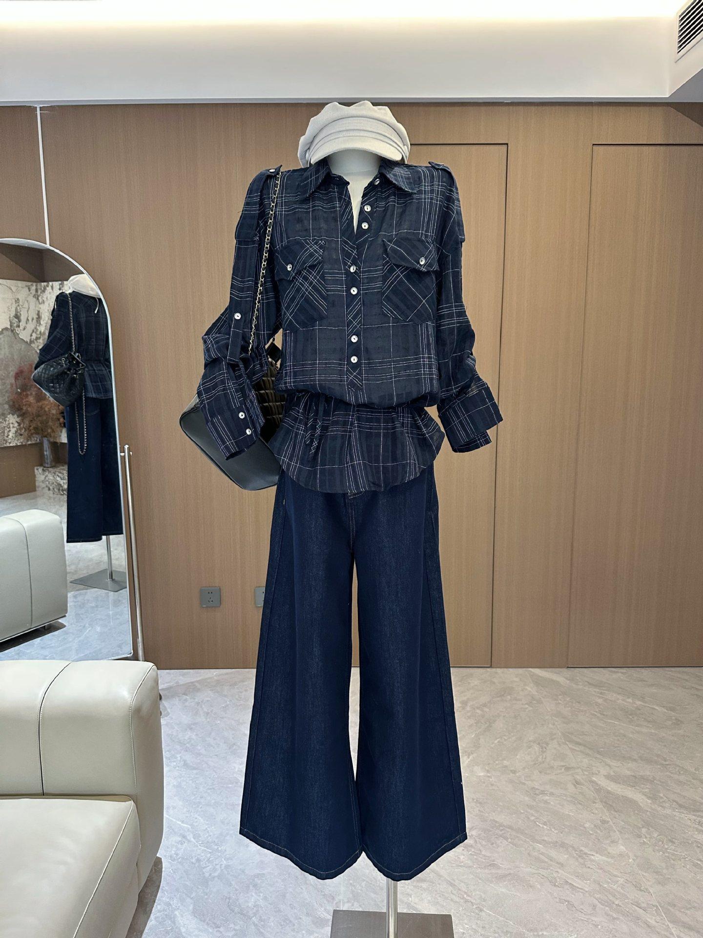 Navy blue plaid shirt, Denim wide-leg jeans, White jeans