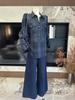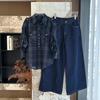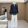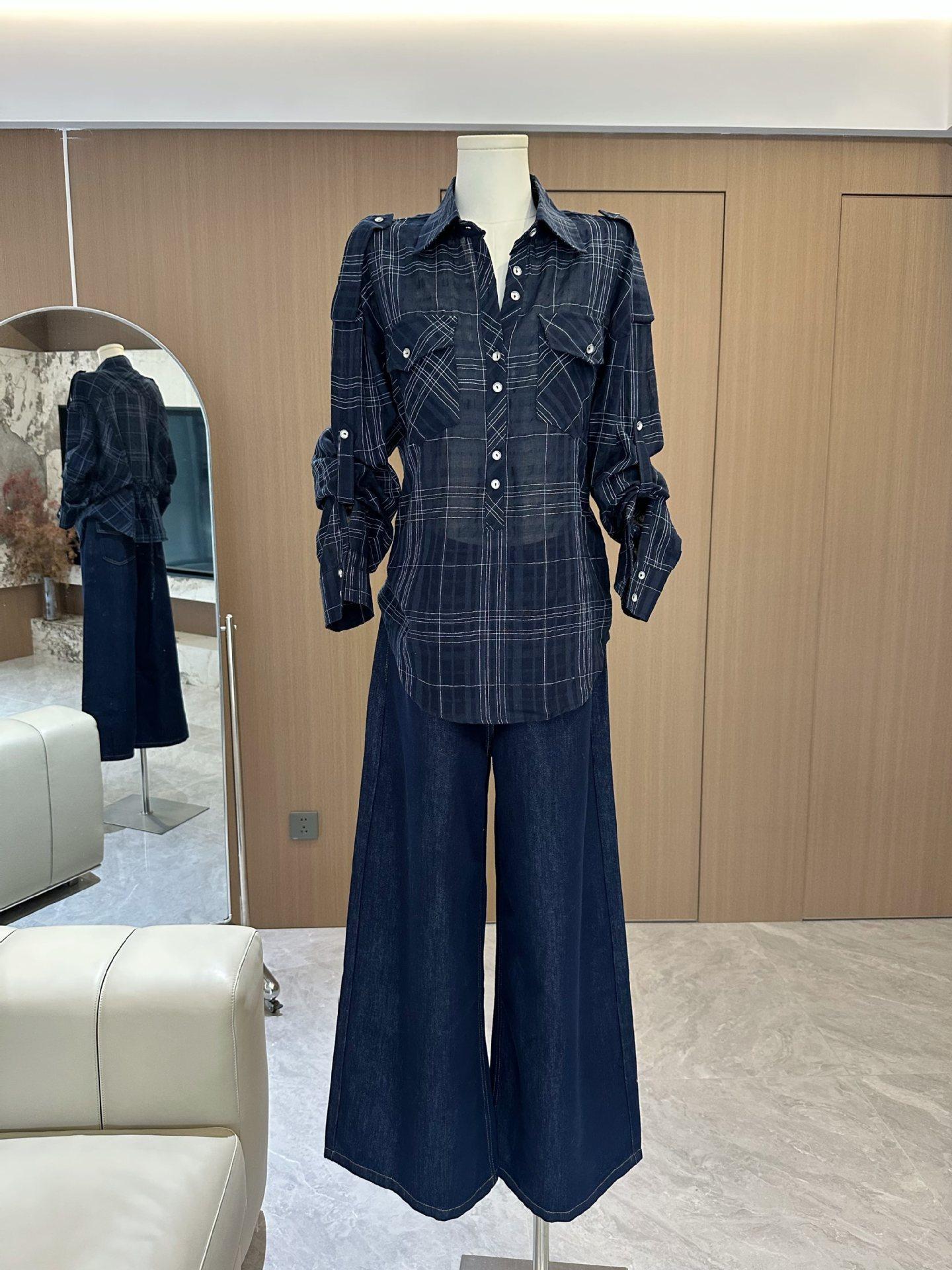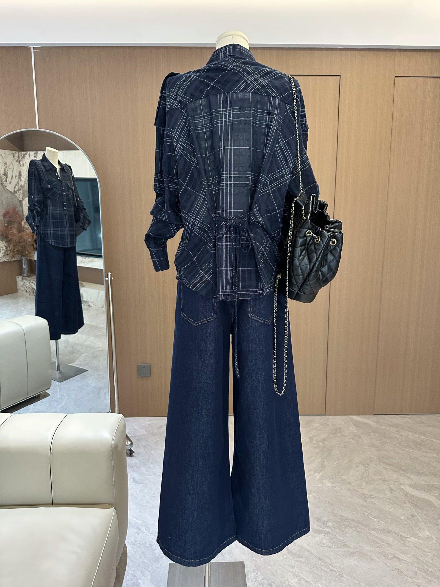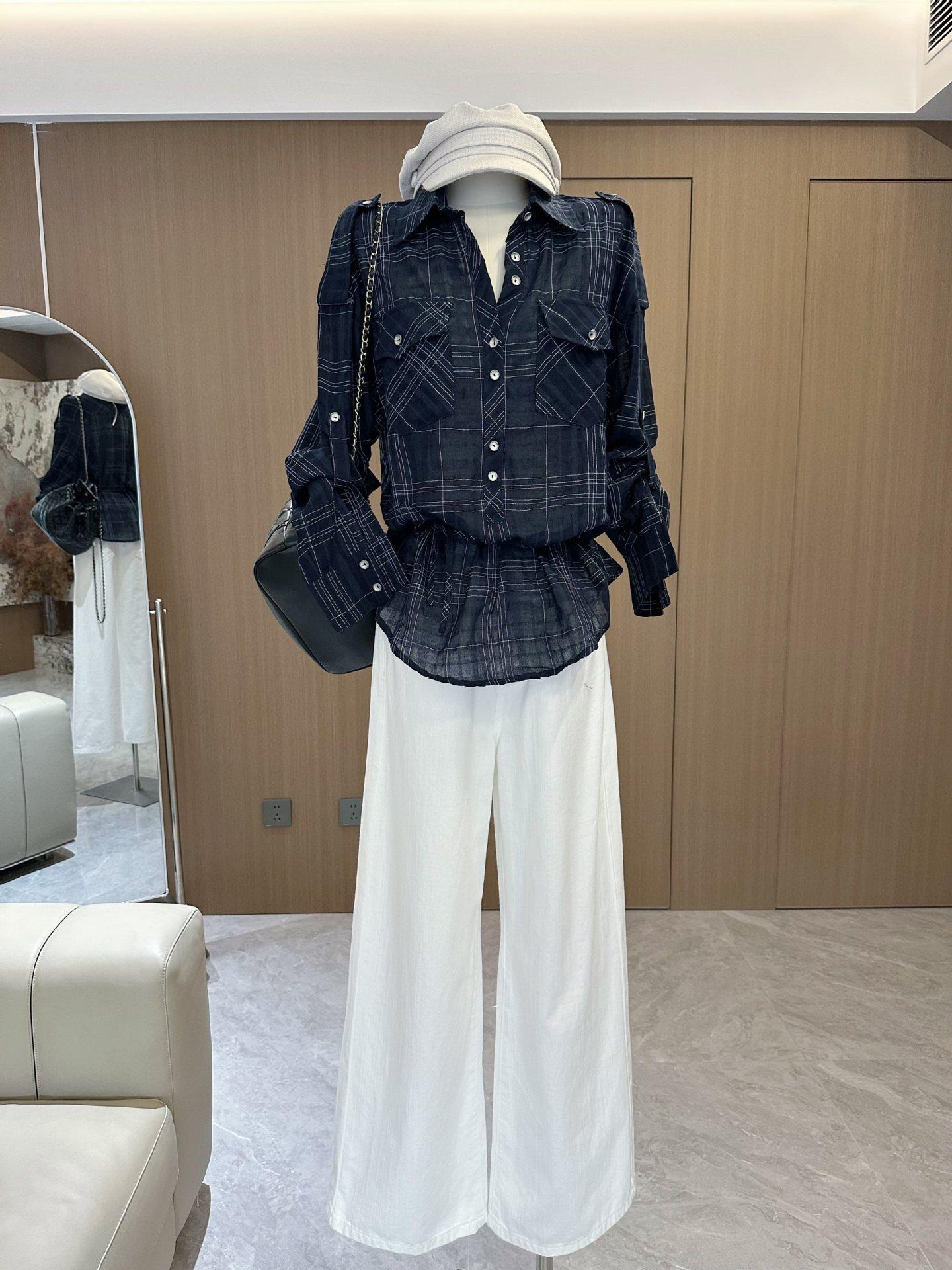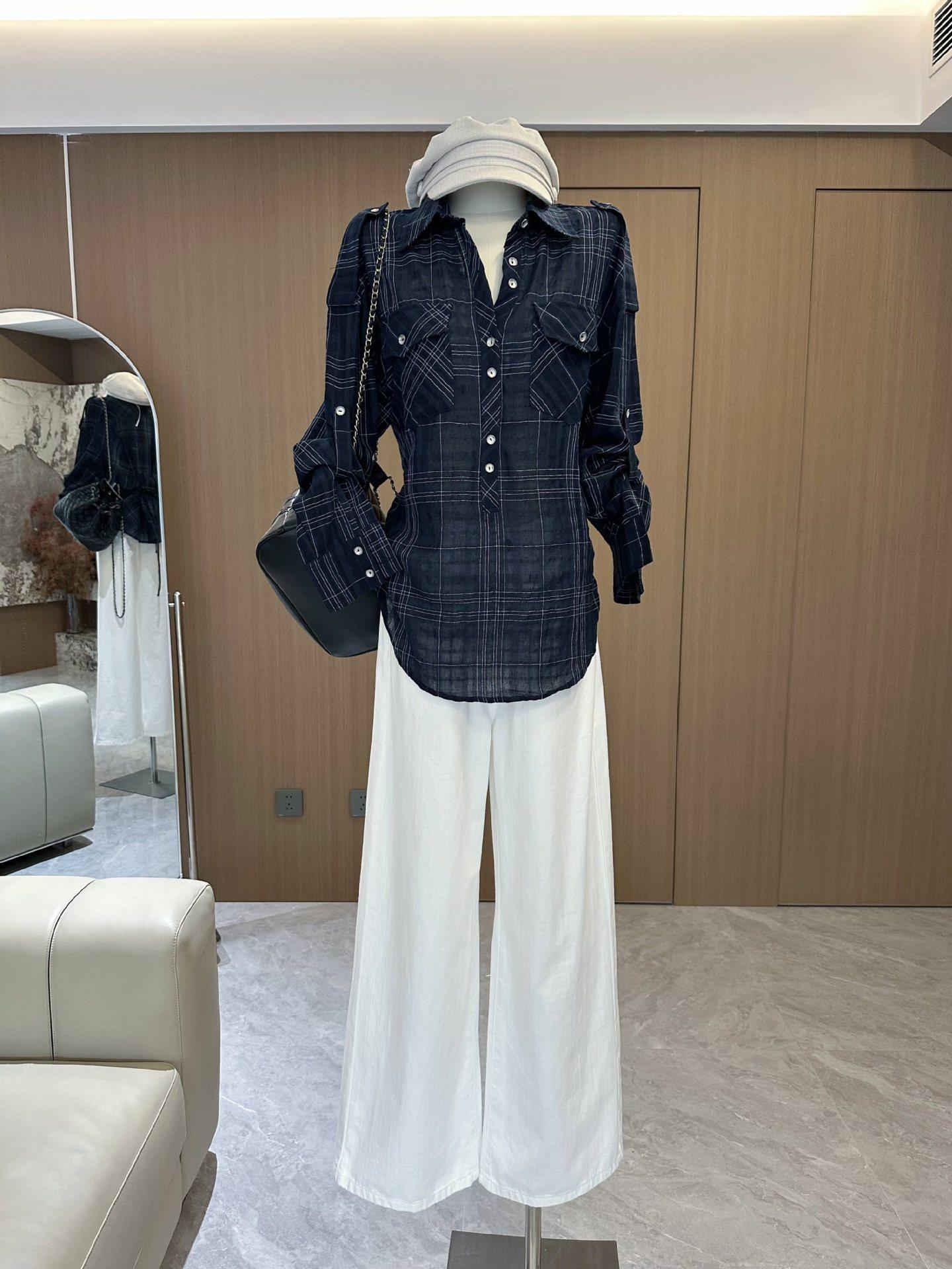 Navy blue plaid shirt, Denim wide-leg jeans, White jeans