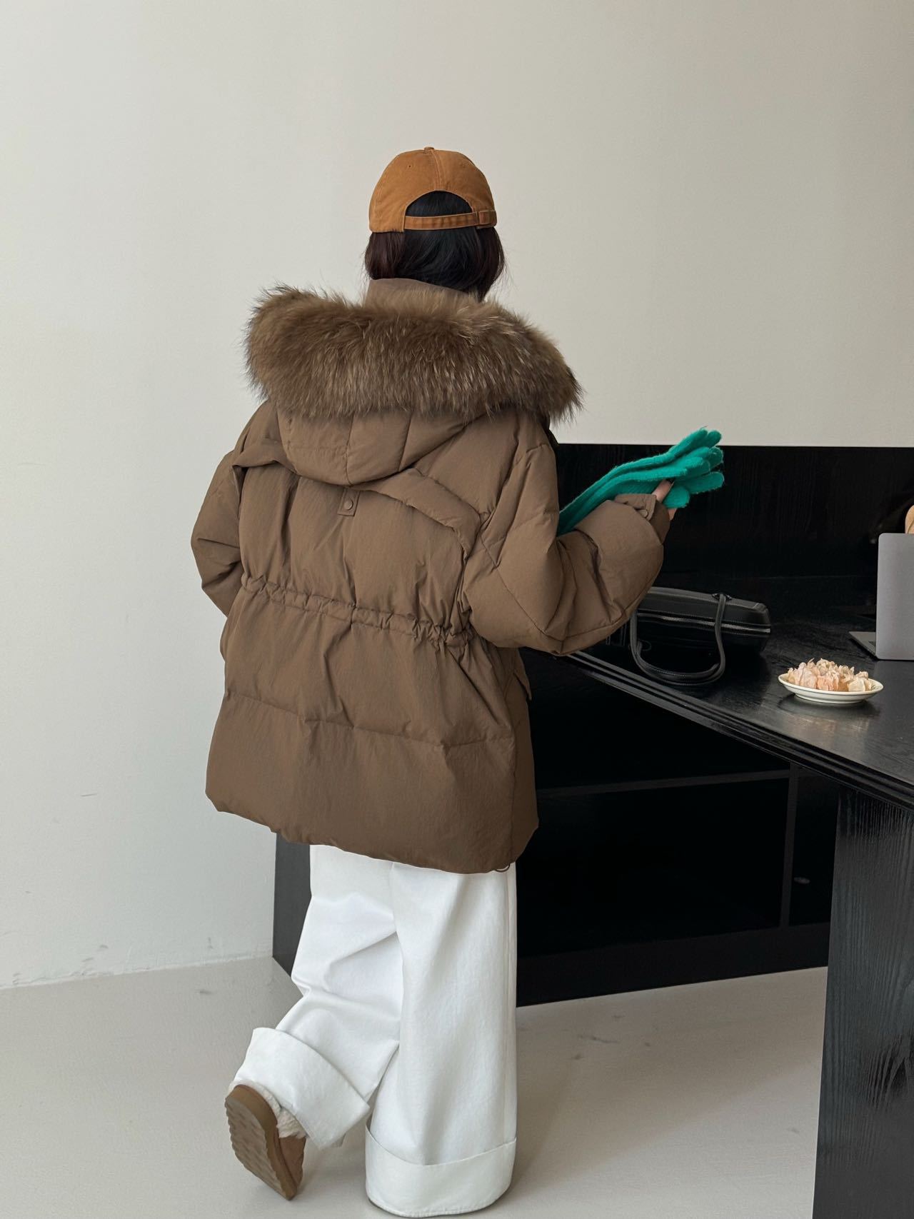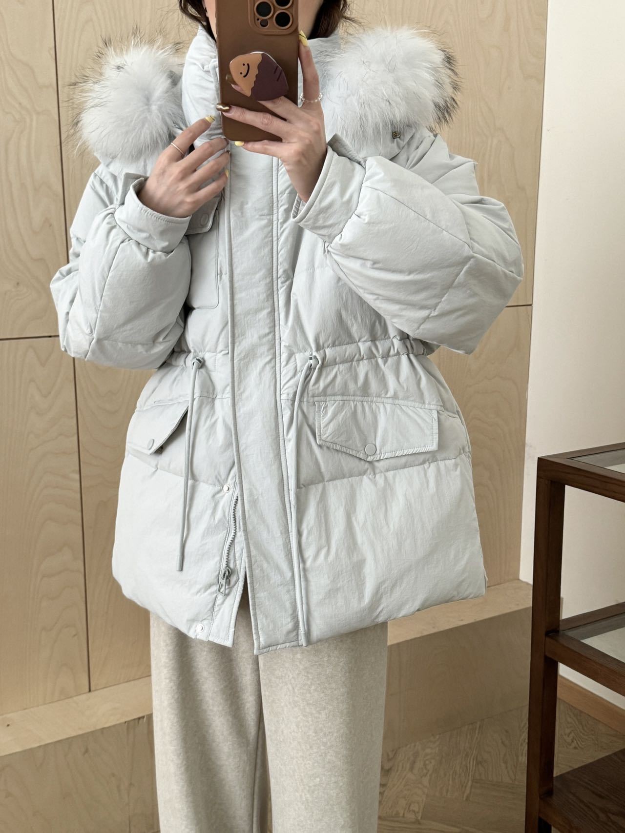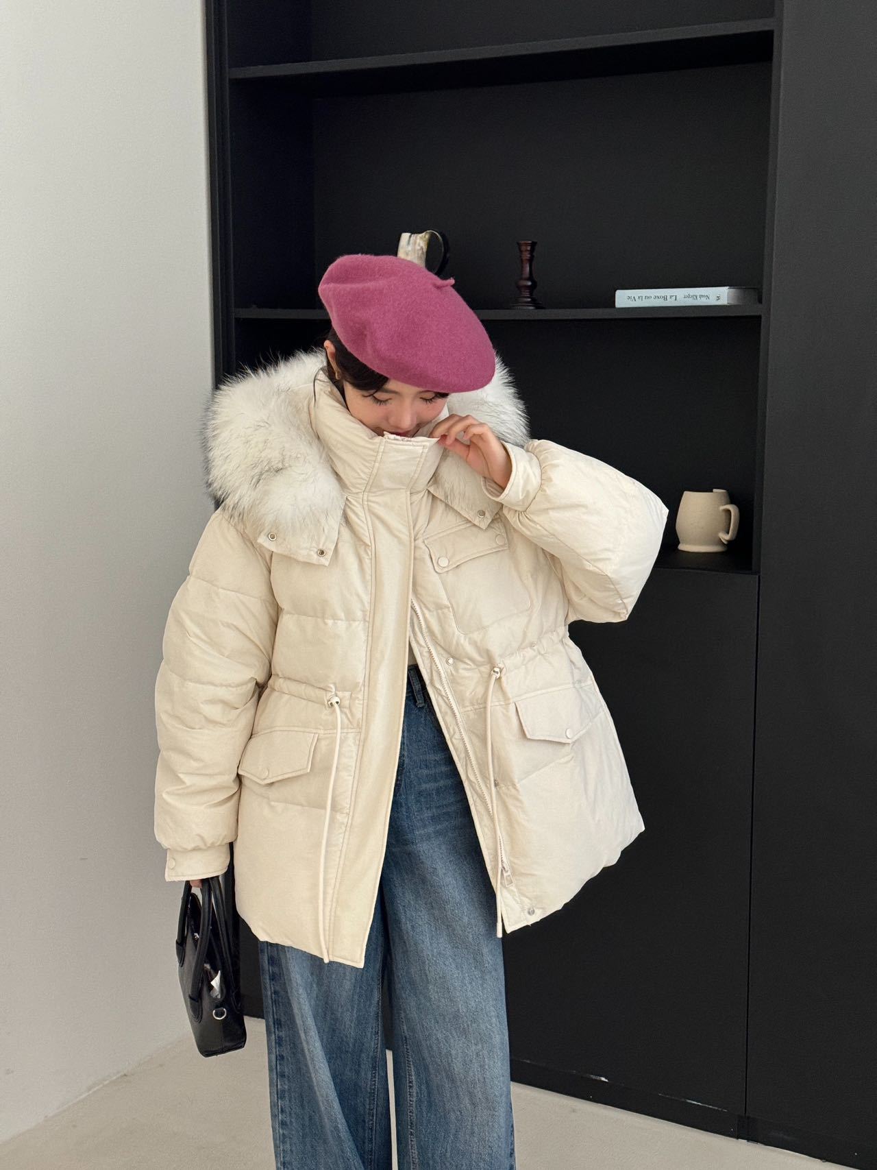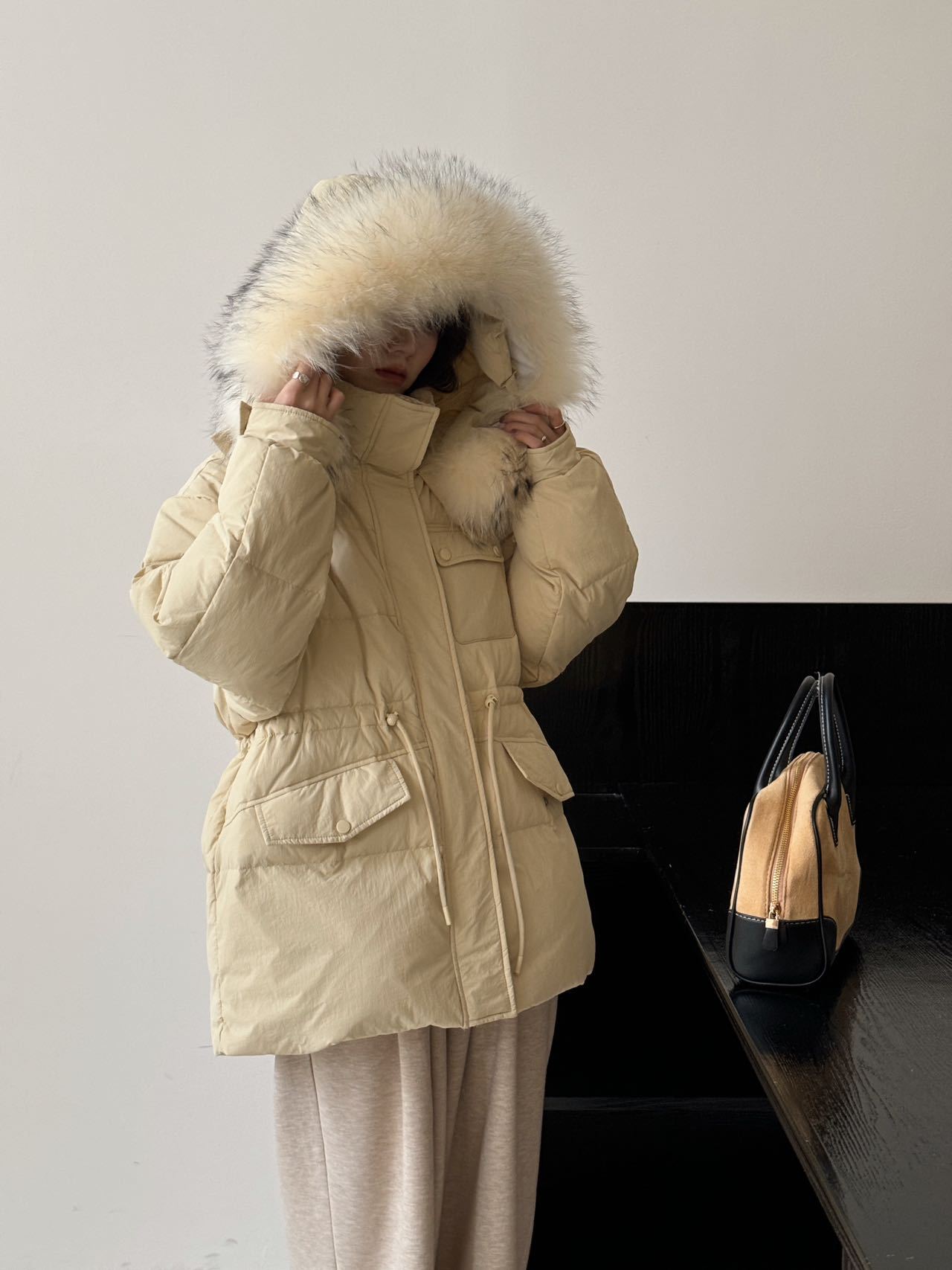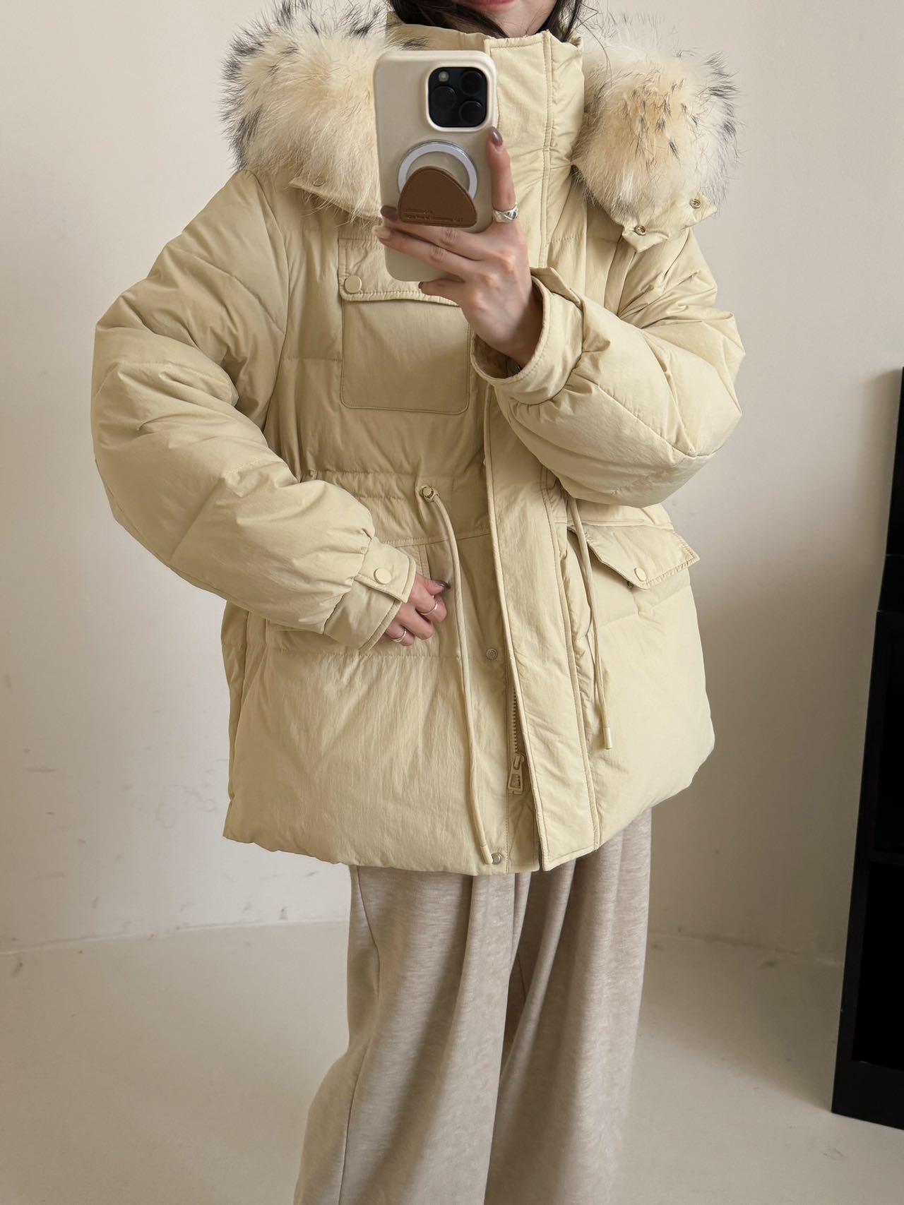 Chamarra de Trabajo Acolchada con Cuello de Piel de Mapache para Mujer de Largo Medio Colección Nueva Invierno 2025 Cintura con Cordón Pato Blanco Plumón Abrigo Cálido Grueso