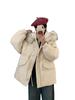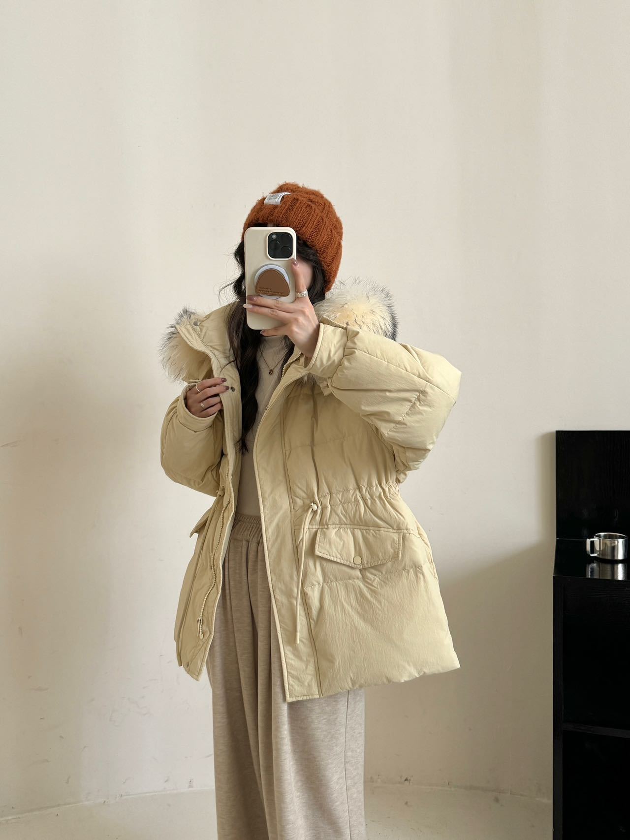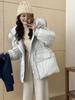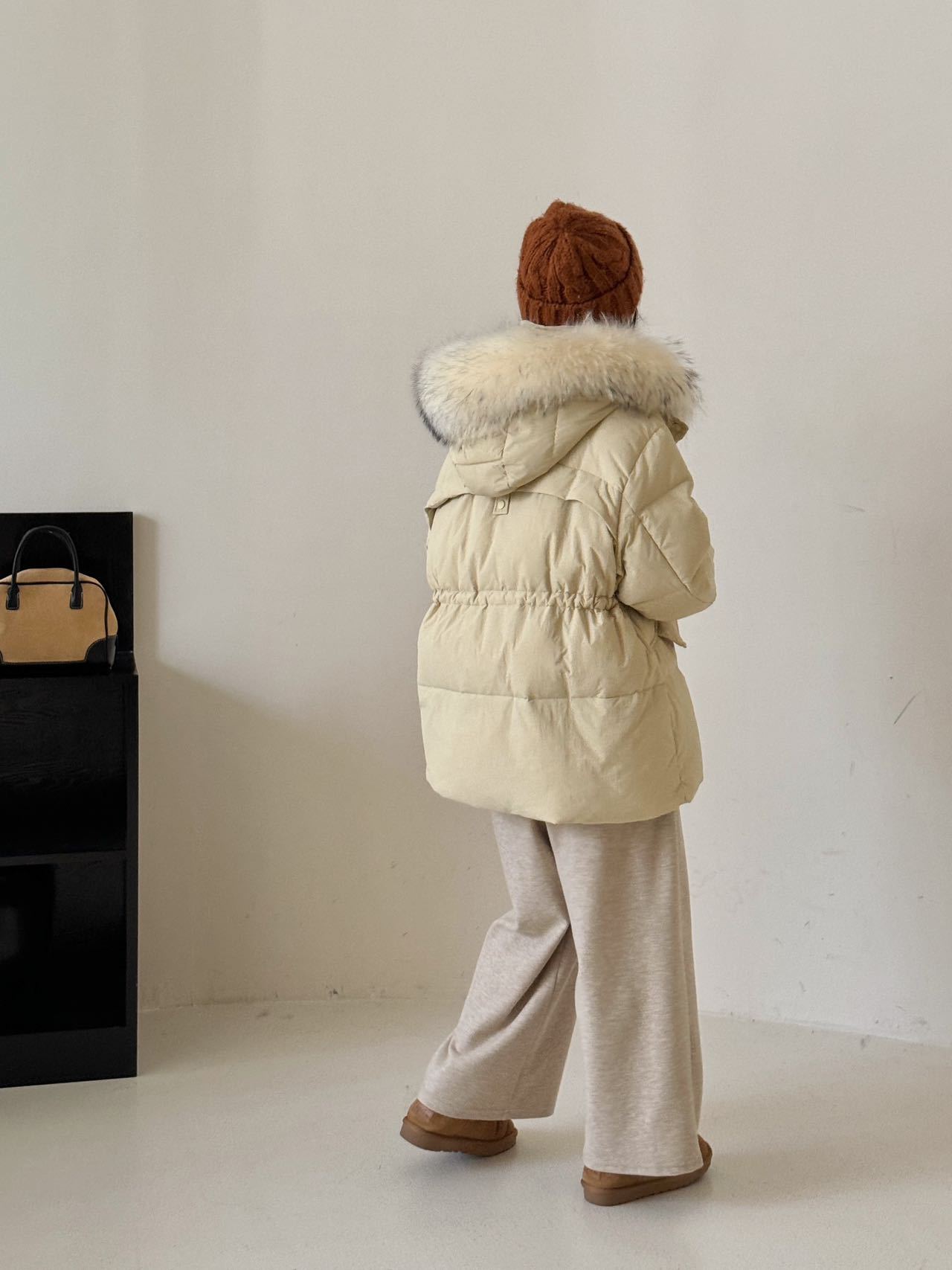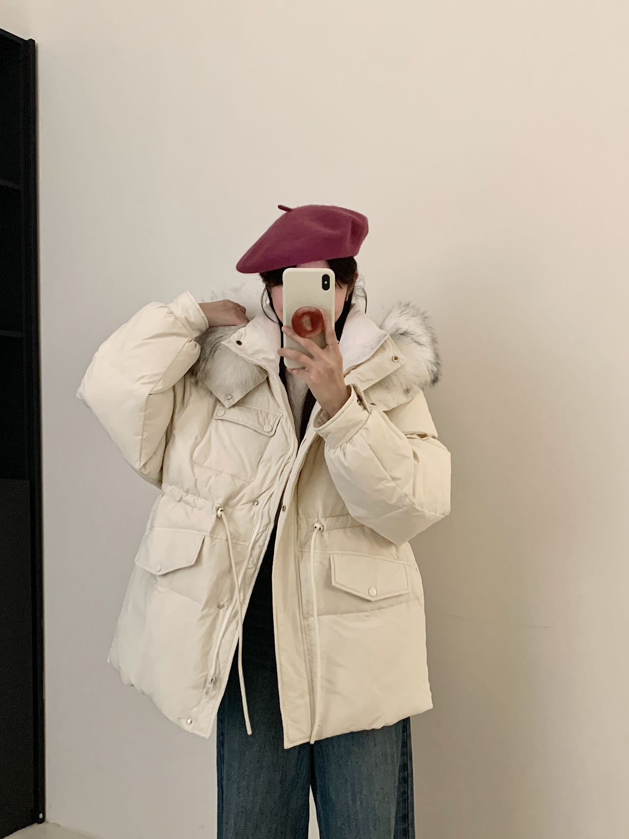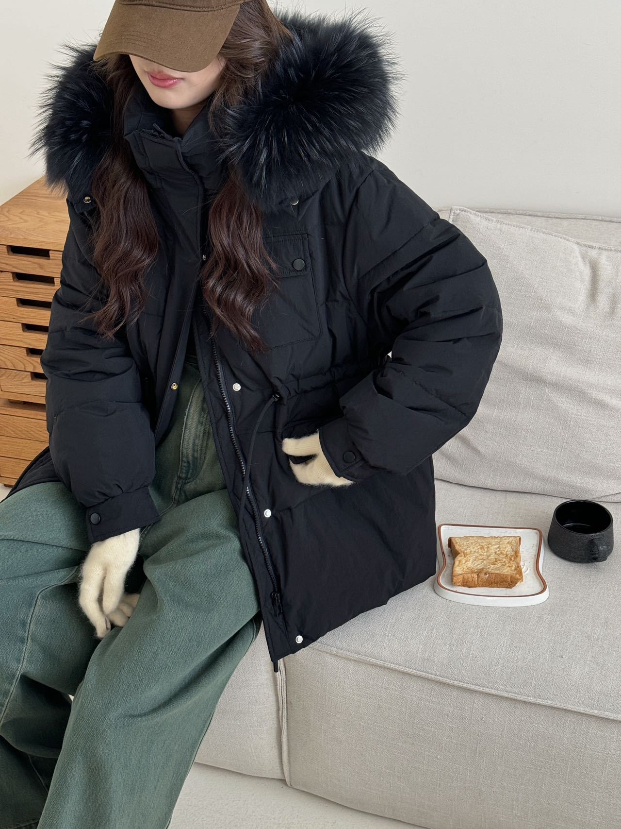 Chamarra de Trabajo Acolchada con Cuello de Piel de Mapache para Mujer de Largo Medio Colección Nueva Invierno 2025 Cintura con Cordón Pato Blanco Plumón Abrigo Cálido Grueso