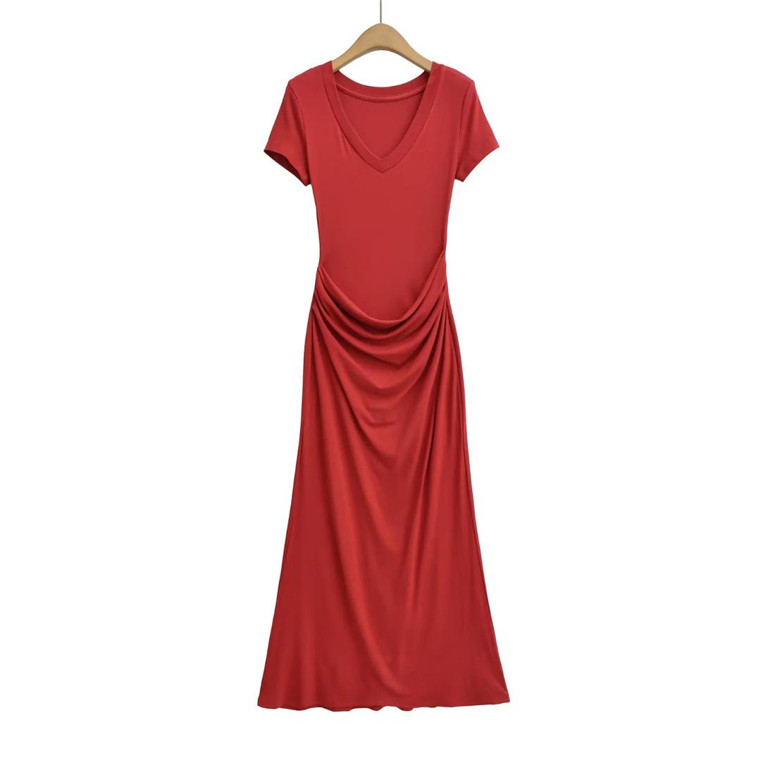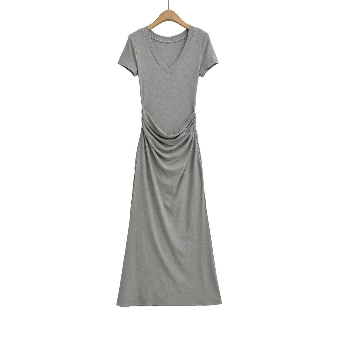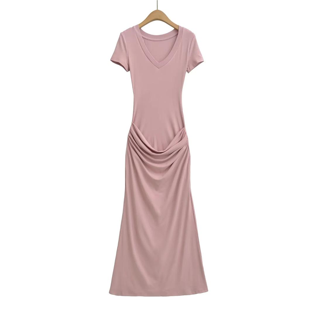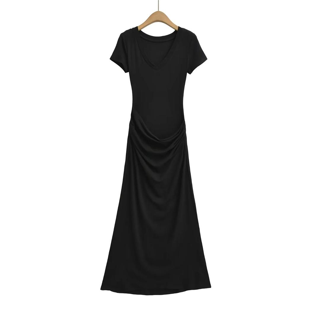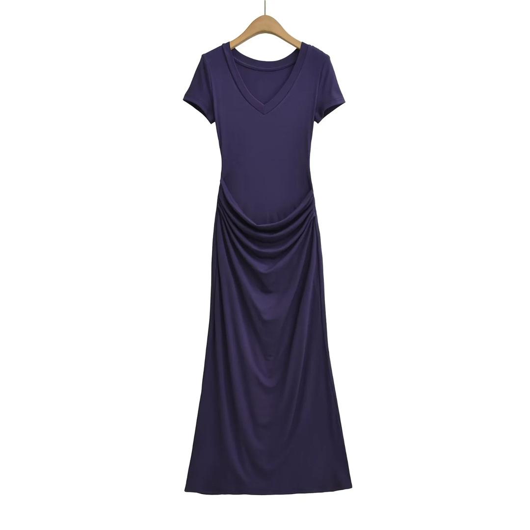 Vestido largo ajustado sexy elástico de color sólido estilo europeo y americano para mujer, cuello en V, cintura plisada ceñida, manga corta