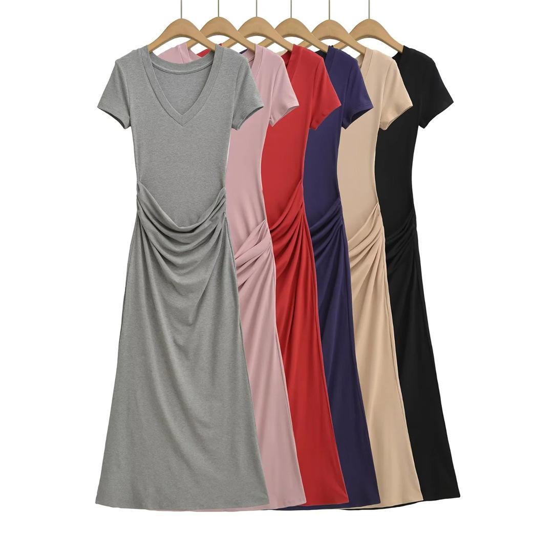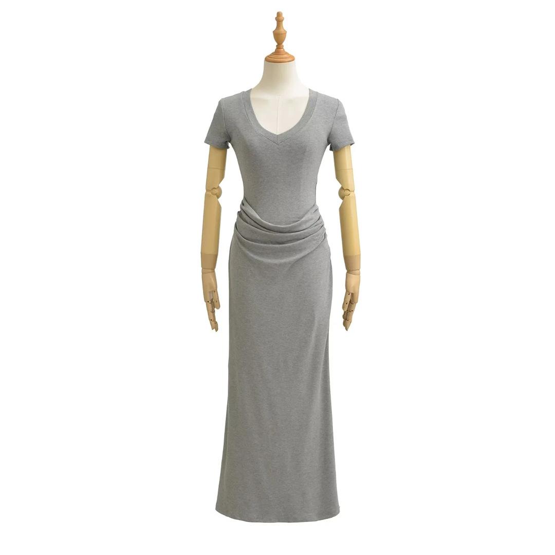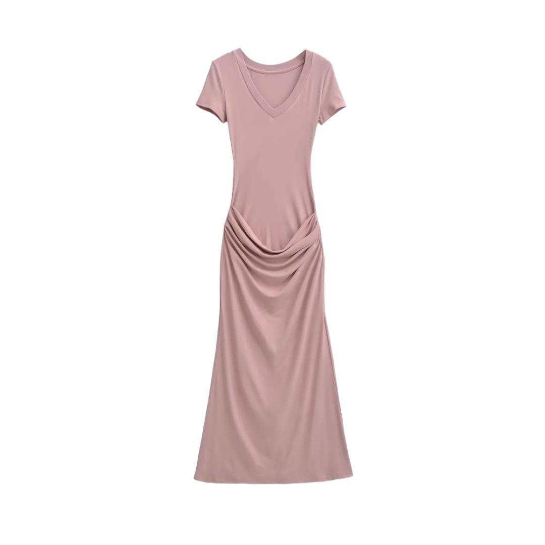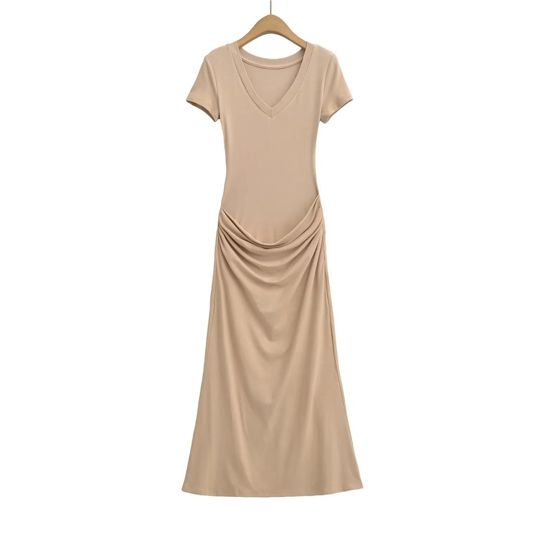 Vestido largo ajustado sexy elástico de color sólido estilo europeo y americano para mujer, cuello en V, cintura plisada ceñida, manga corta