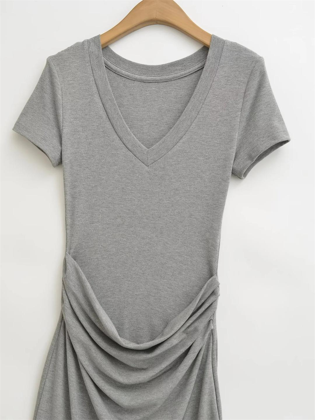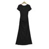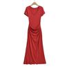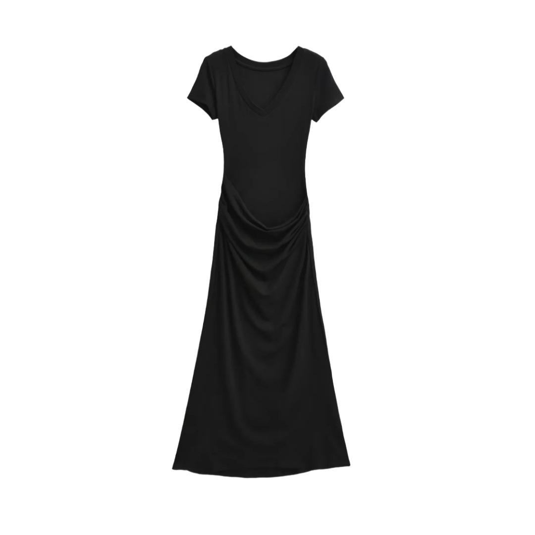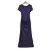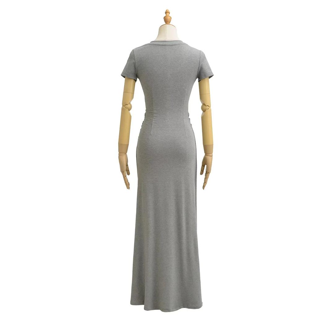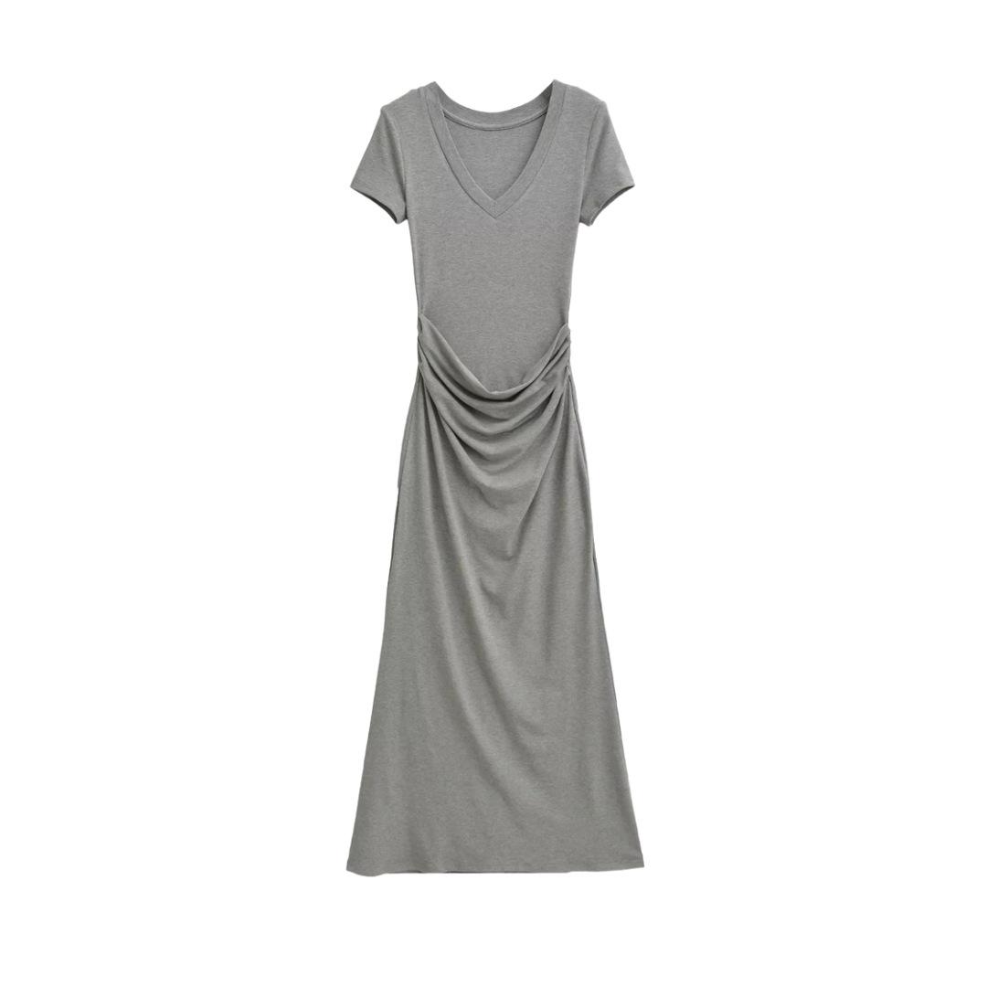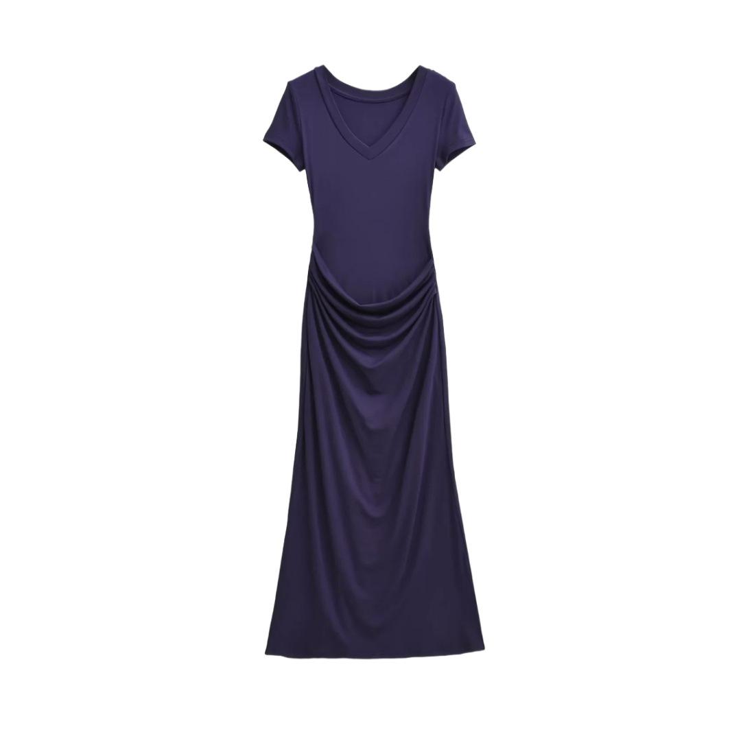 Vestido largo ajustado sexy elástico de color sólido estilo europeo y americano para mujer, cuello en V, cintura plisada ceñida, manga corta