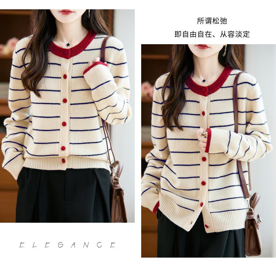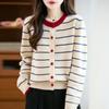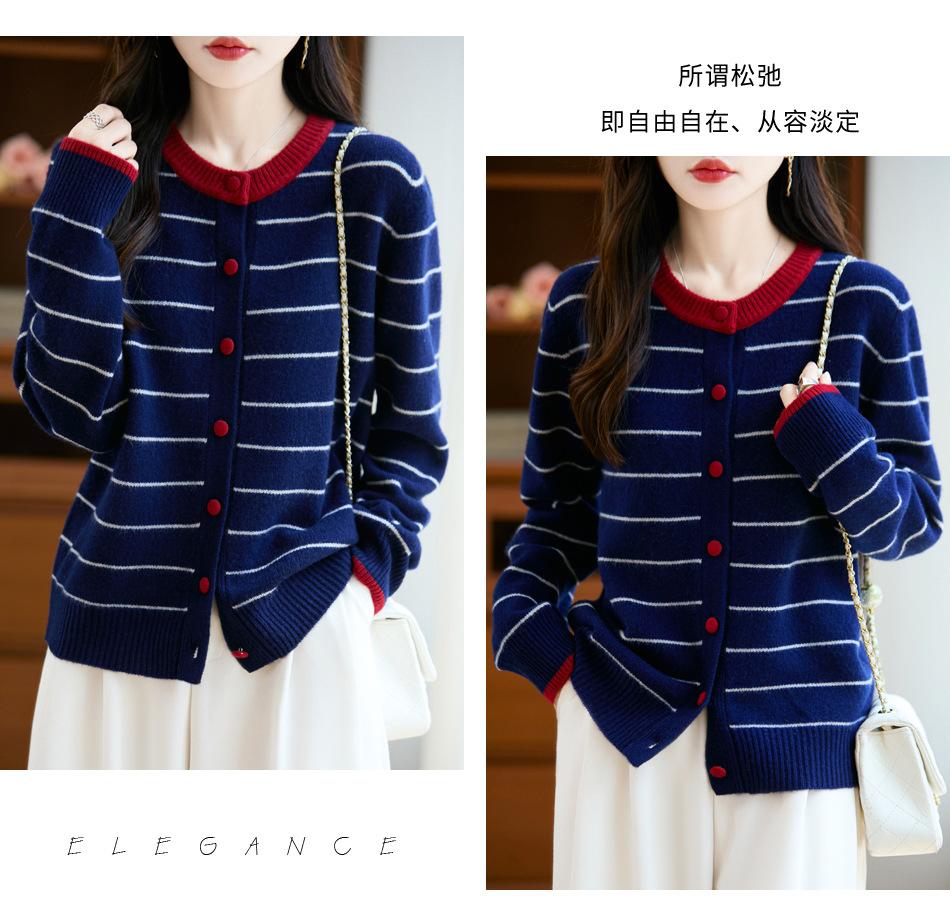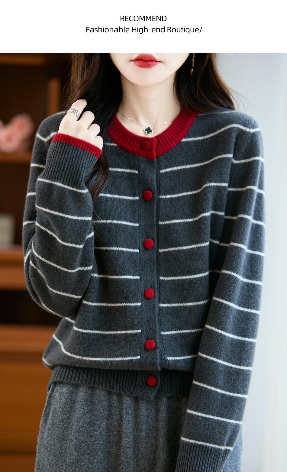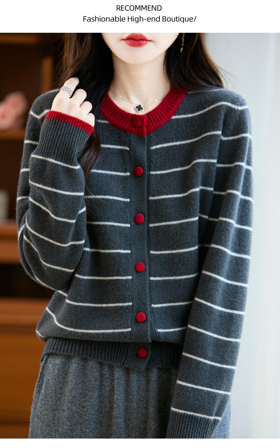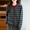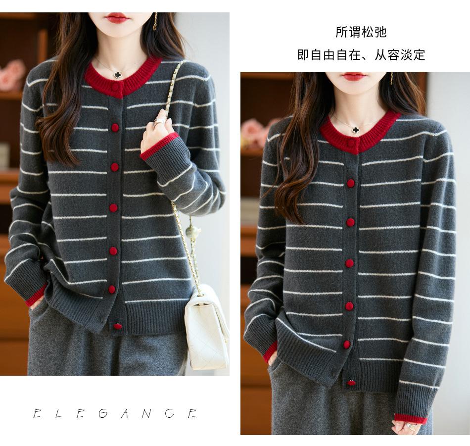 Cárdigan de Punto de Cuello Redondo para Mujer 100% Lana Pura, Jacquard a Rayas Bicolor, Otoño e Invierno Nuevo Estilo Holgado Casual Perezoso