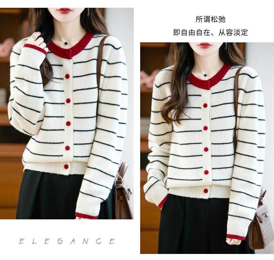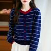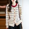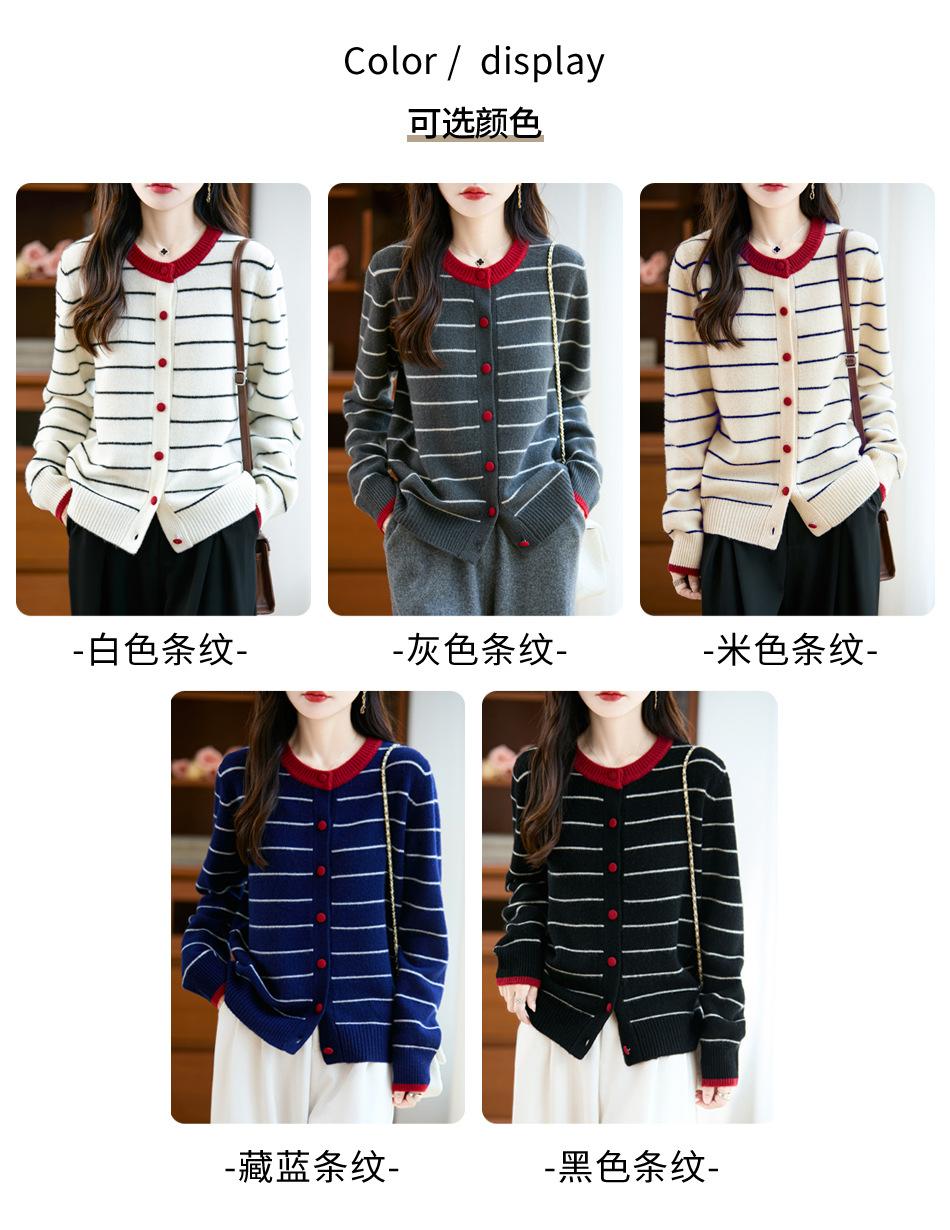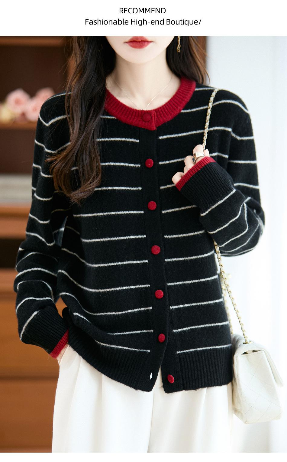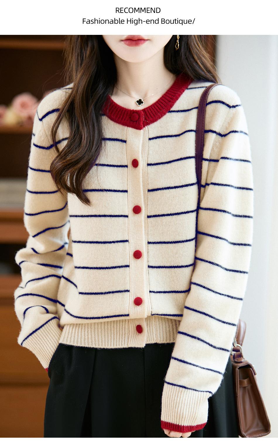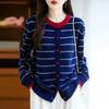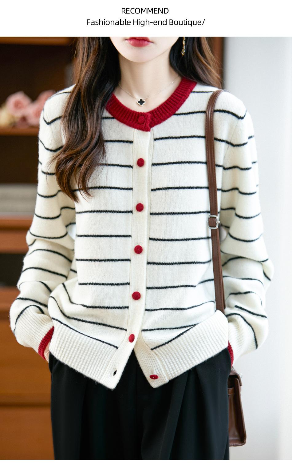 Cárdigan de Punto de Cuello Redondo para Mujer 100% Lana Pura, Jacquard a Rayas Bicolor, Otoño e Invierno Nuevo Estilo Holgado Casual Perezoso