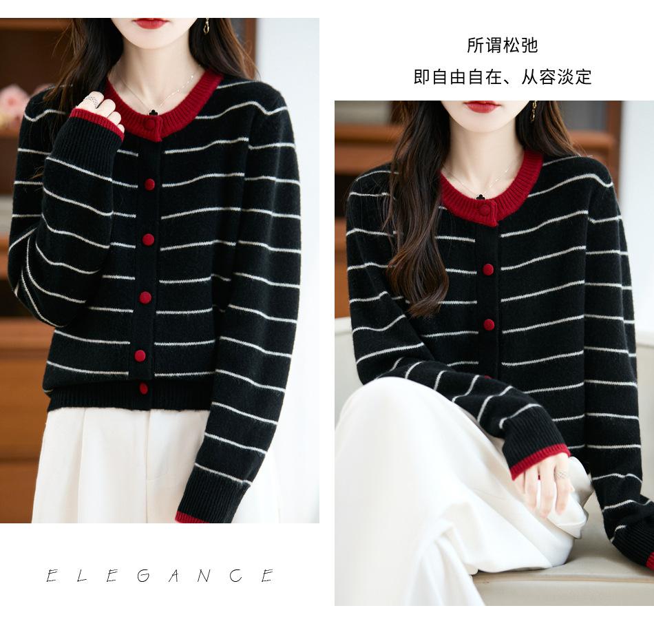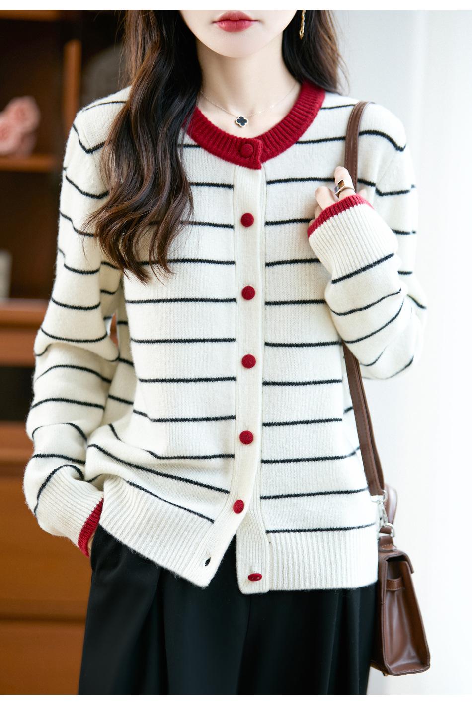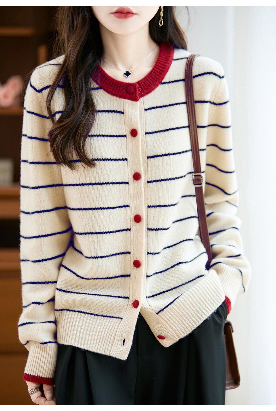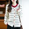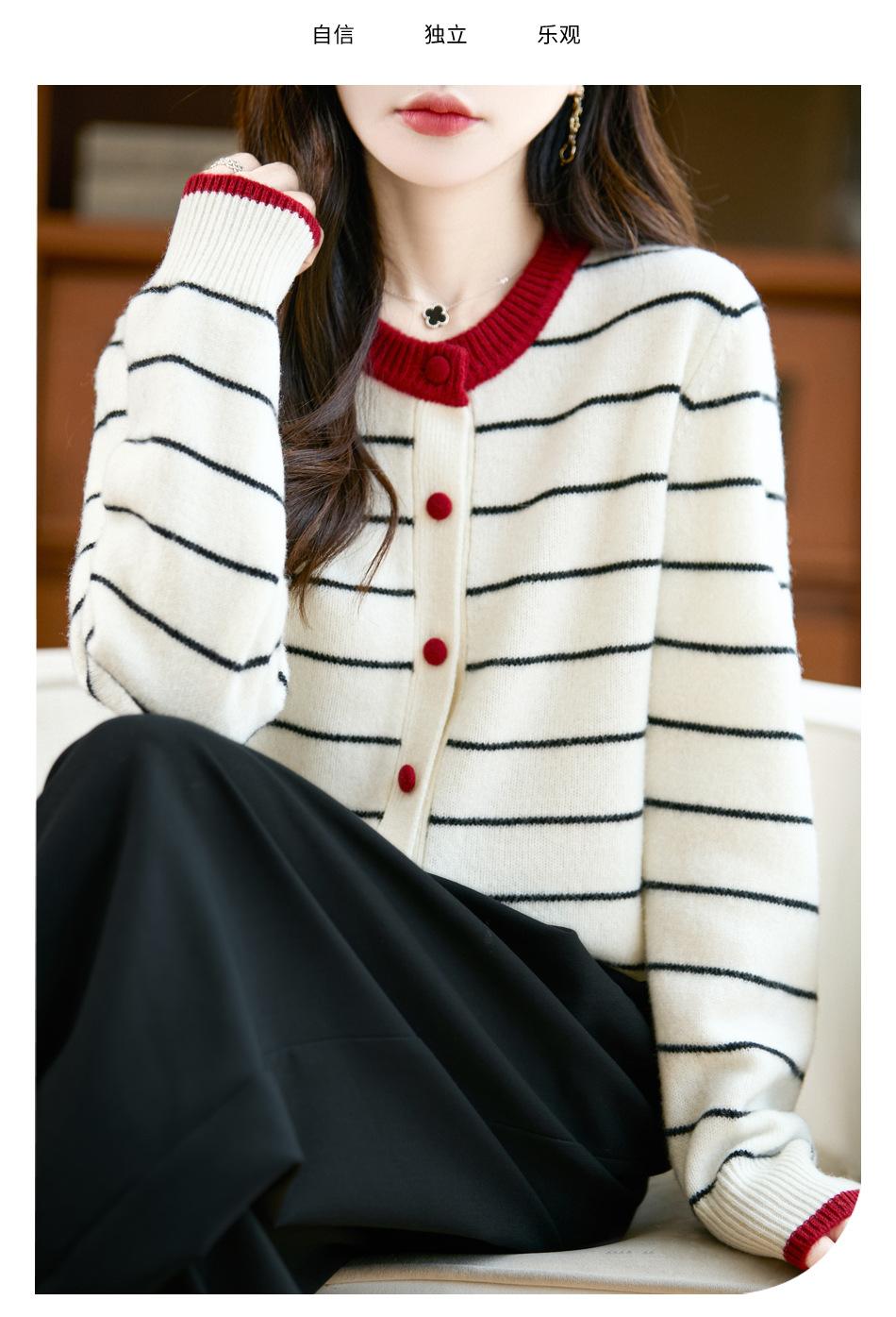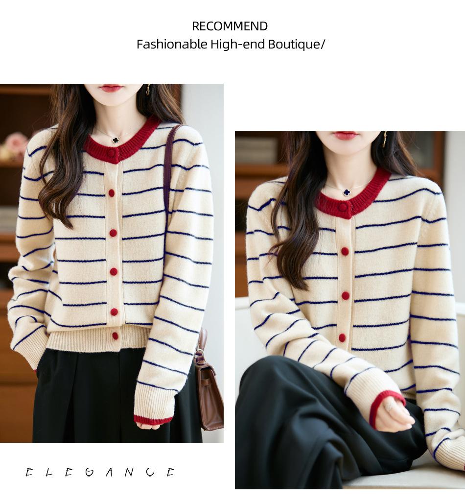 Cárdigan de Punto de Cuello Redondo para Mujer 100% Lana Pura, Jacquard a Rayas Bicolor, Otoño e Invierno Nuevo Estilo Holgado Casual Perezoso