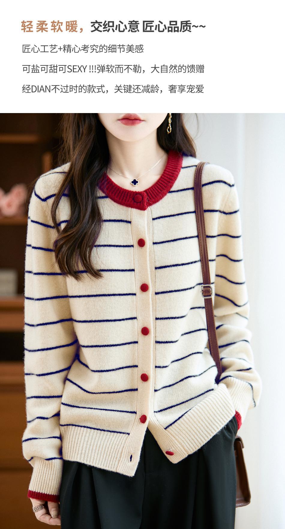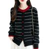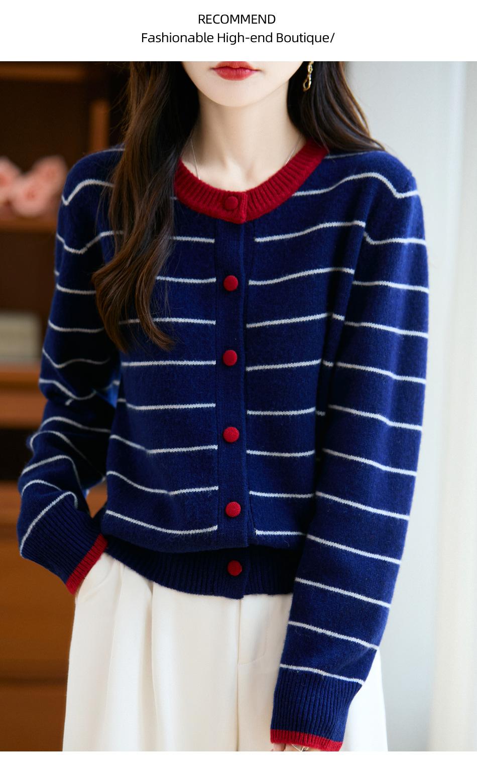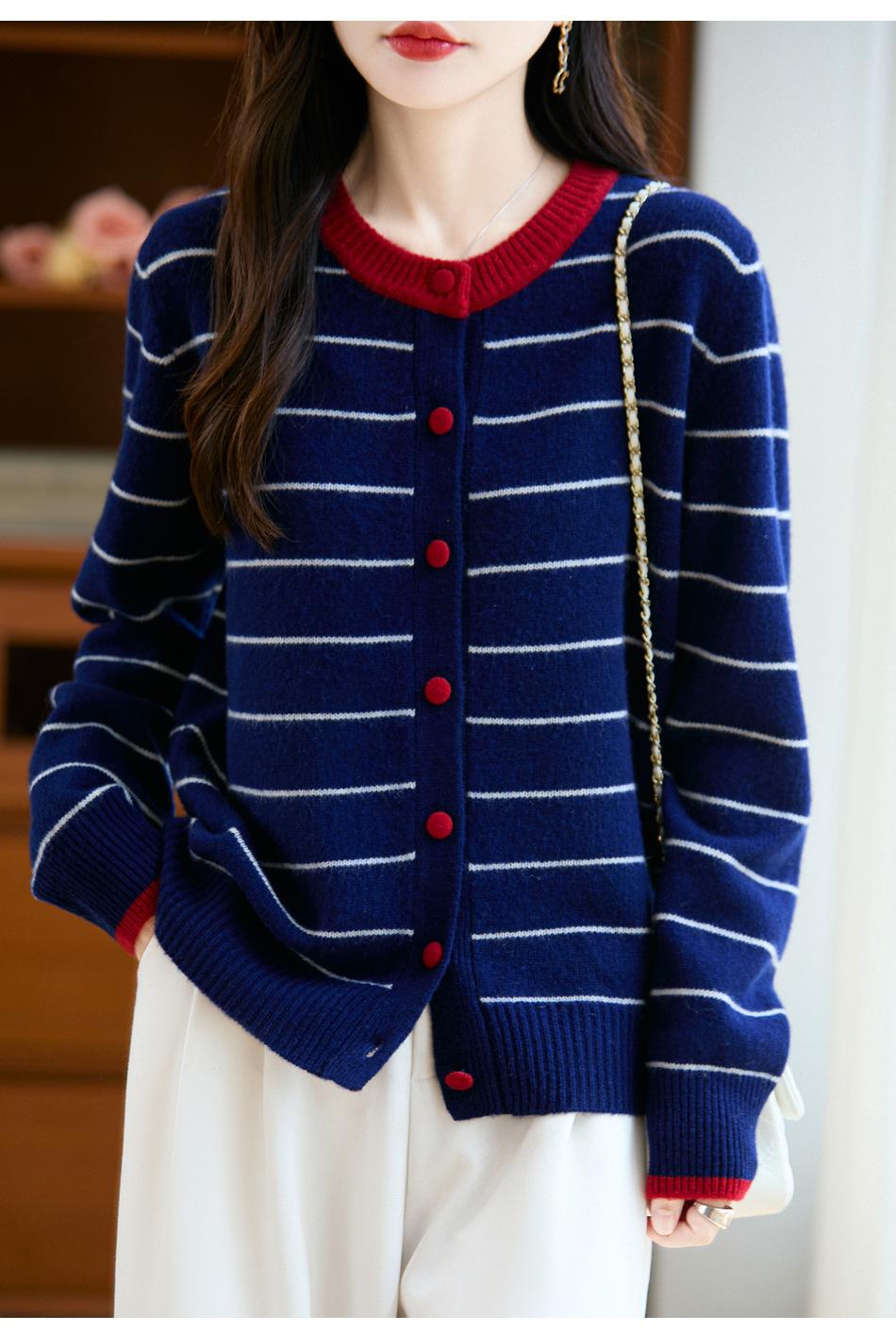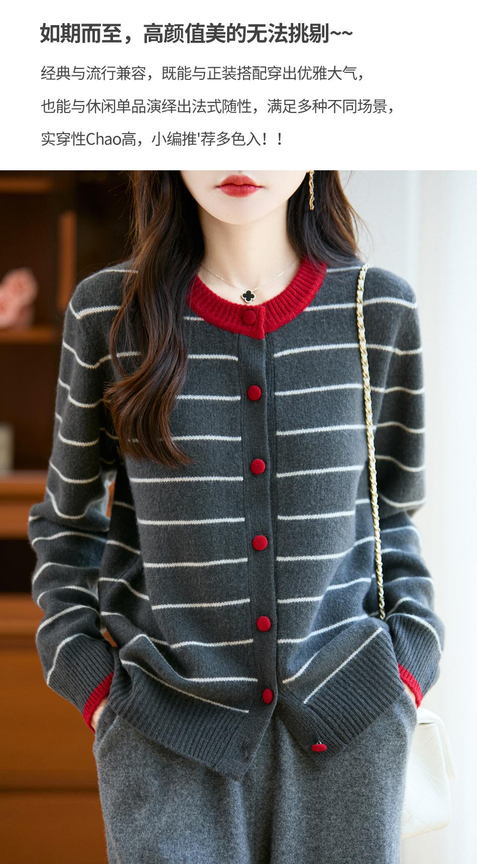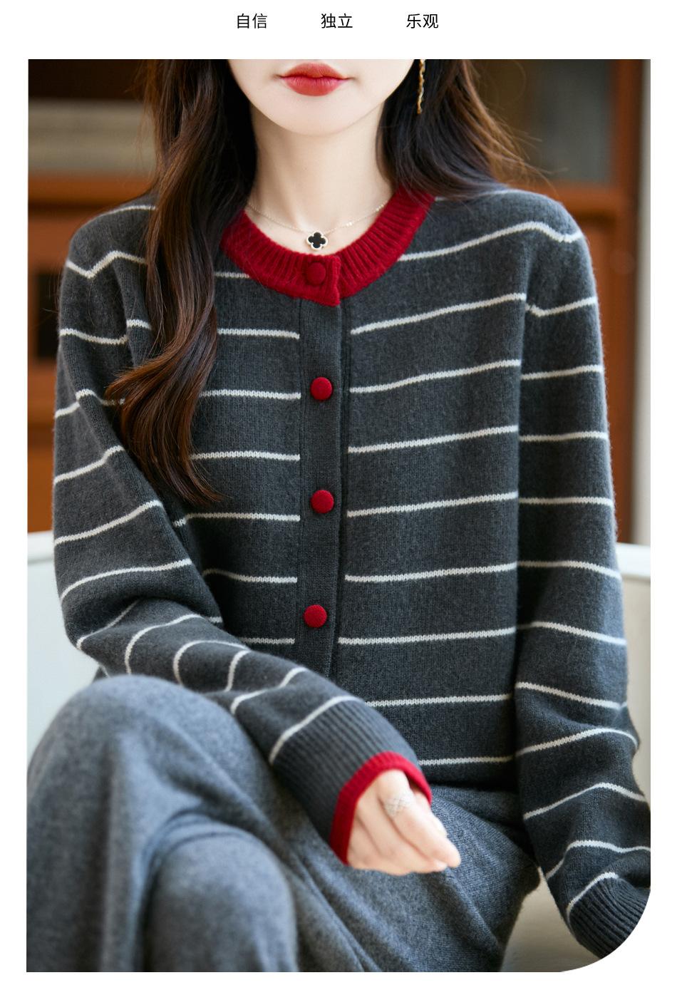 Cárdigan de Punto de Cuello Redondo para Mujer 100% Lana Pura, Jacquard a Rayas Bicolor, Otoño e Invierno Nuevo Estilo Holgado Casual Perezoso