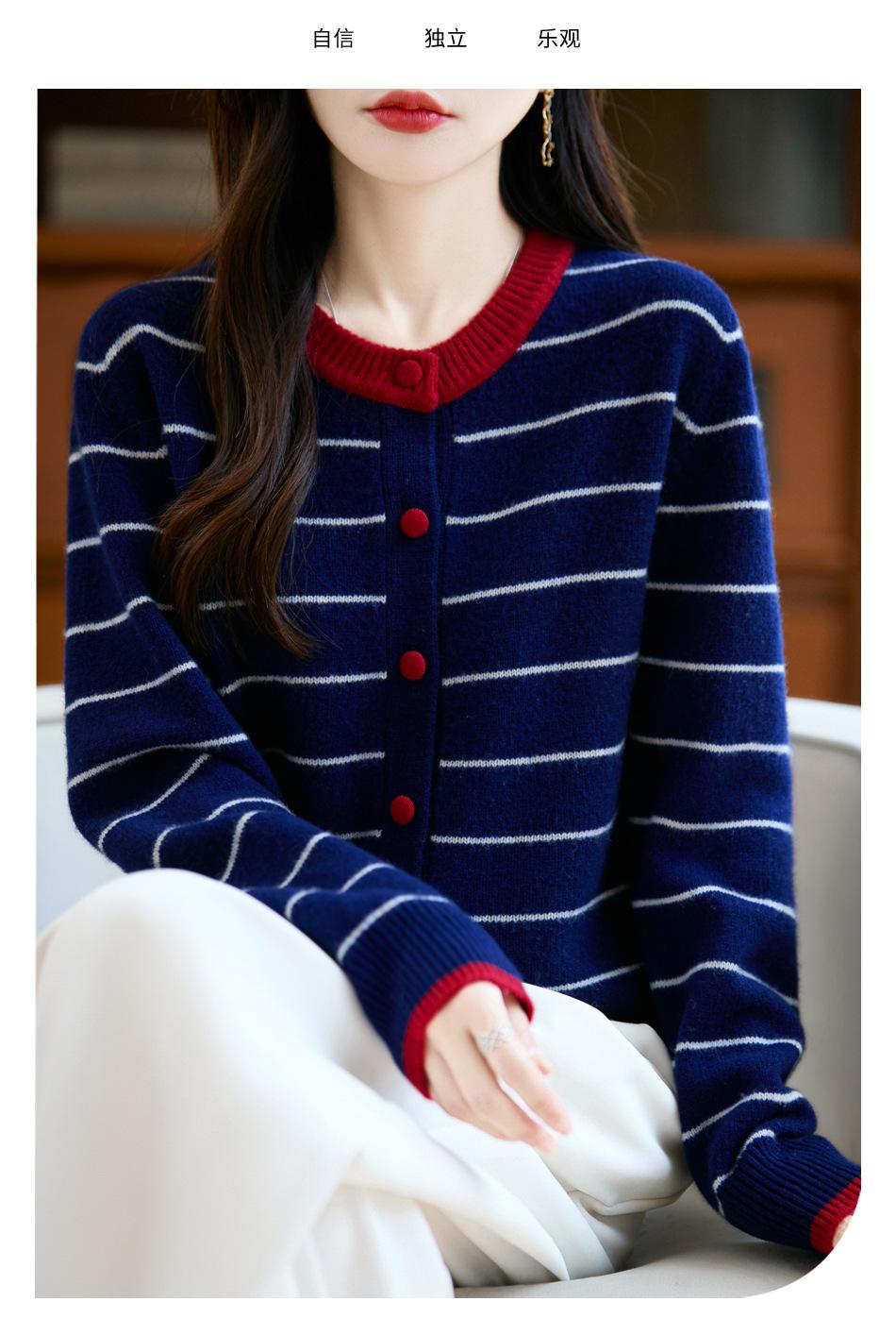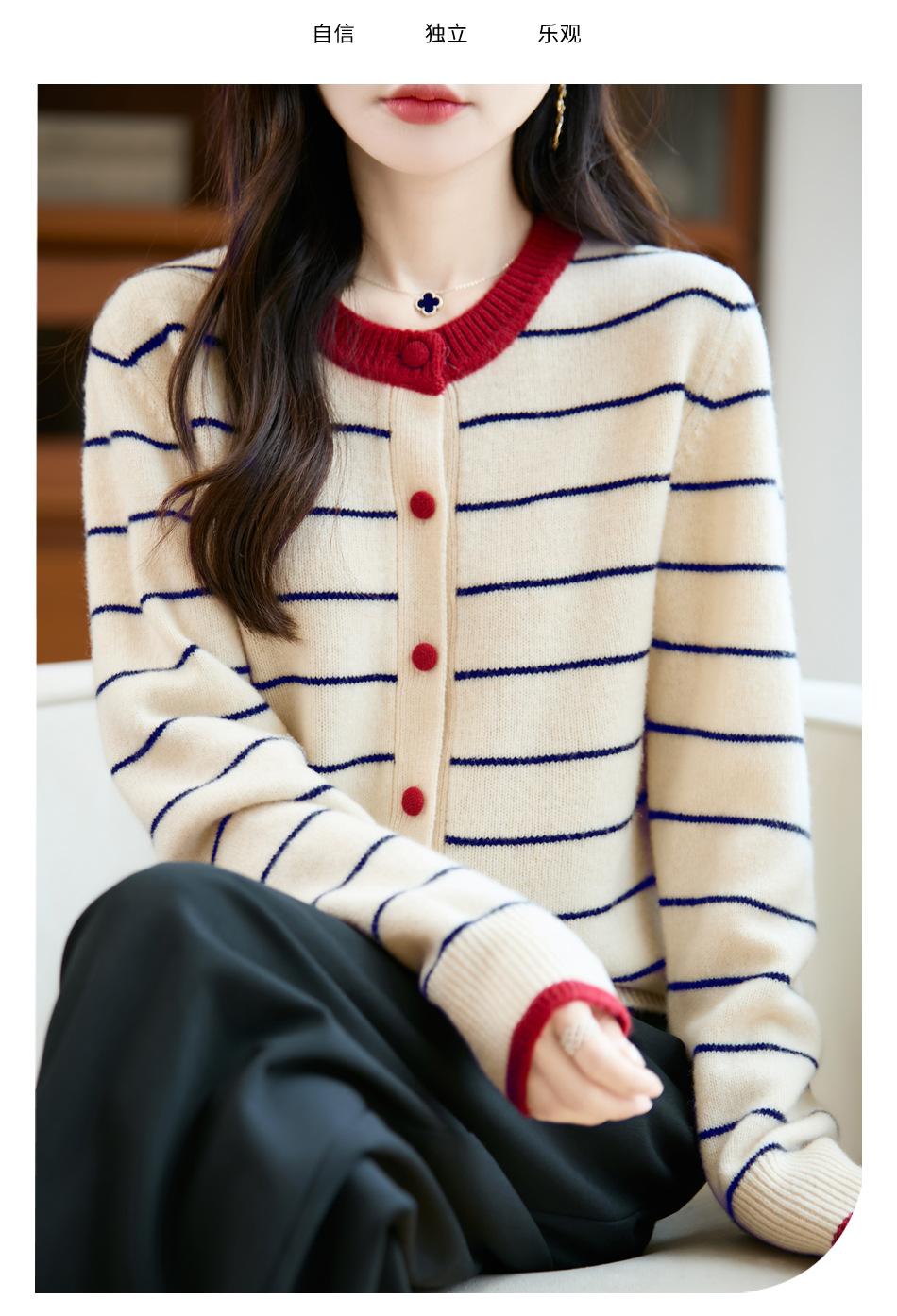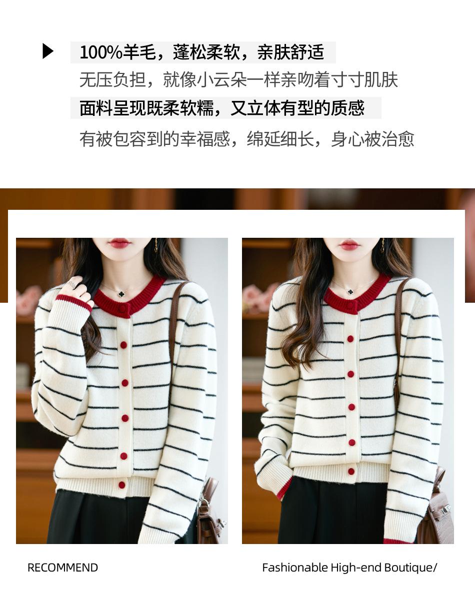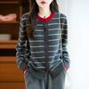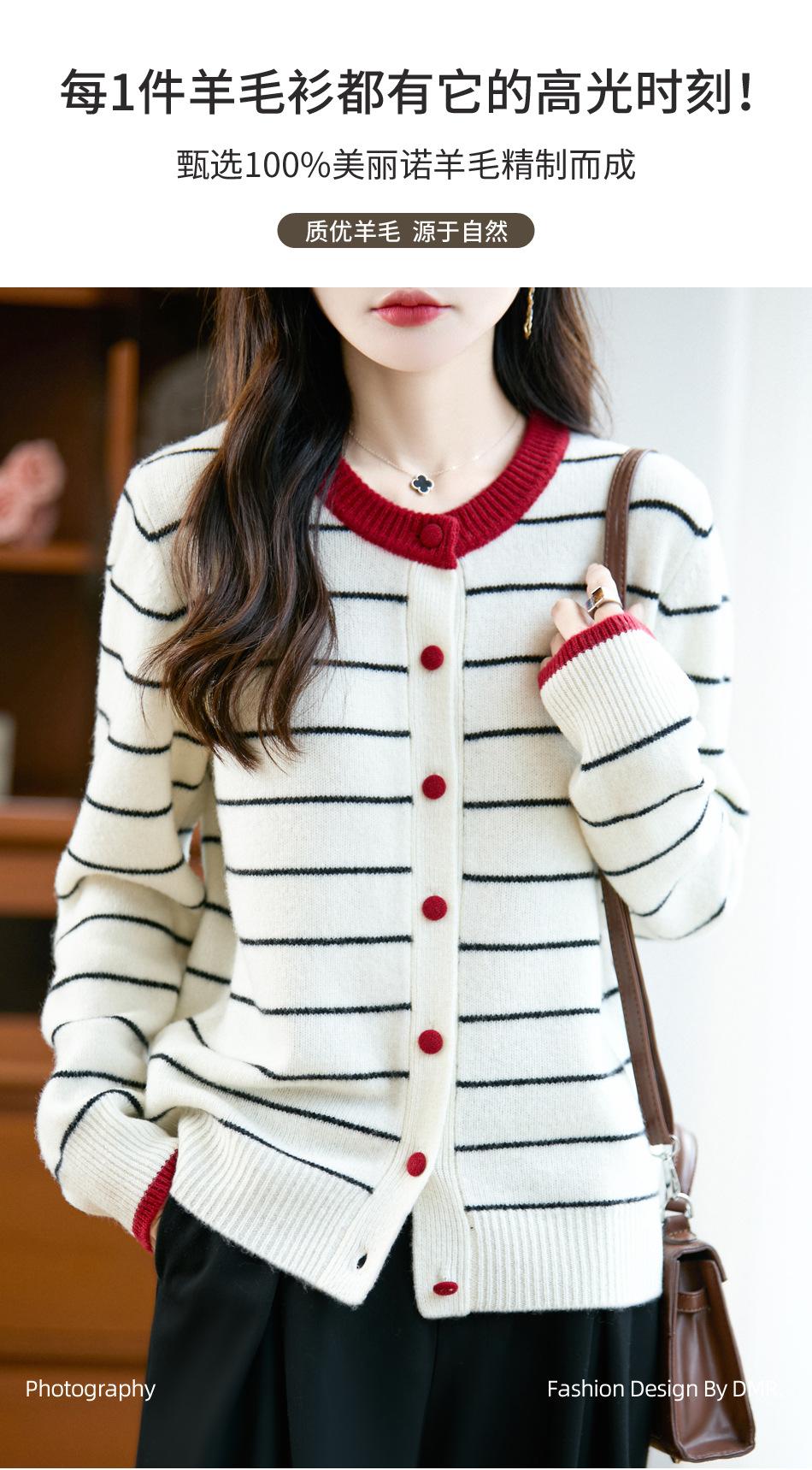 Cárdigan de Punto de Cuello Redondo para Mujer 100% Lana Pura, Jacquard a Rayas Bicolor, Otoño e Invierno Nuevo Estilo Holgado Casual Perezoso