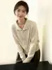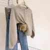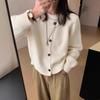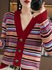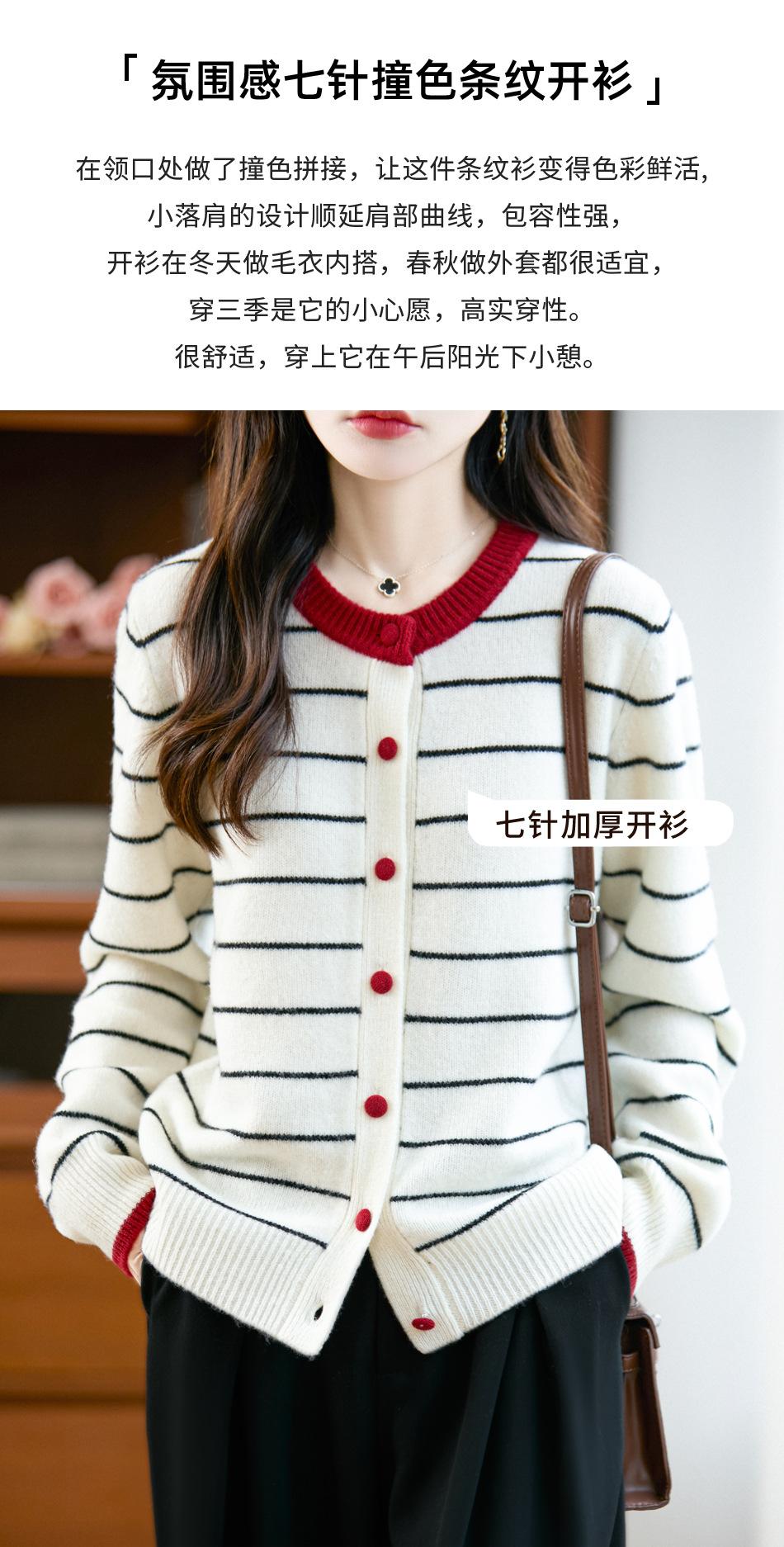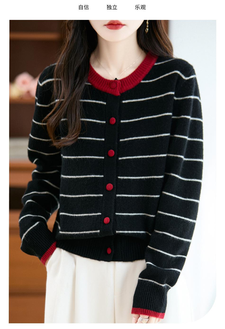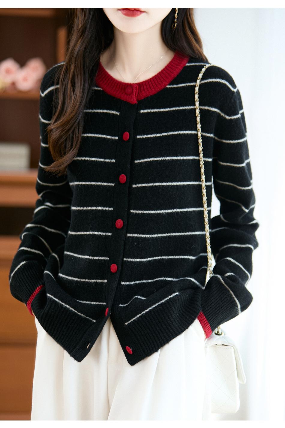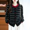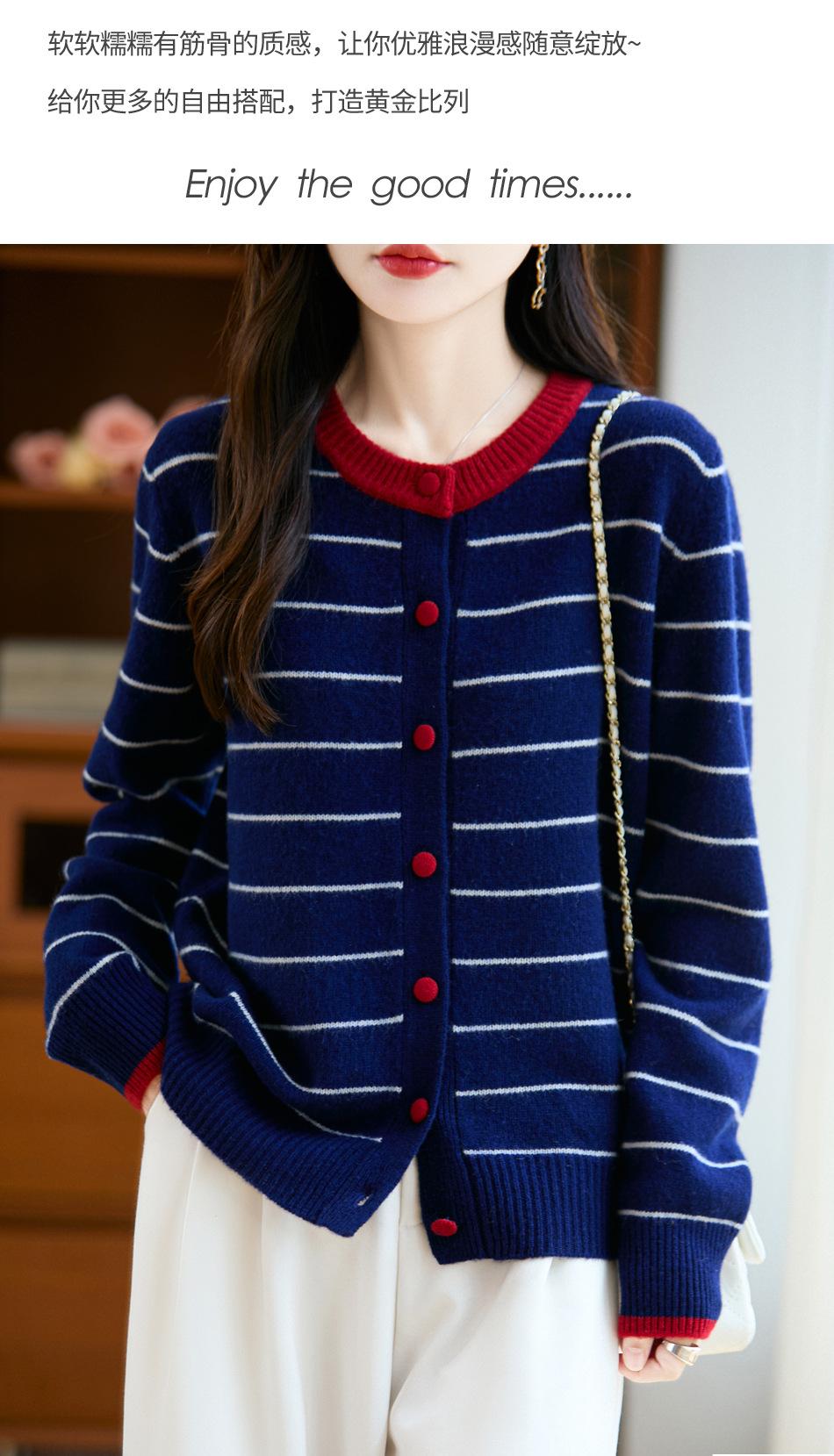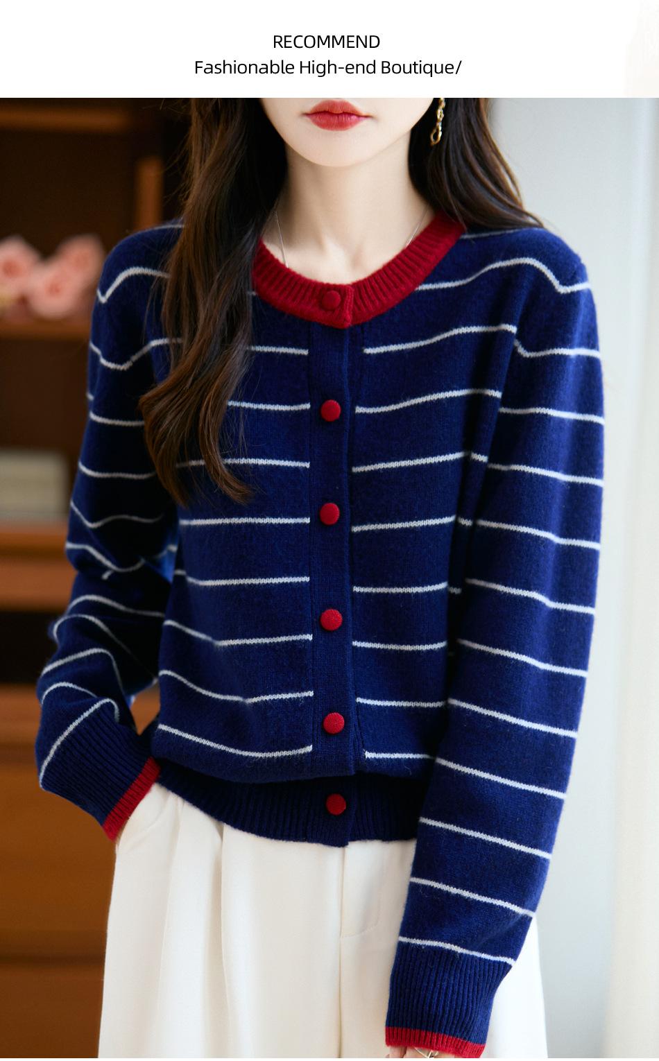 Cárdigan de Punto de Cuello Redondo para Mujer 100% Lana Pura, Jacquard a Rayas Bicolor, Otoño e Invierno Nuevo Estilo Holgado Casual Perezoso
