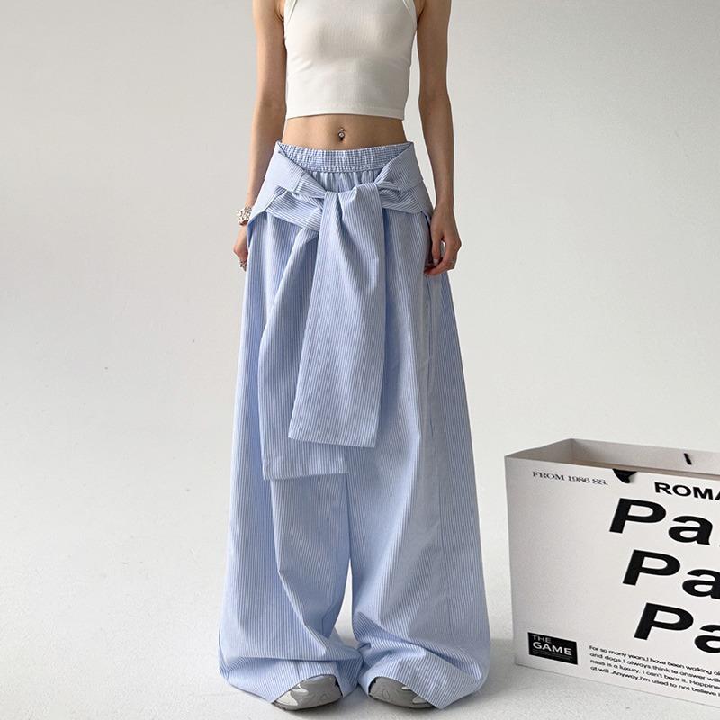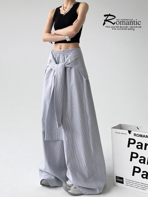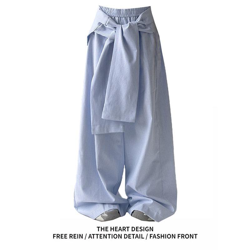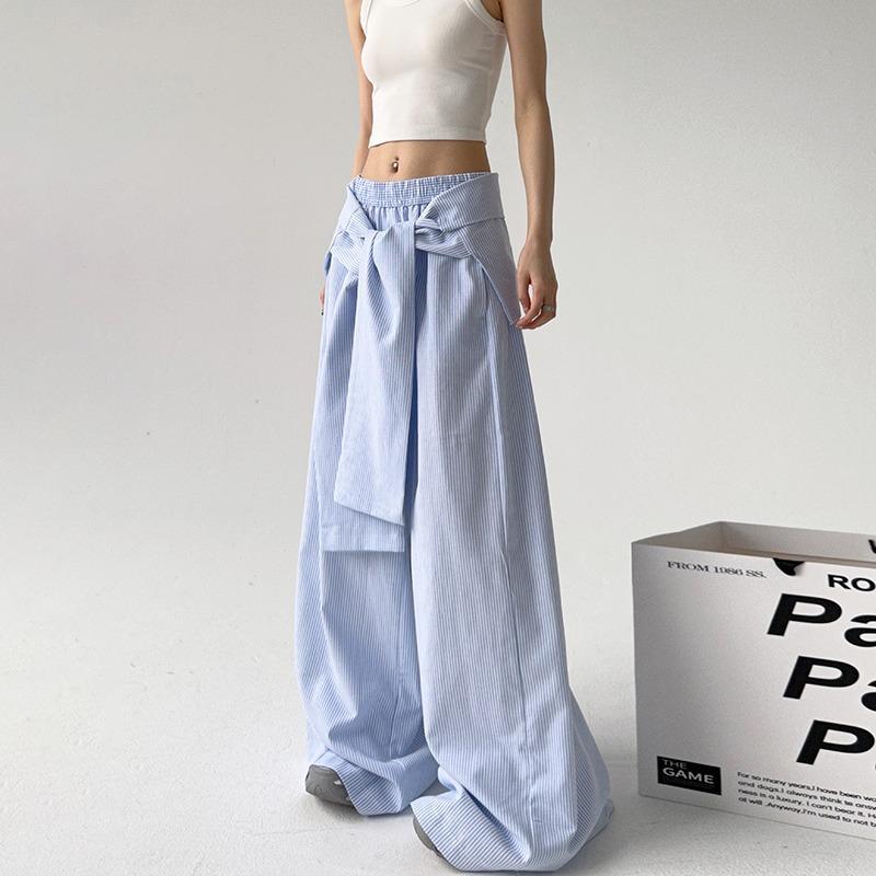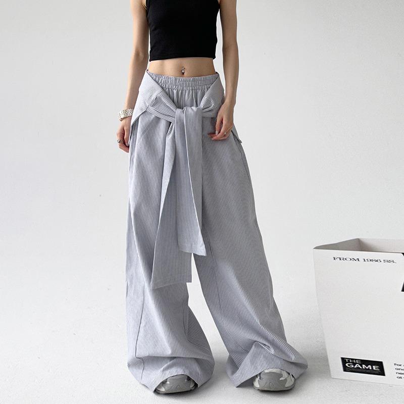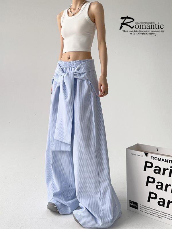 Pantalones de pierna ancha a rayas retro estilo Hong Kong de viento perezoso para mujer, nuevos, de alta gama, con cintura anudable, holgados, casuales, largos hasta el suelo