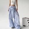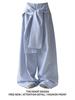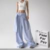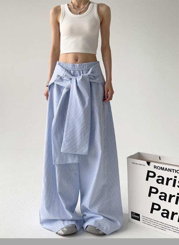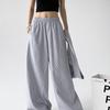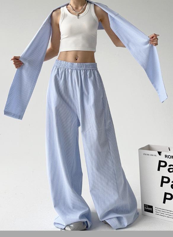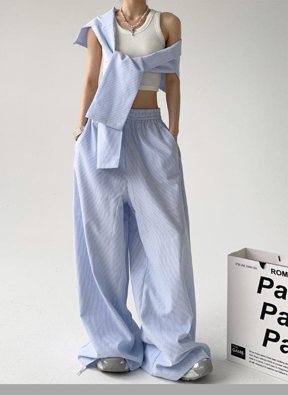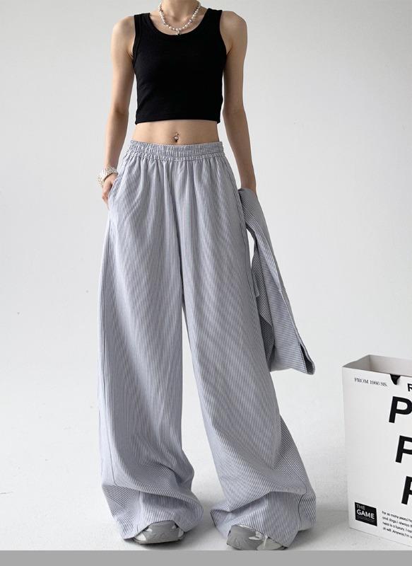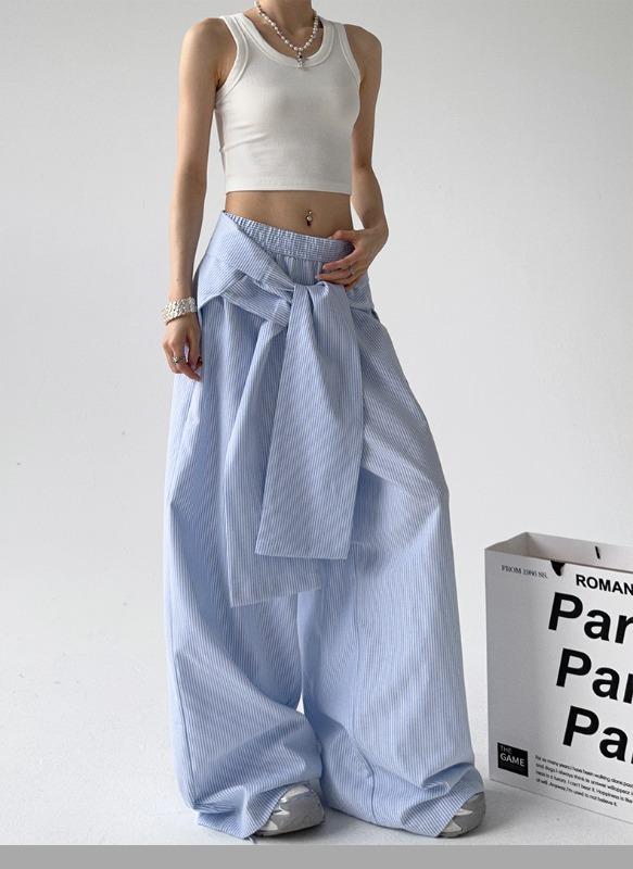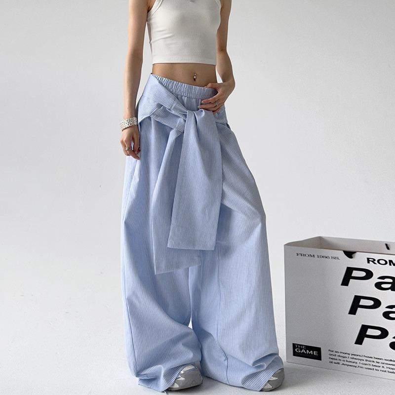 Pantalones de pierna ancha a rayas retro estilo Hong Kong de viento perezoso para mujer, nuevos, de alta gama, con cintura anudable, holgados, casuales, largos hasta el suelo