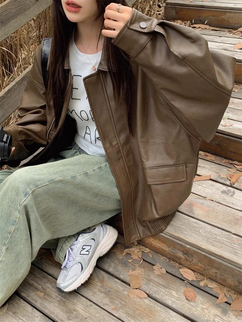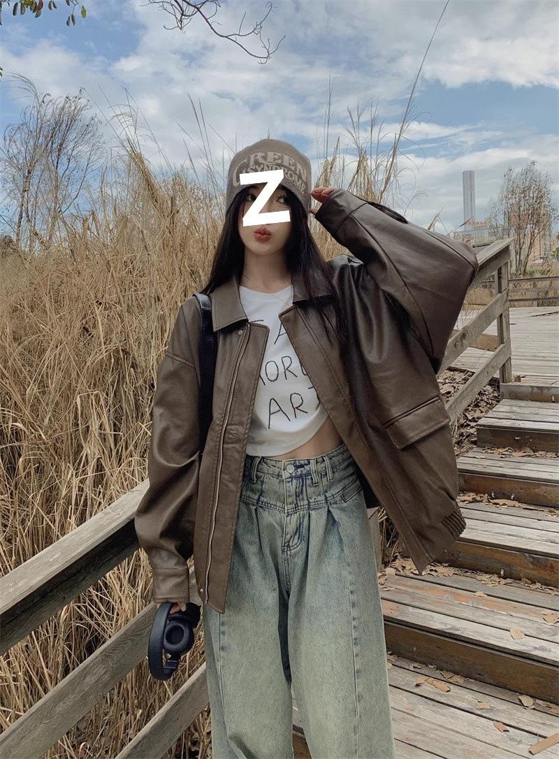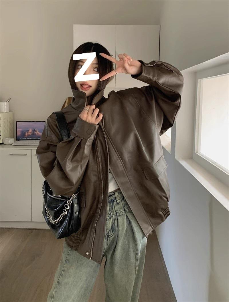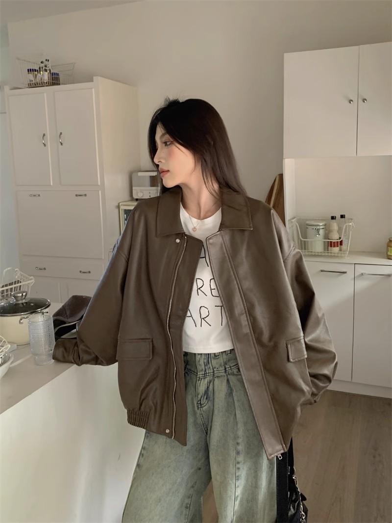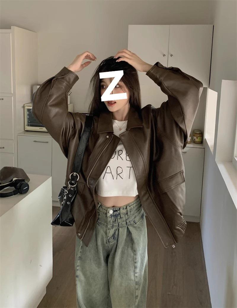 Chaqueta de Cuero Marrón Maillard para Motocicleta para Mujer 2025 Nueva Primavera y Otoño Americana Retro Cortavientos PU Chaqueta Abrigo Tendencia