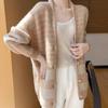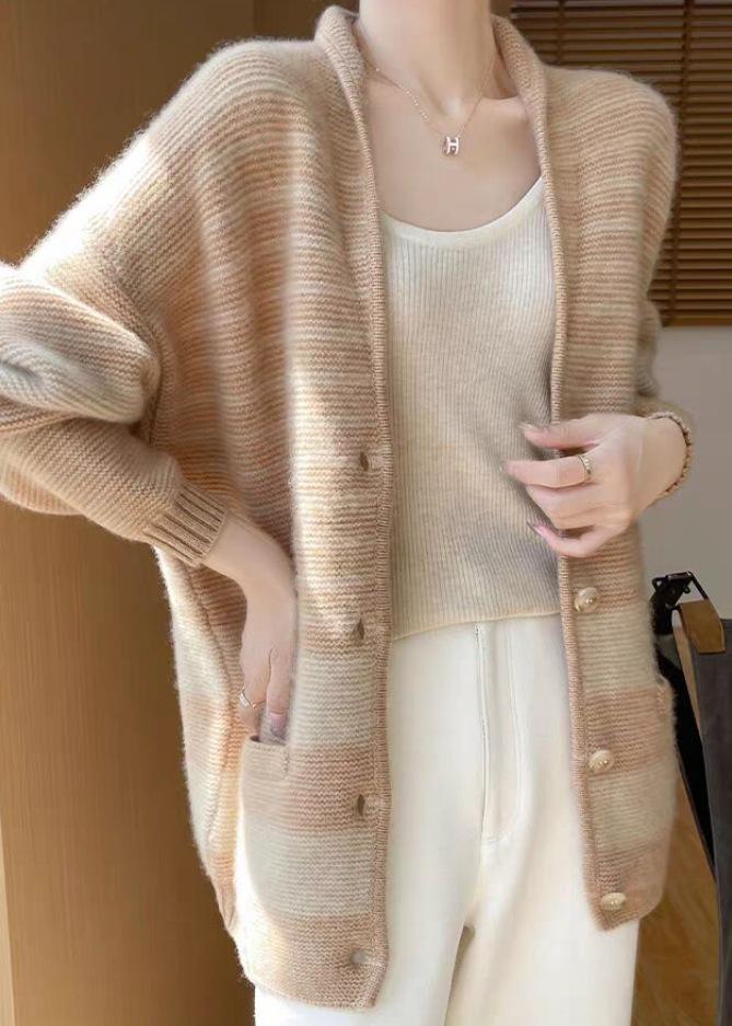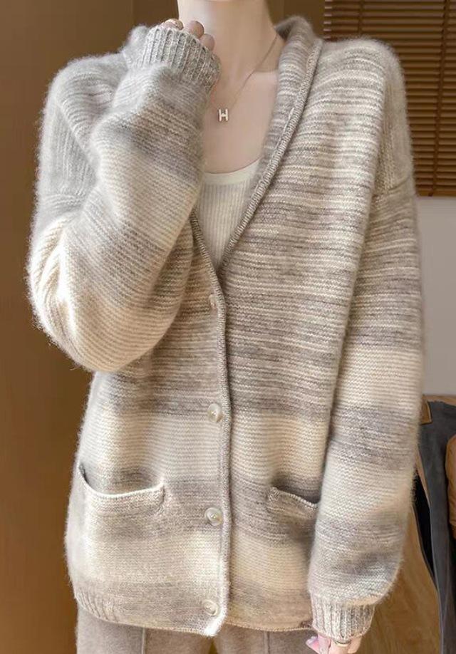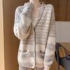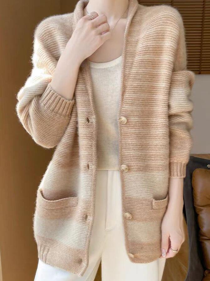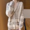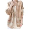 Otoño 2025 Nuevo Estilo Holgado Perezoso Nuevo Cárdigan de Punto Rayado para Mujer con Cuello en V y Bloque de Color con Bolsillos Ropa Exterior Tejida