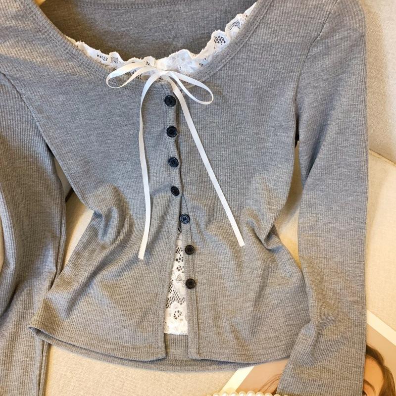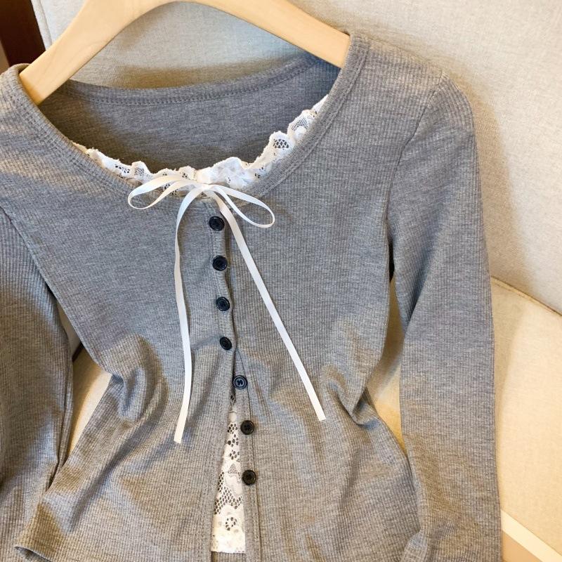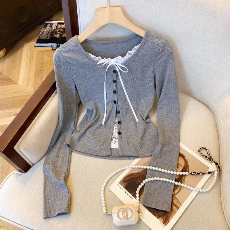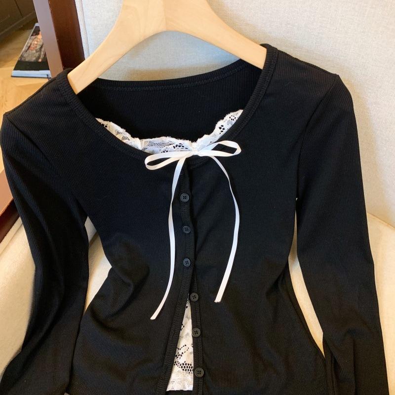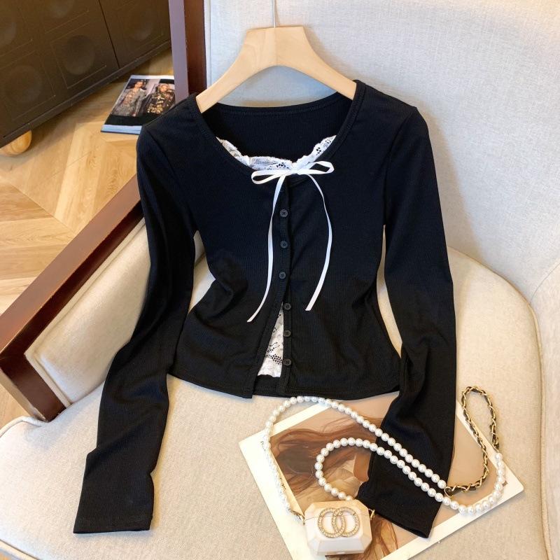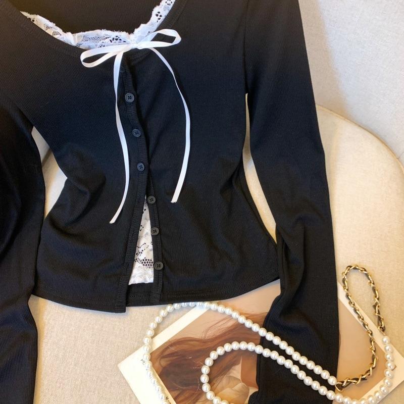 En la toma real ~ Camiseta de manga larga coreana pura want fake para mujer, otoño e invierno, chaqueta de encaje de costuras de alta calidad