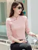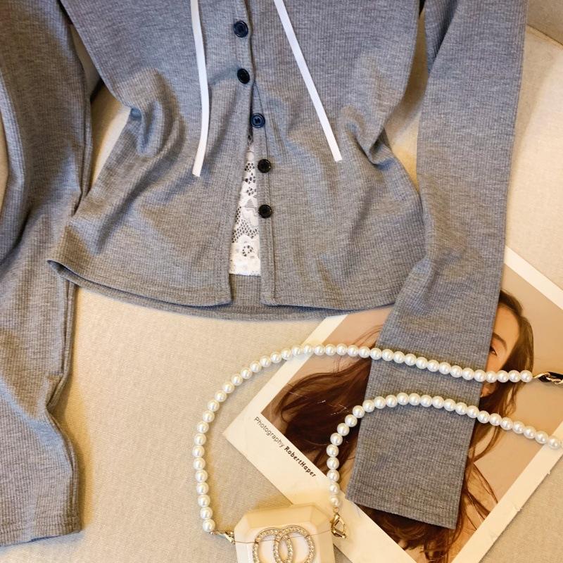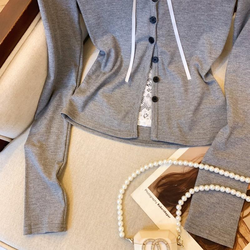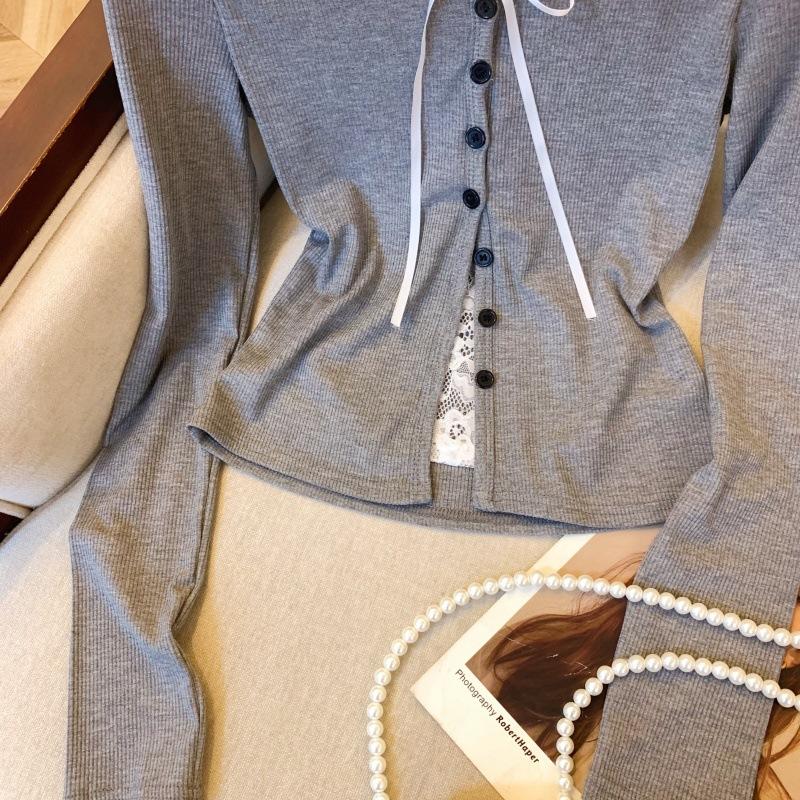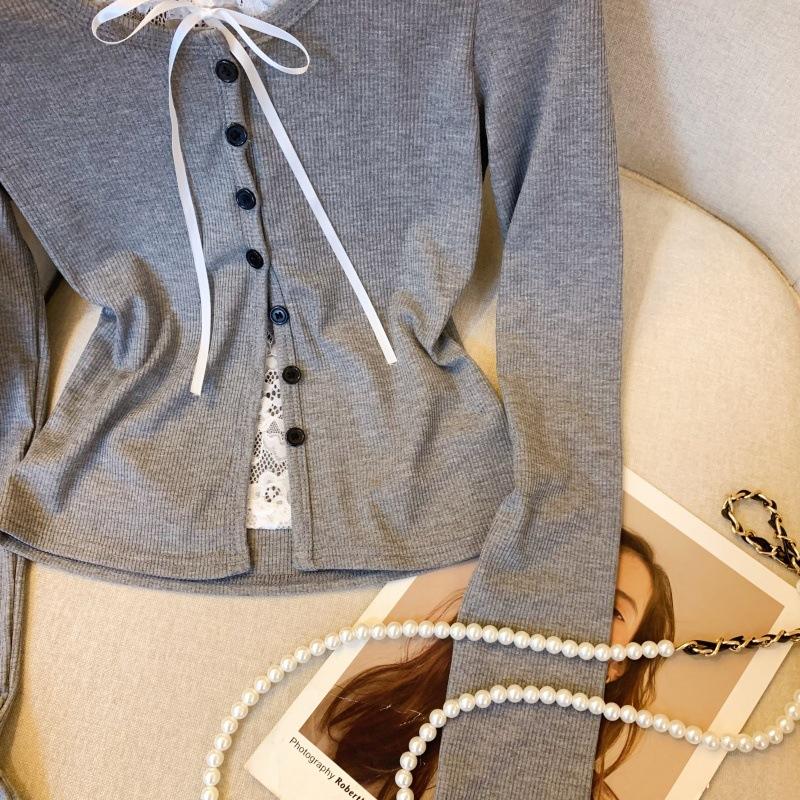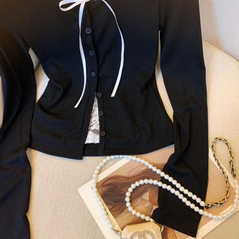 En la toma real ~ Camiseta de manga larga coreana pura want fake para mujer, otoño e invierno, chaqueta de encaje de costuras de alta calidad