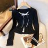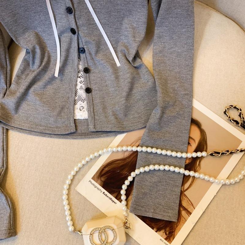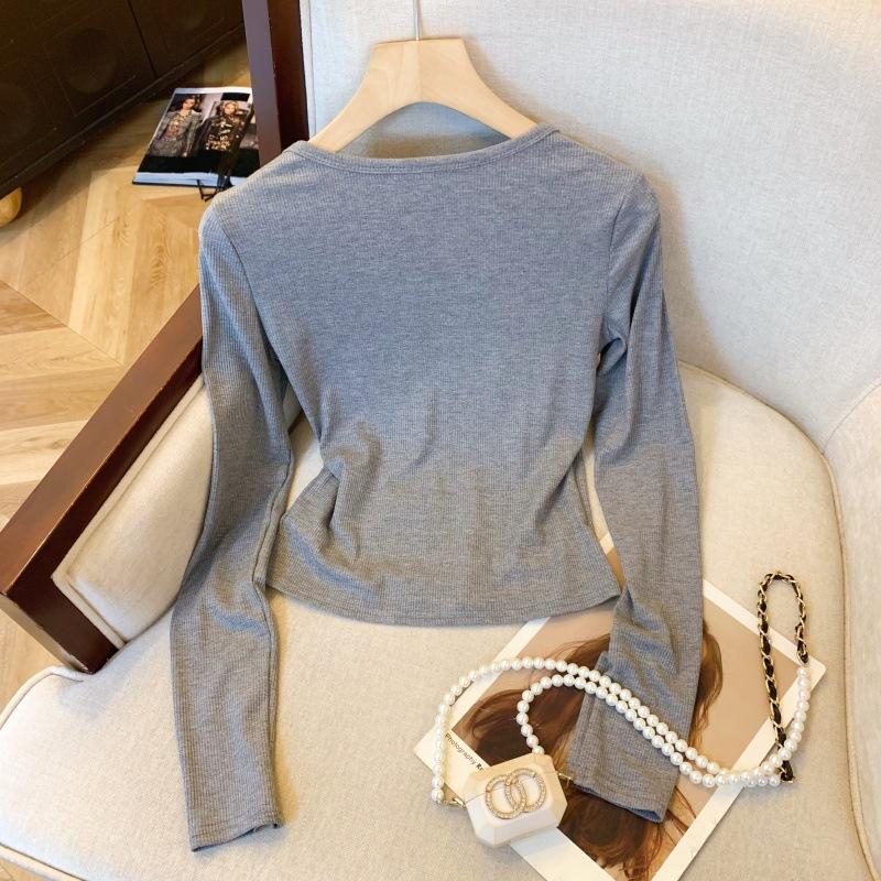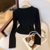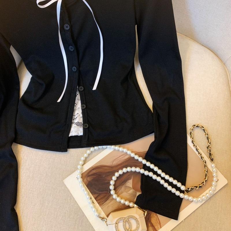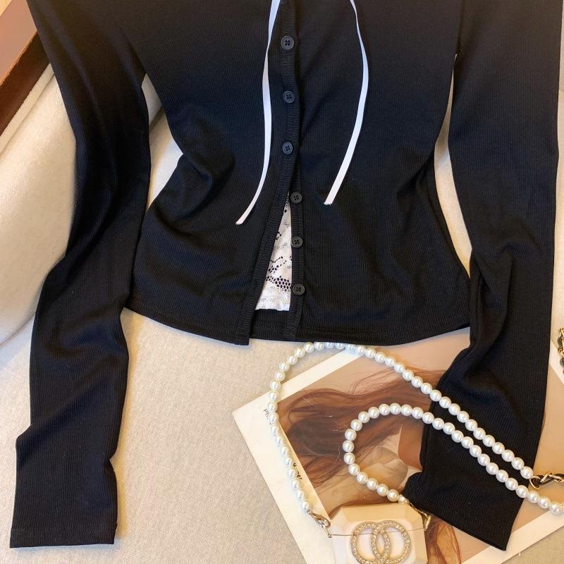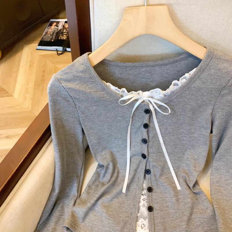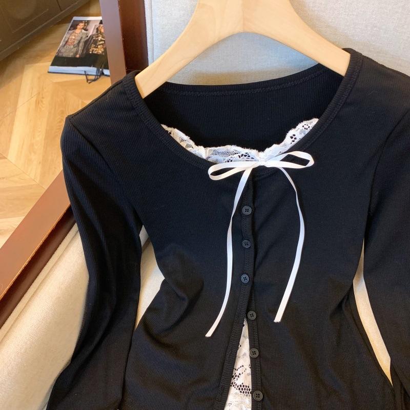 Foto en mano~ Camiseta básica de manga larga de dos piezas estilo coreano puro y sexy para mujer otoño/invierno, top de encaje patchwork de alta gama