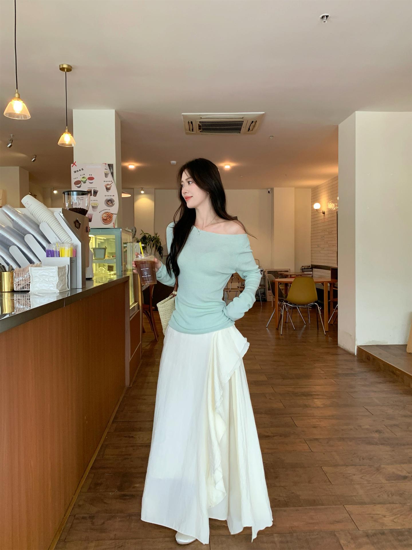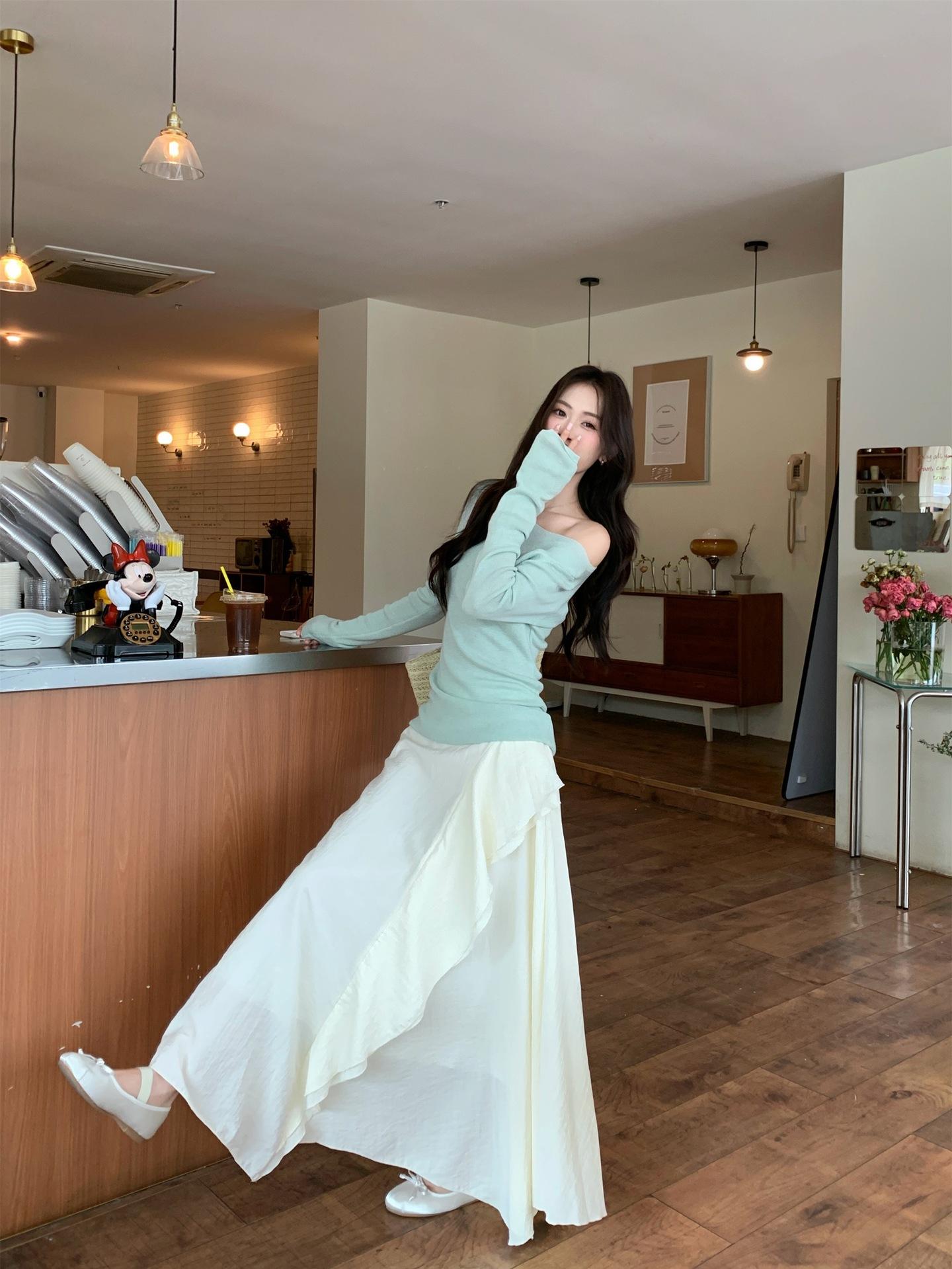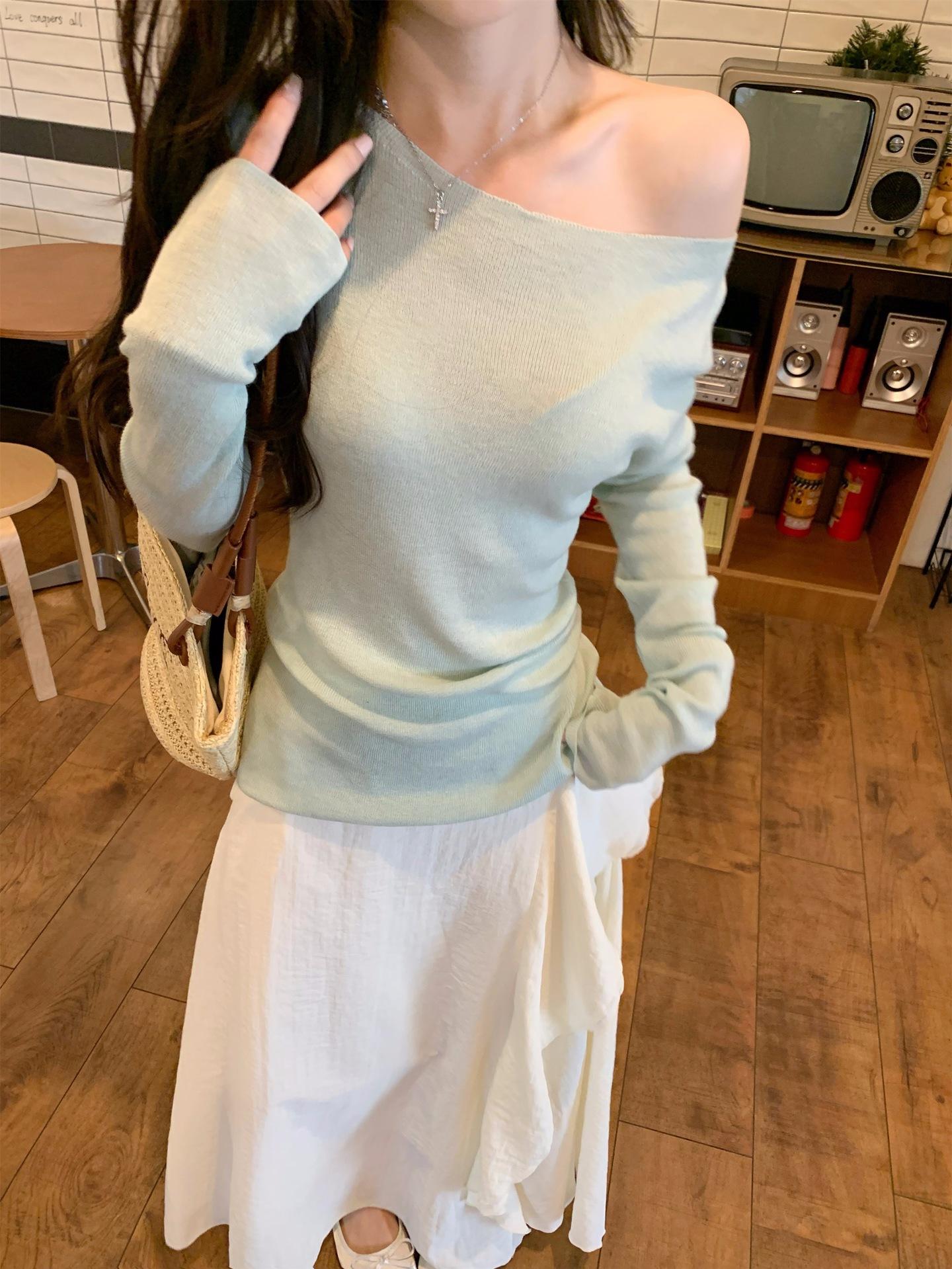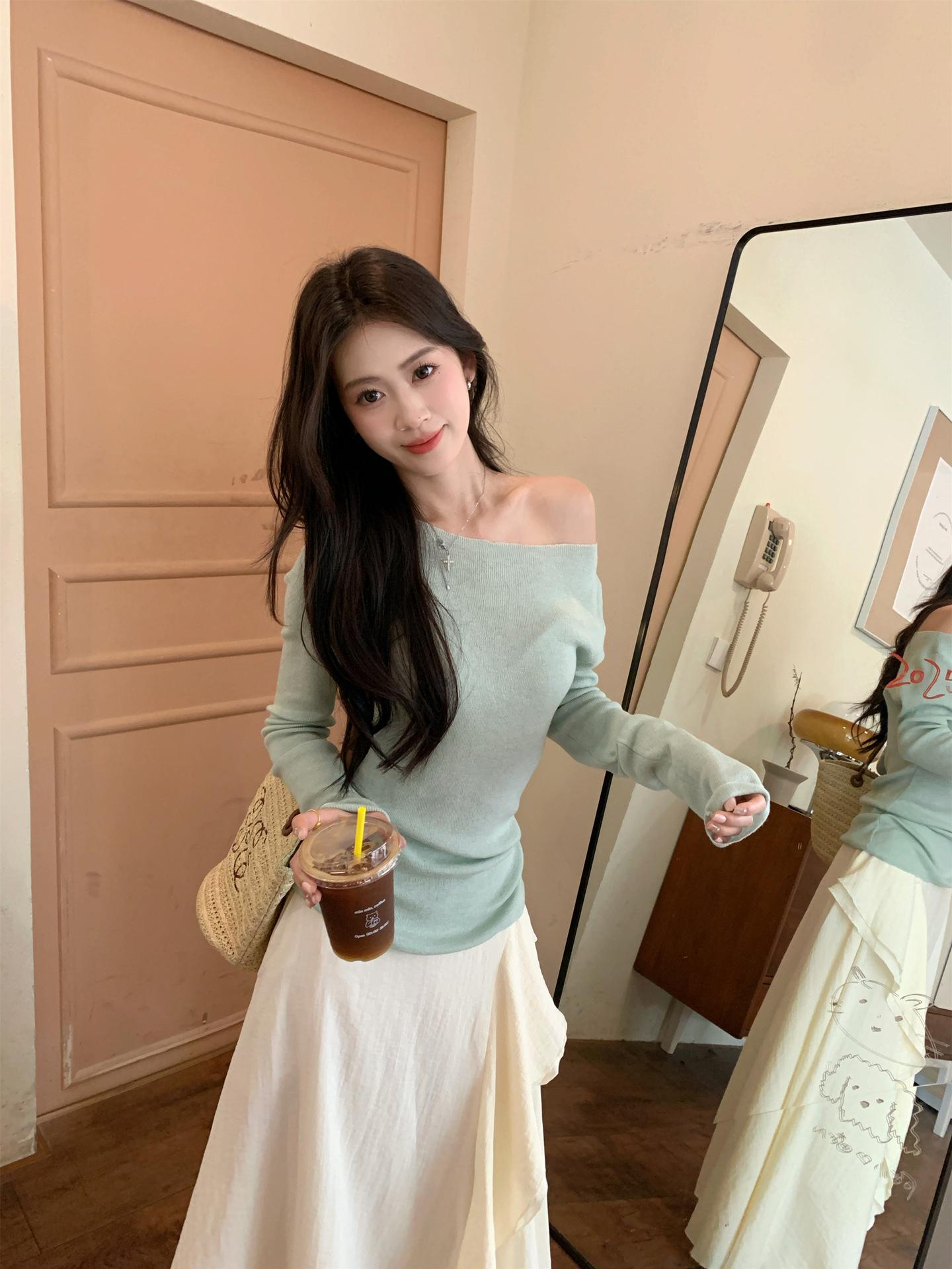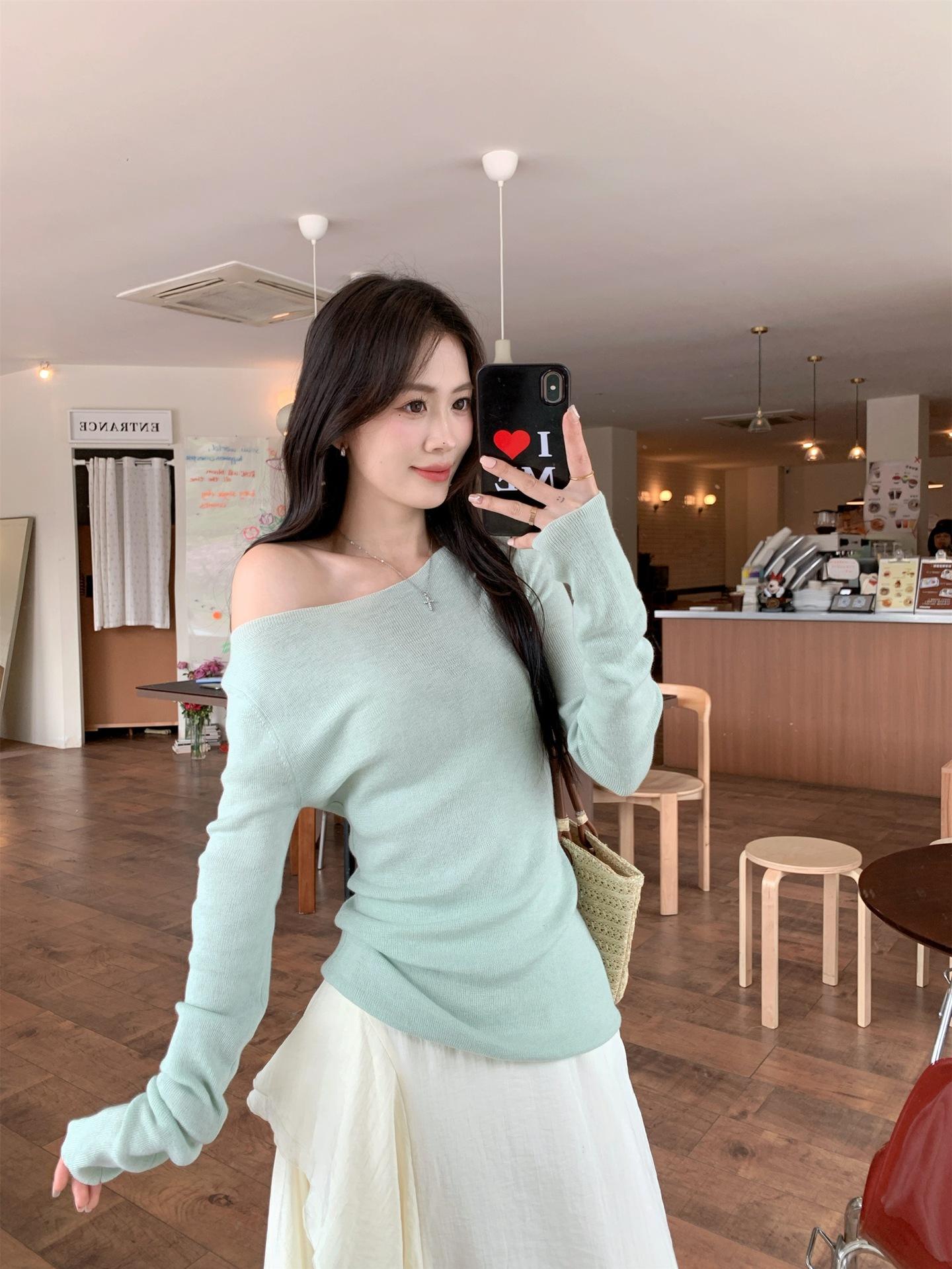 Playera de Punto Irregular Verde con Hombro Descubierto y Manga Larga para Mujer Primavera Ajustada Cintura Ceñida Interior Spice Girl Ajustada Top Base