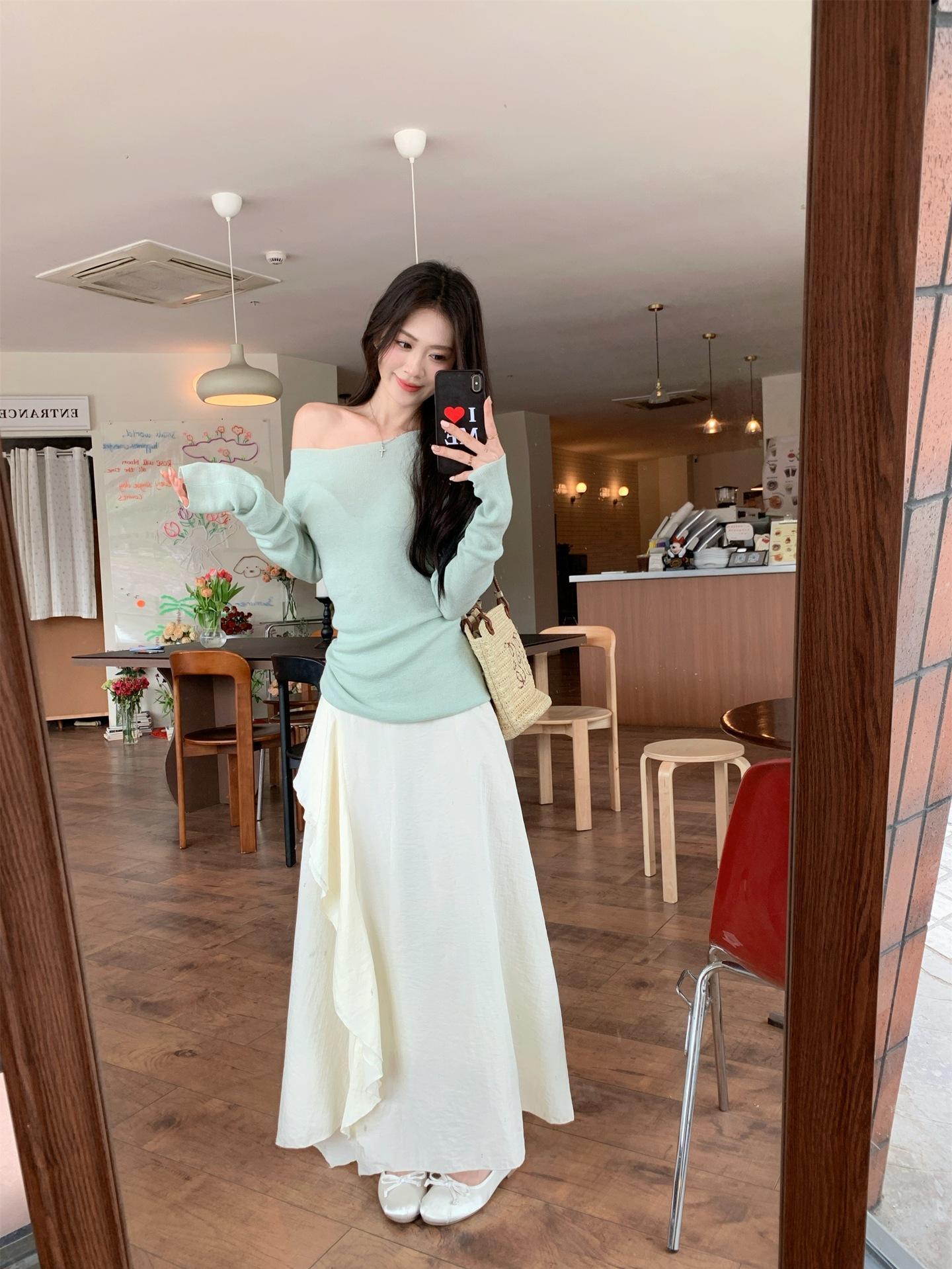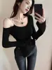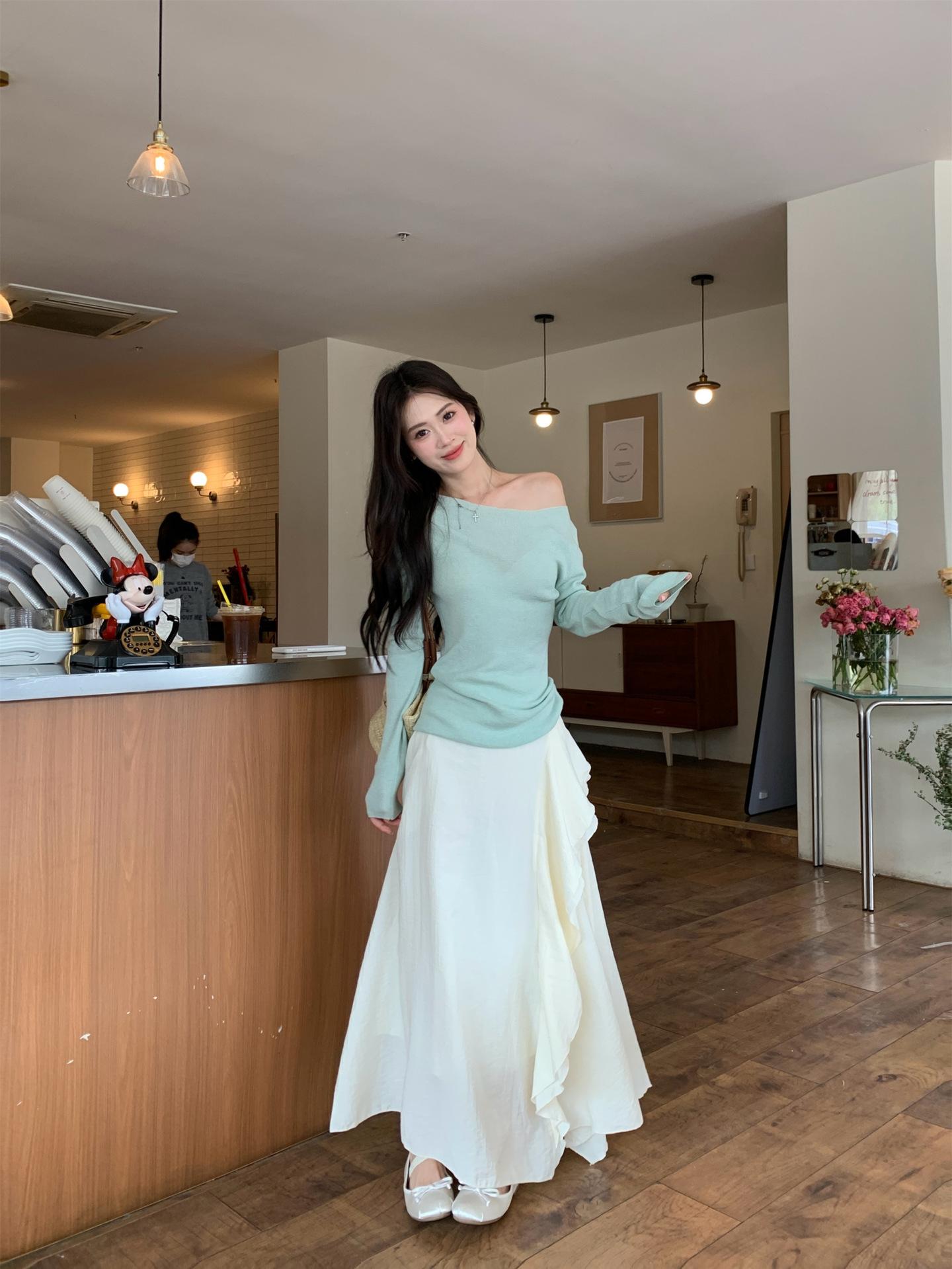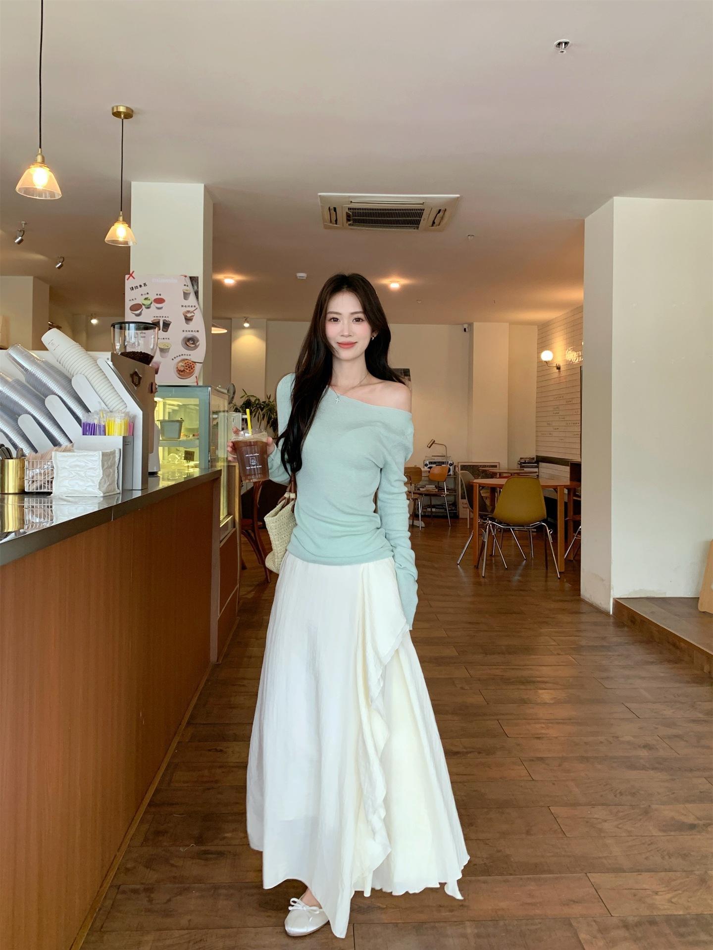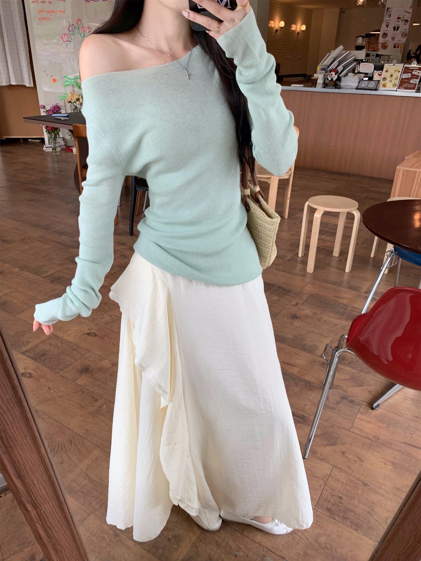 Playera de Punto Irregular Verde con Hombro Descubierto y Manga Larga para Mujer Primavera Ajustada Cintura Ceñida Interior Spice Girl Ajustada Top Base