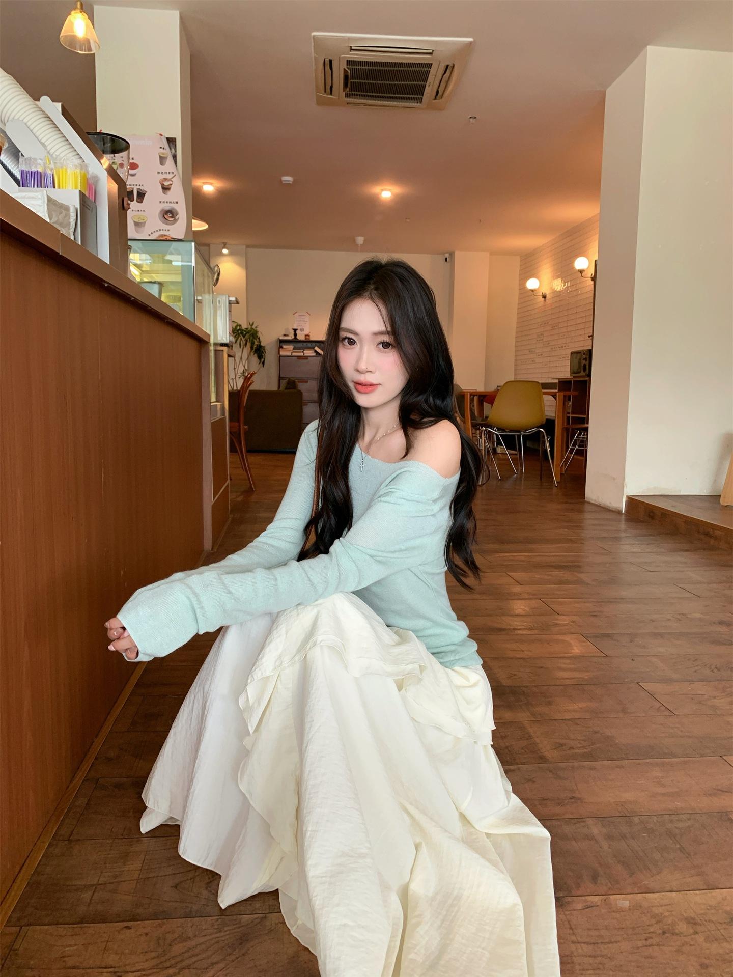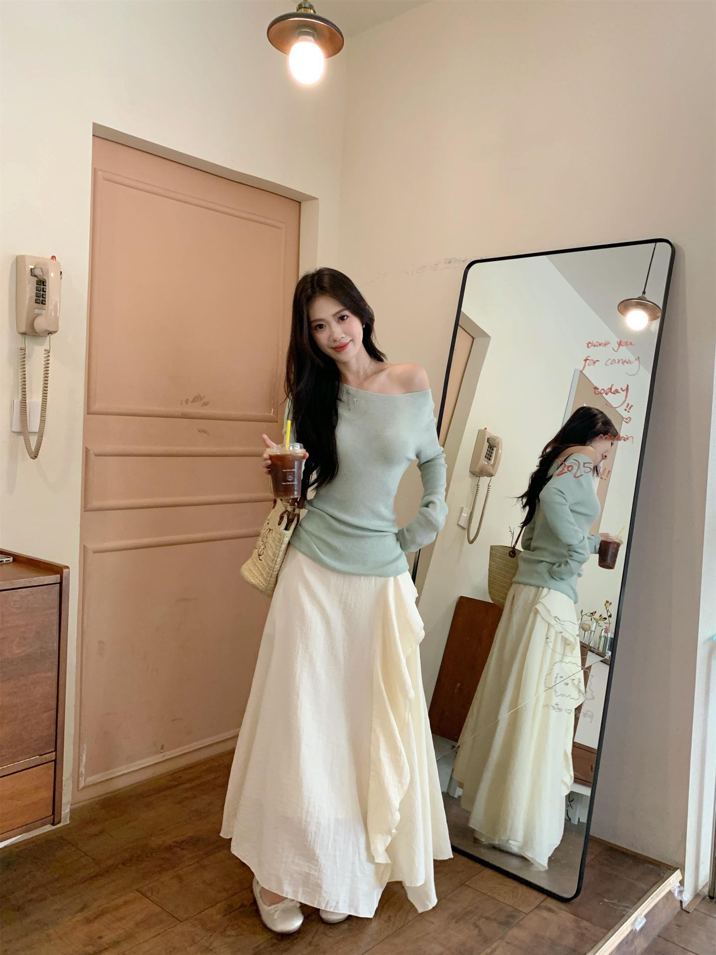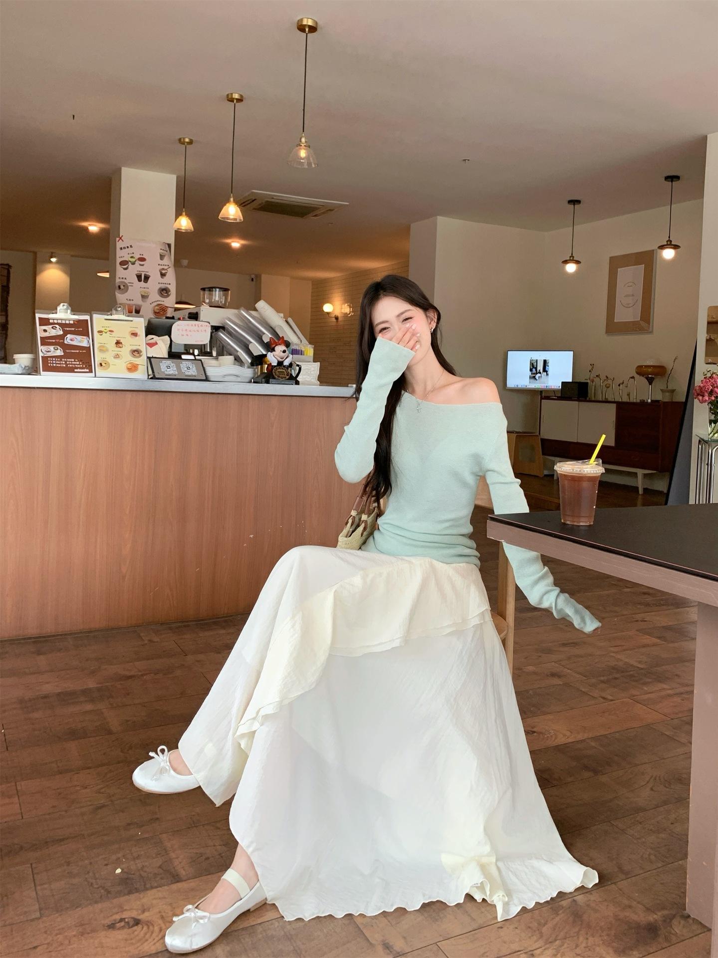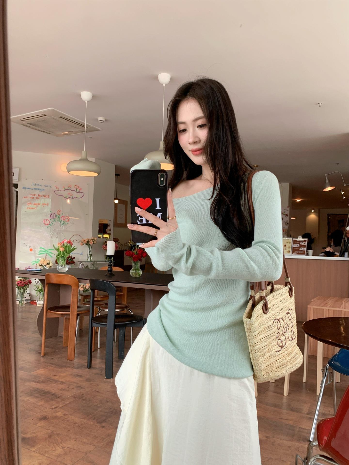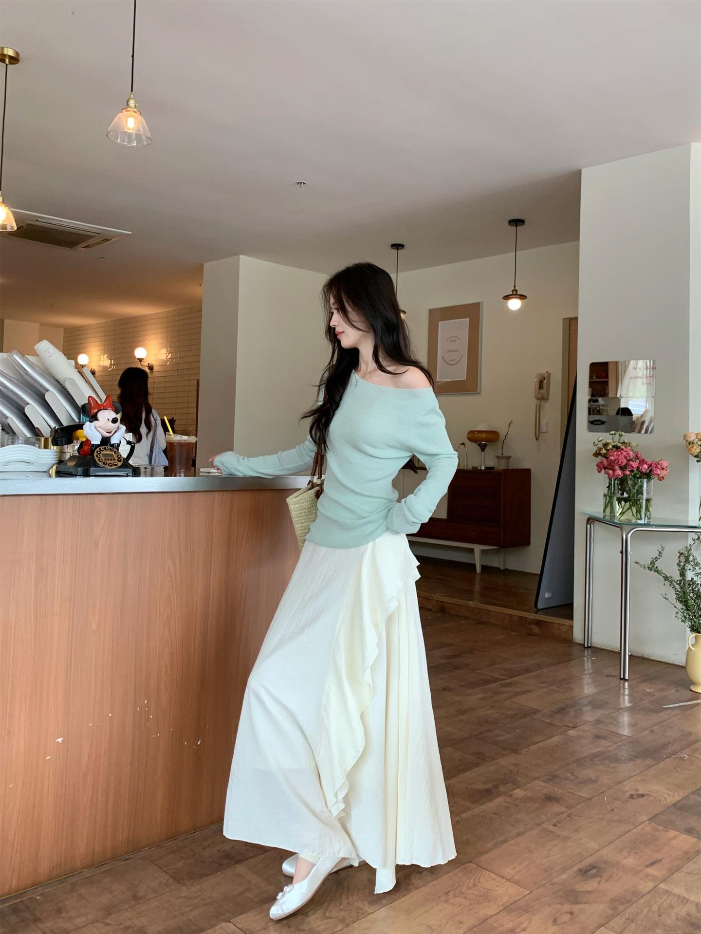 Playera de Punto Irregular Verde con Hombro Descubierto y Manga Larga para Mujer Primavera Ajustada Cintura Ceñida Interior Spice Girl Ajustada Top Base