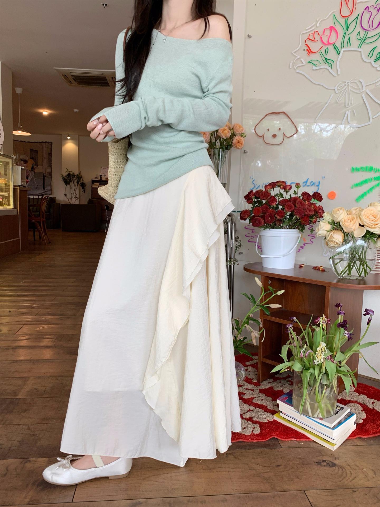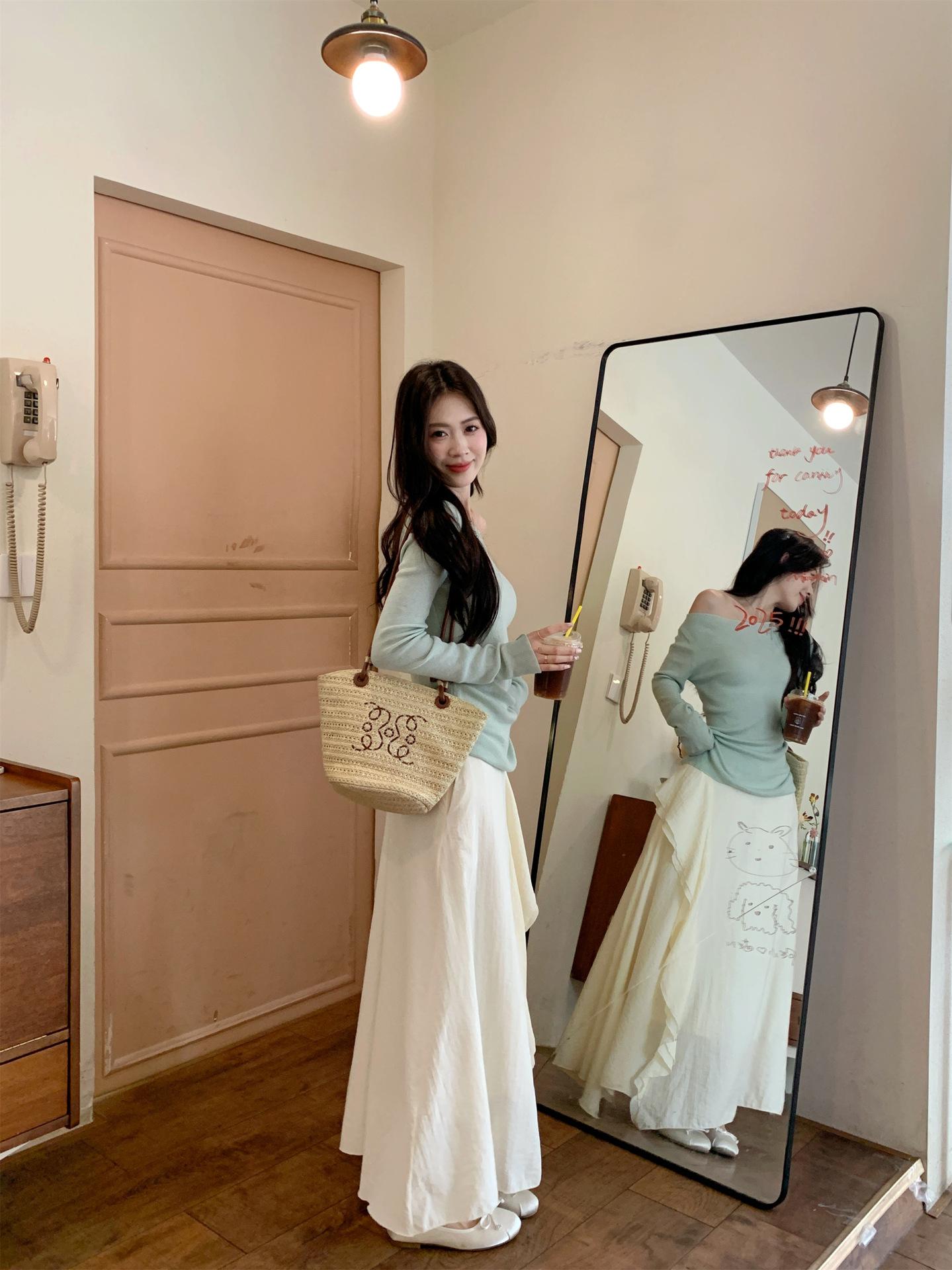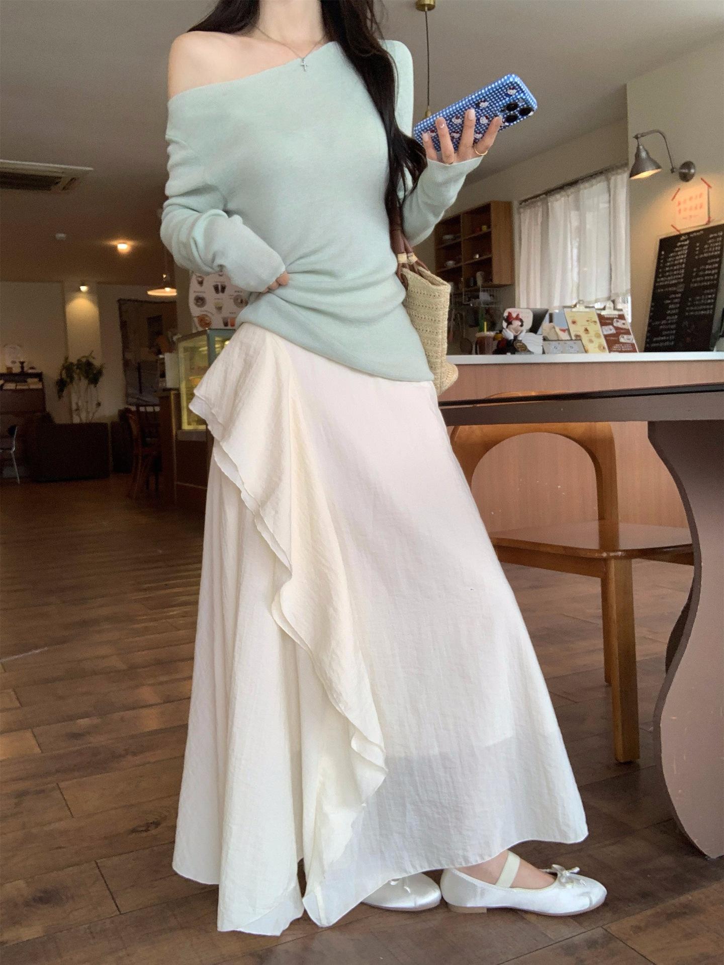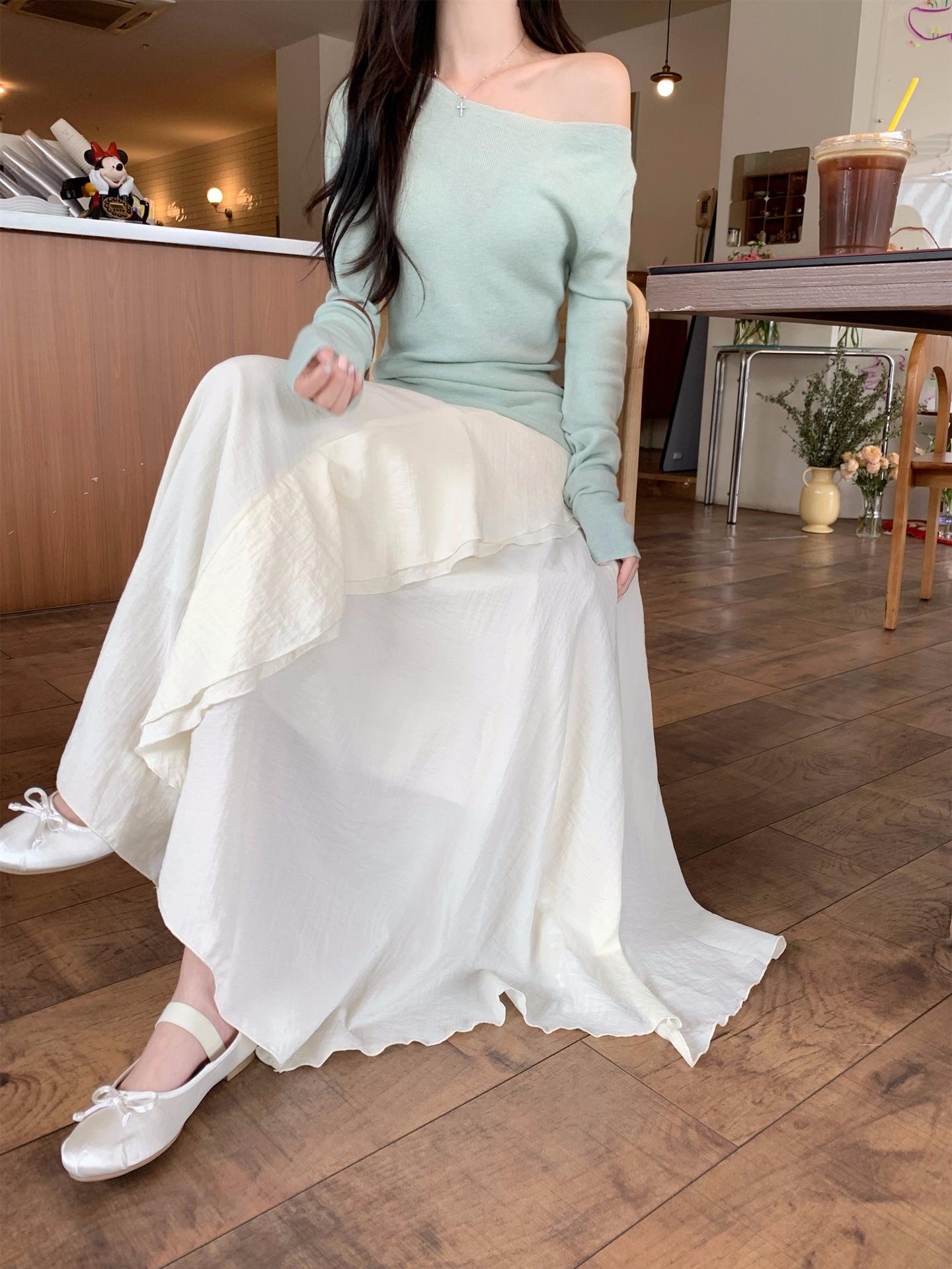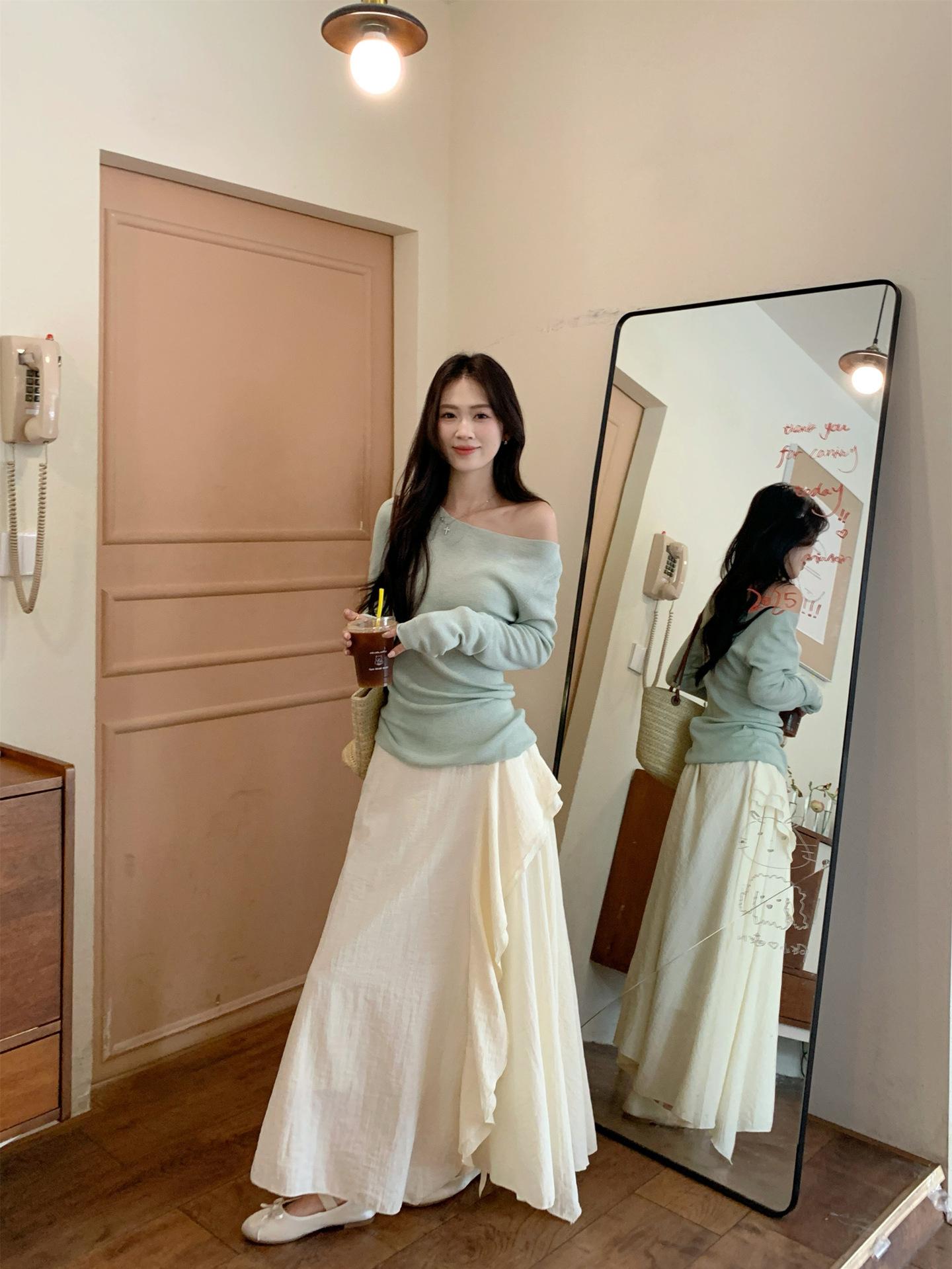 Playera de Punto Irregular Verde con Hombro Descubierto y Manga Larga para Mujer Primavera Ajustada Cintura Ceñida Interior Spice Girl Ajustada Top Base