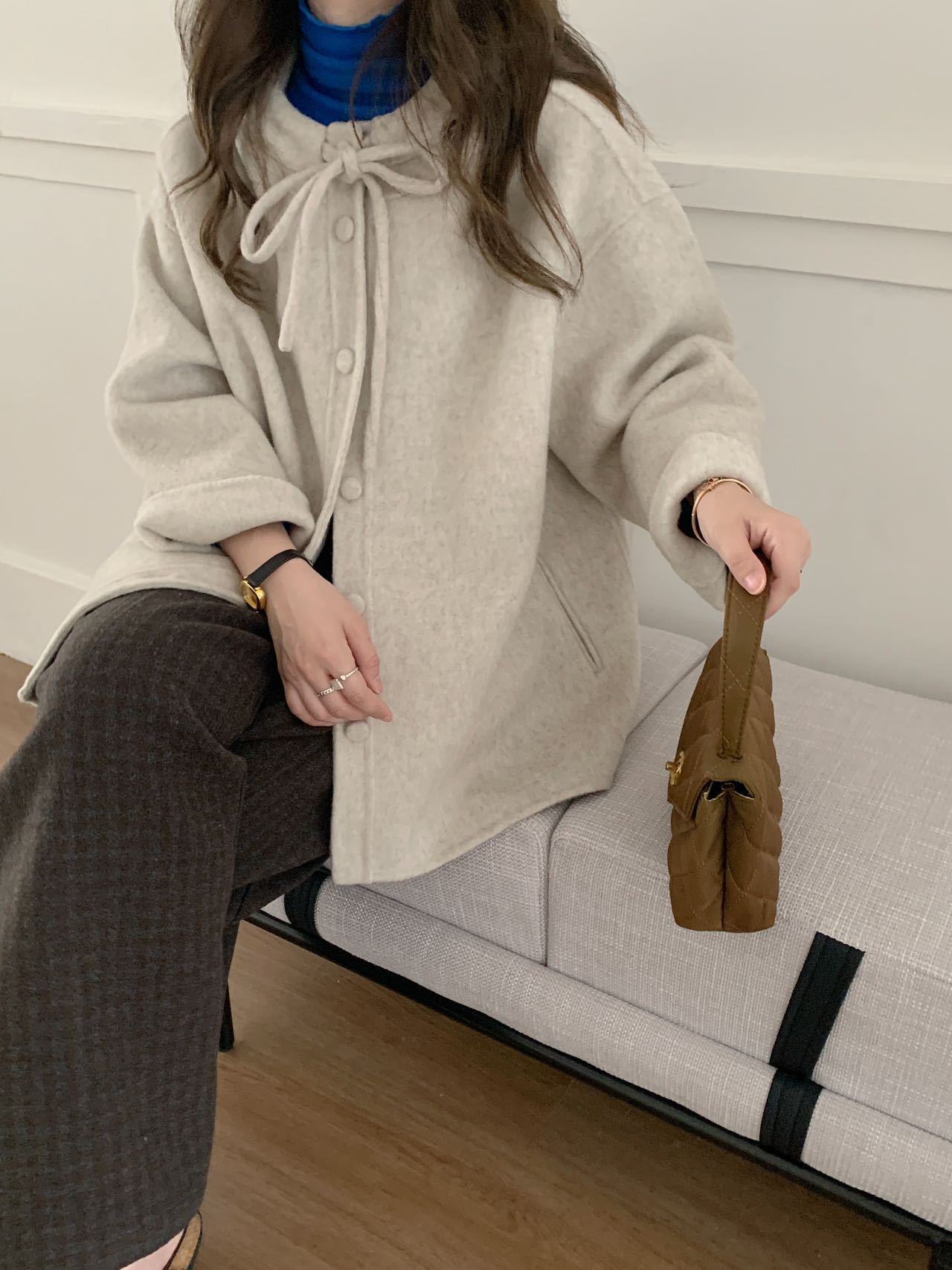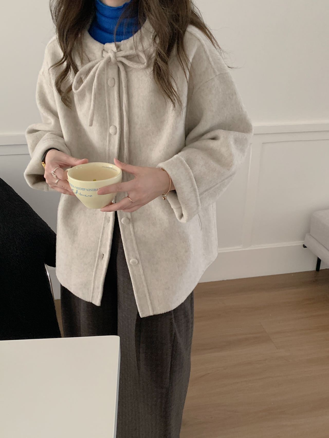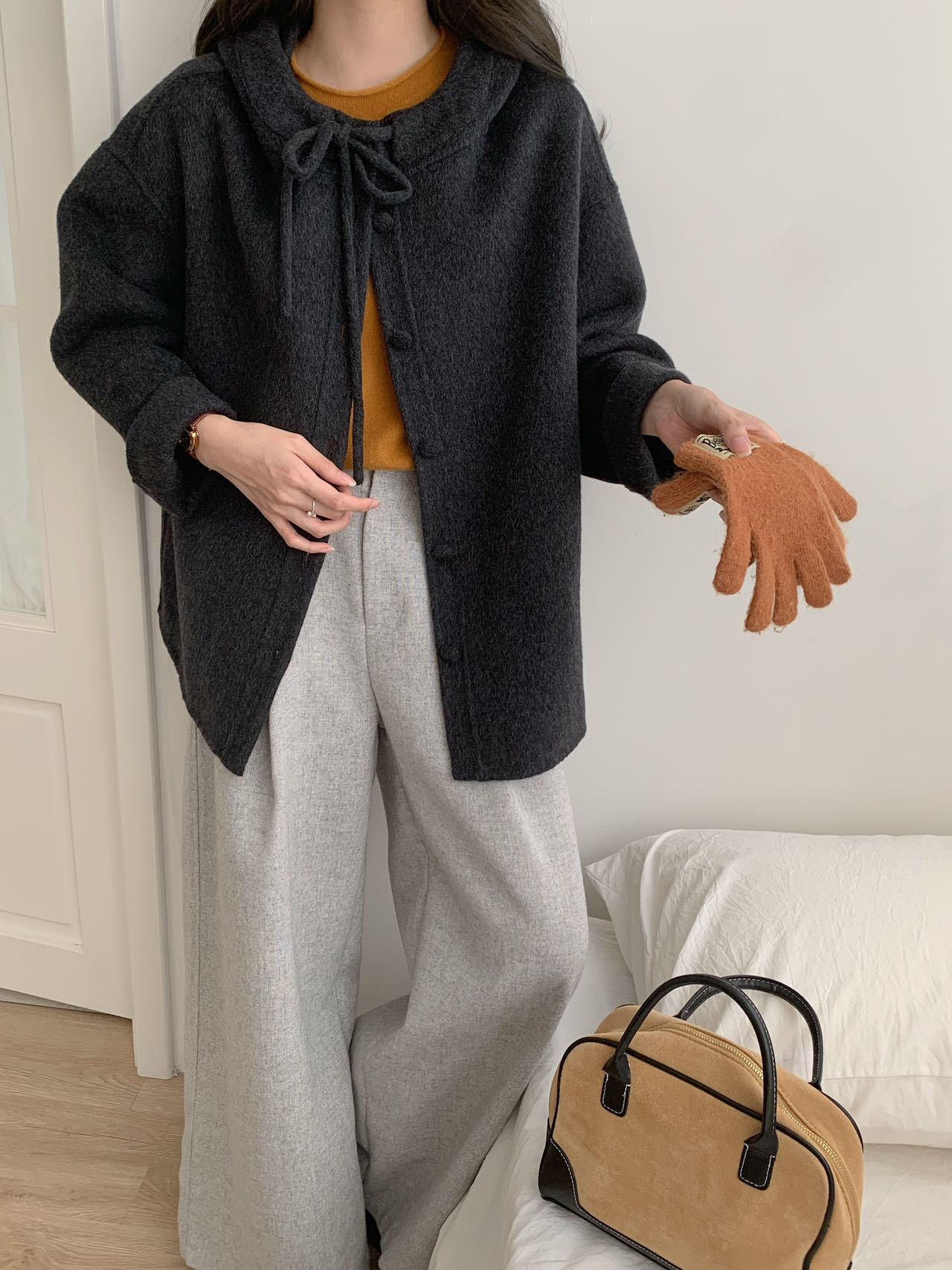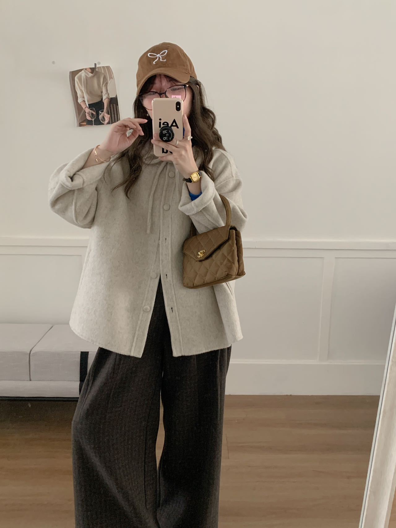 Ahora abrigo de lana doble faz mujer 2025 otoño e invierno nuevo lazo estilo universitario coreano petite con capucha lana out