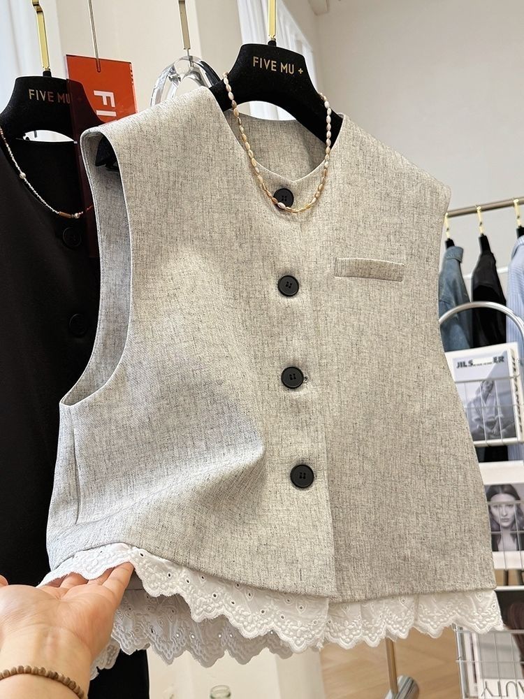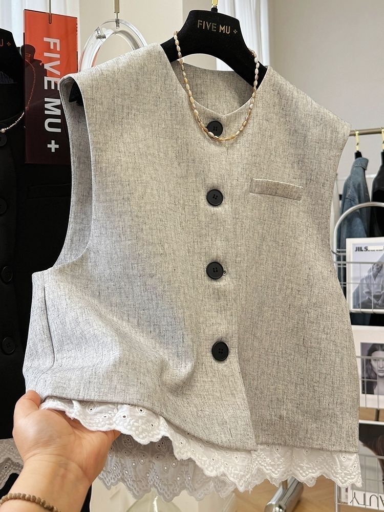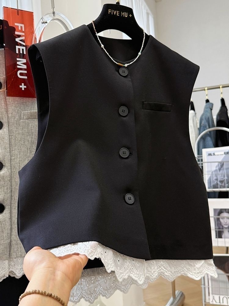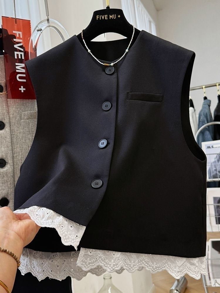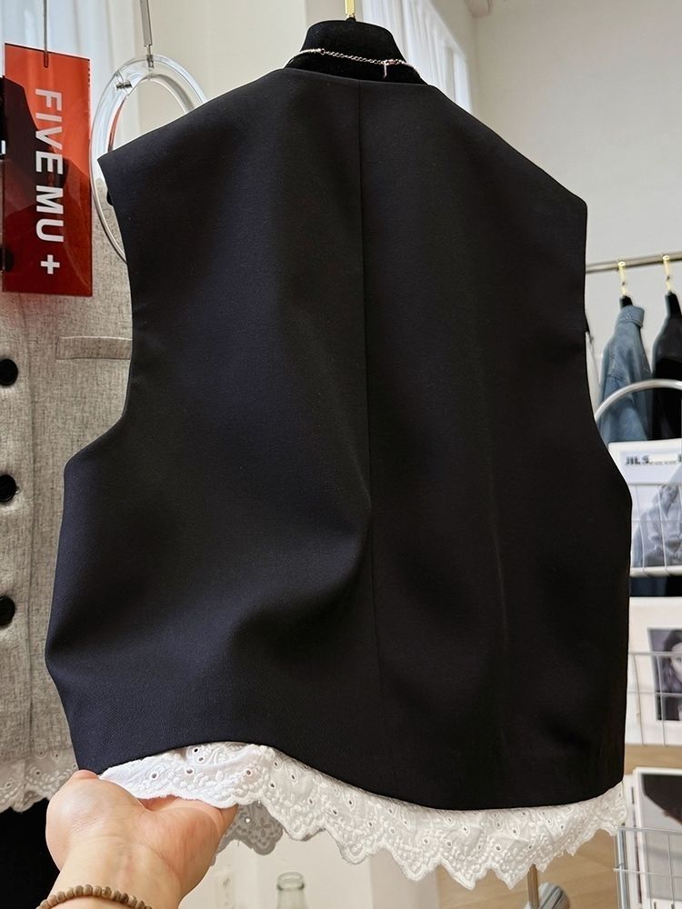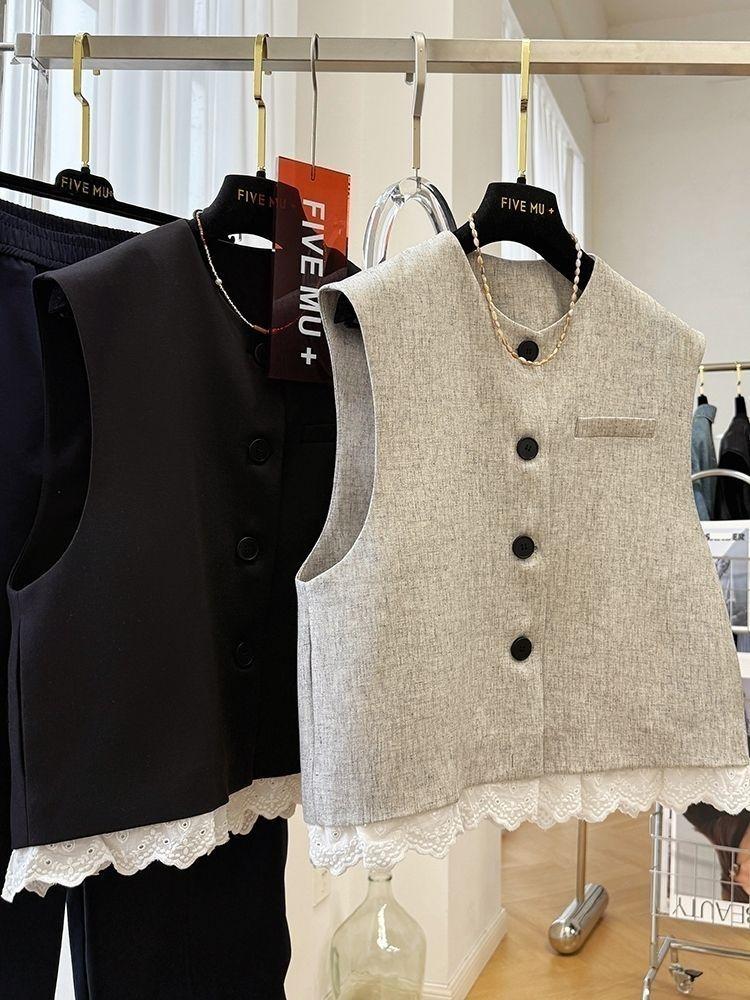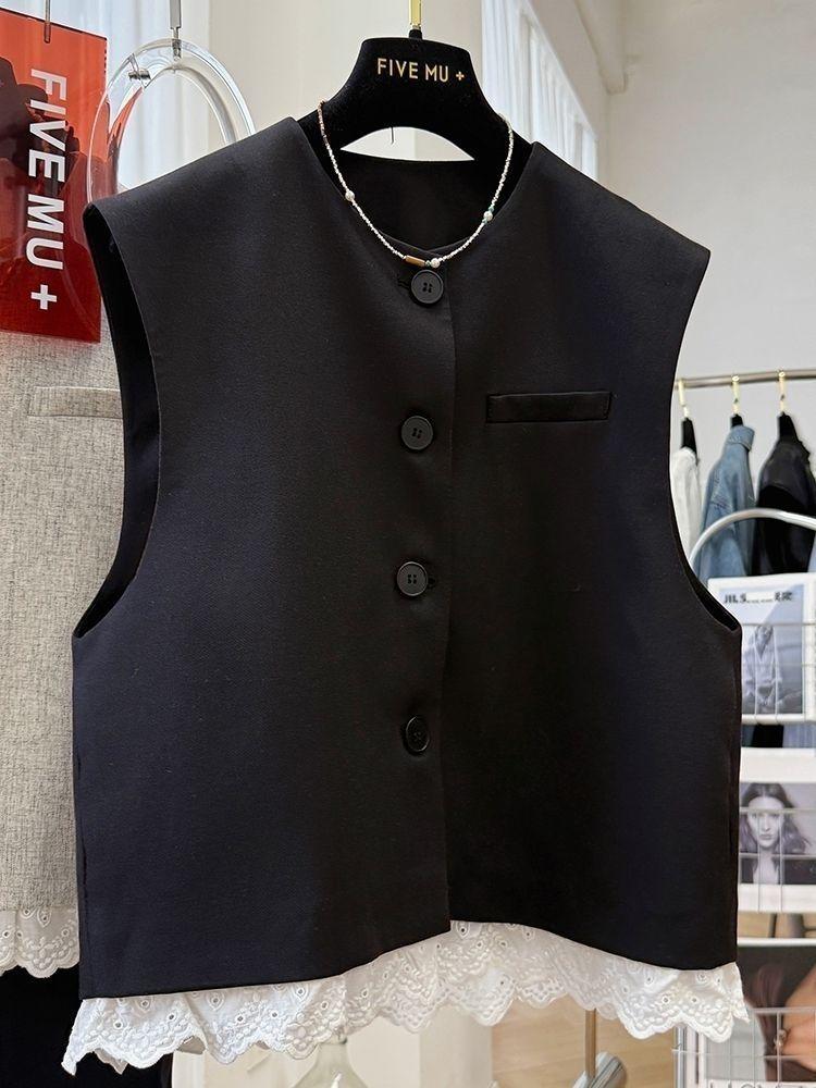 Chaleco de traje coreano de encaje patchwork de temperamento de alta gama para mujer, chaleco exterior sin mangas moderno y elegante