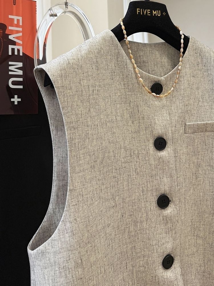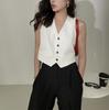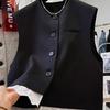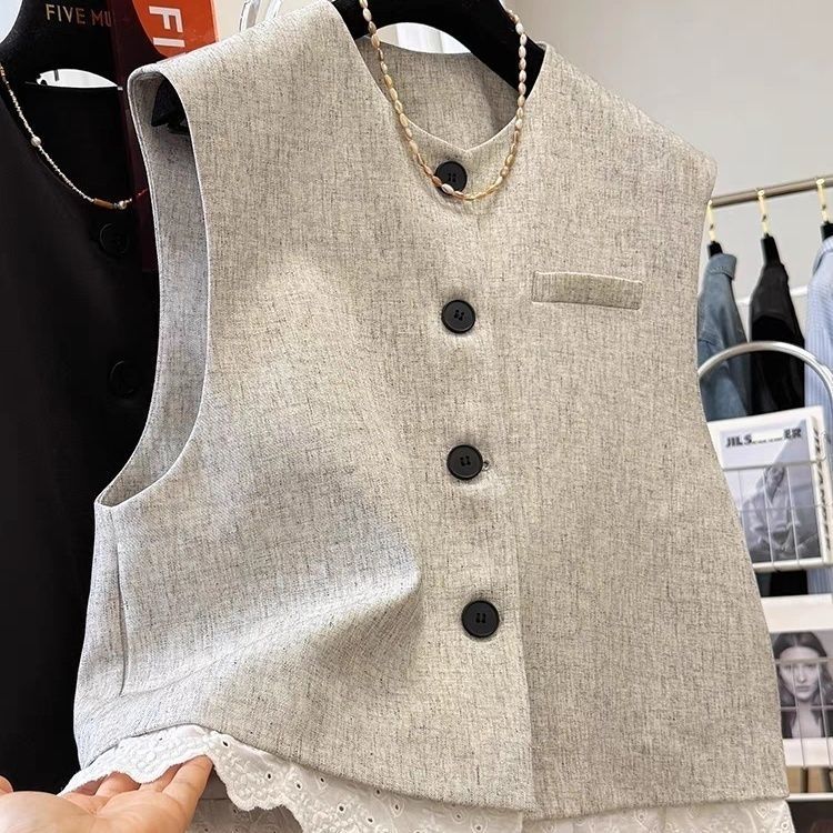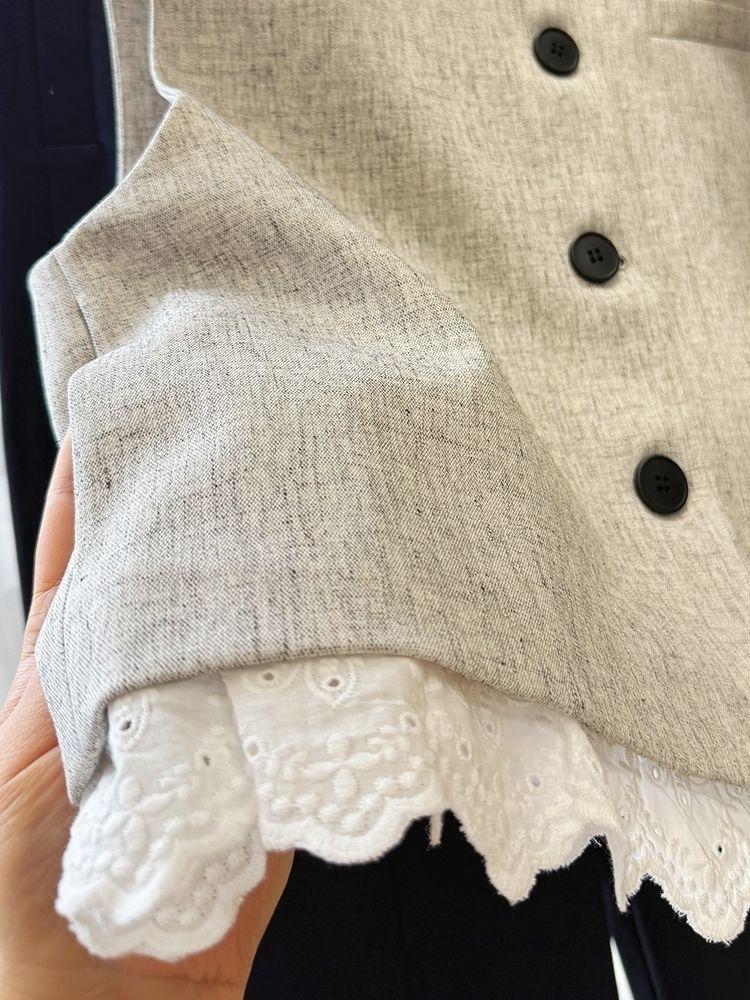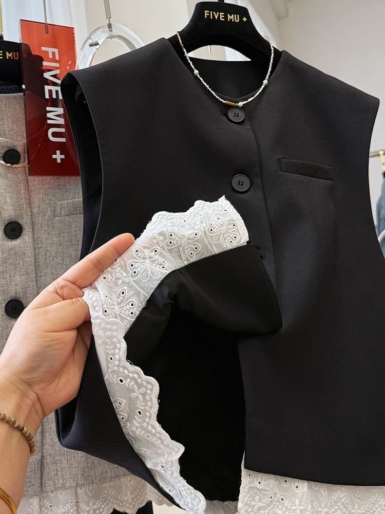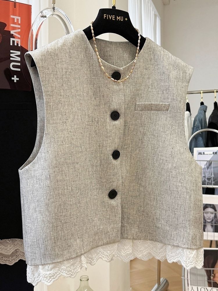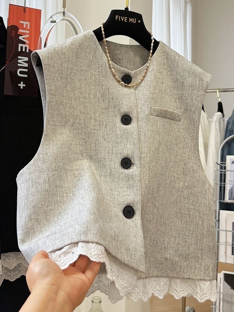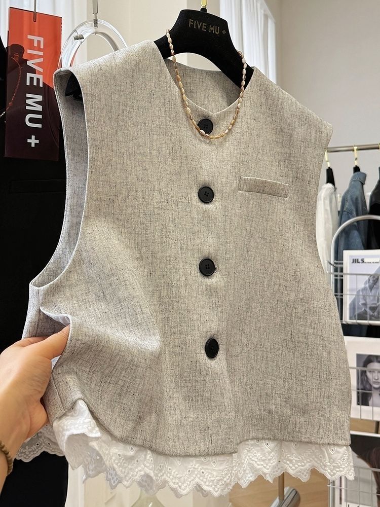 Chaleco de traje coreano de encaje patchwork de temperamento de alta gama para mujer, chaleco exterior sin mangas moderno y elegante