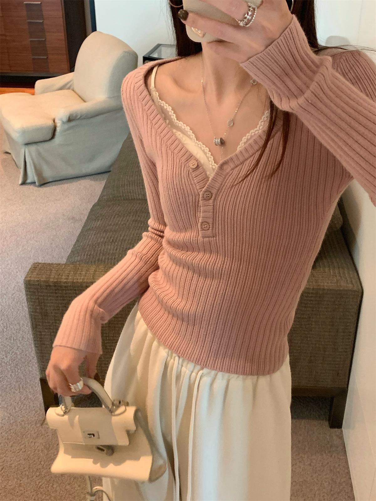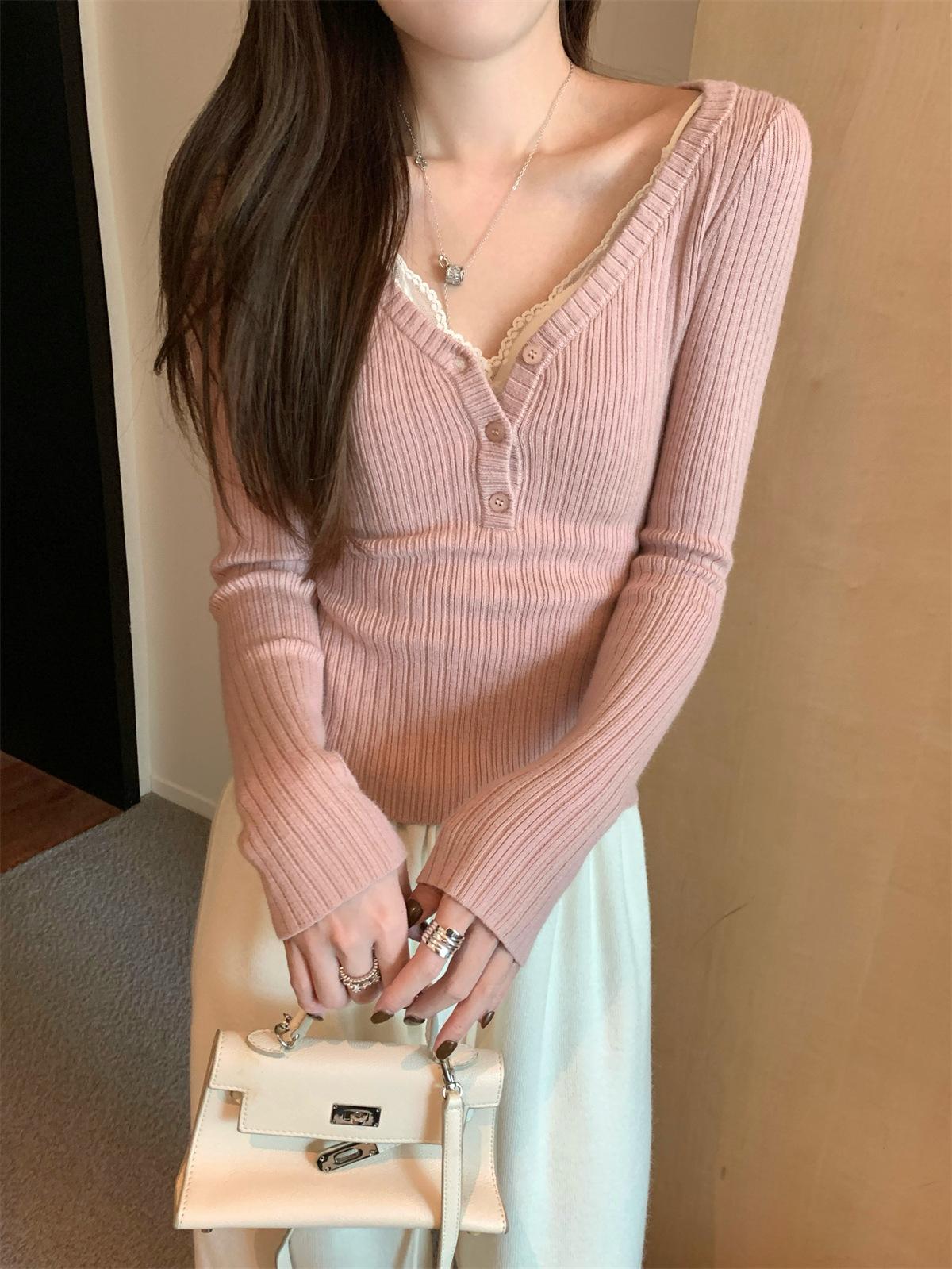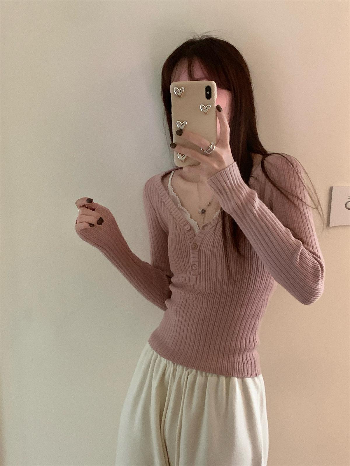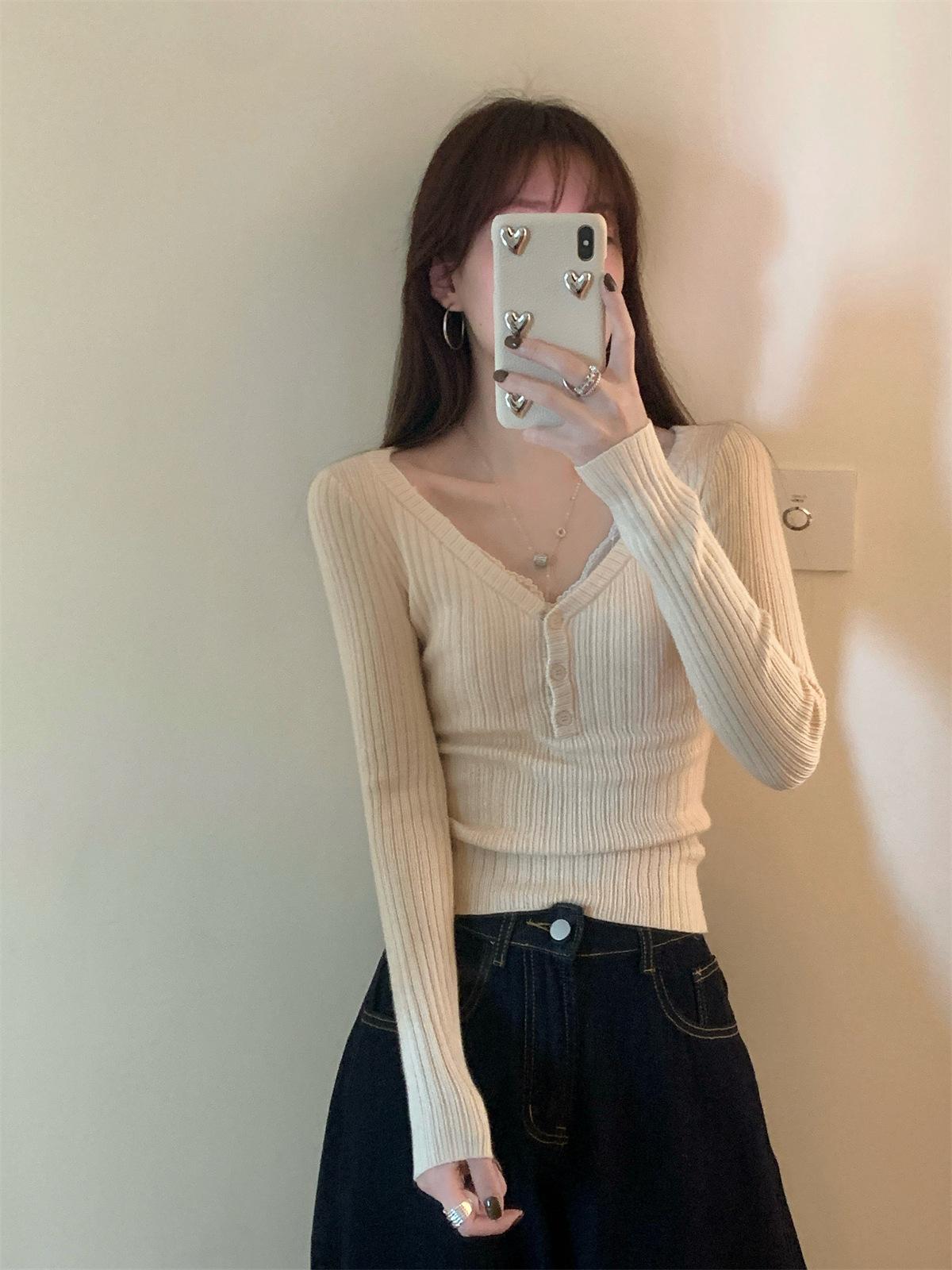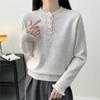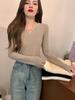 Foto Real Otoño Nuevo Estilo Coreano Temperamento Suave Cuello en V Botón Adelgazante Tejido Camiseta Base Manga Larga Suéter Mujer 88695