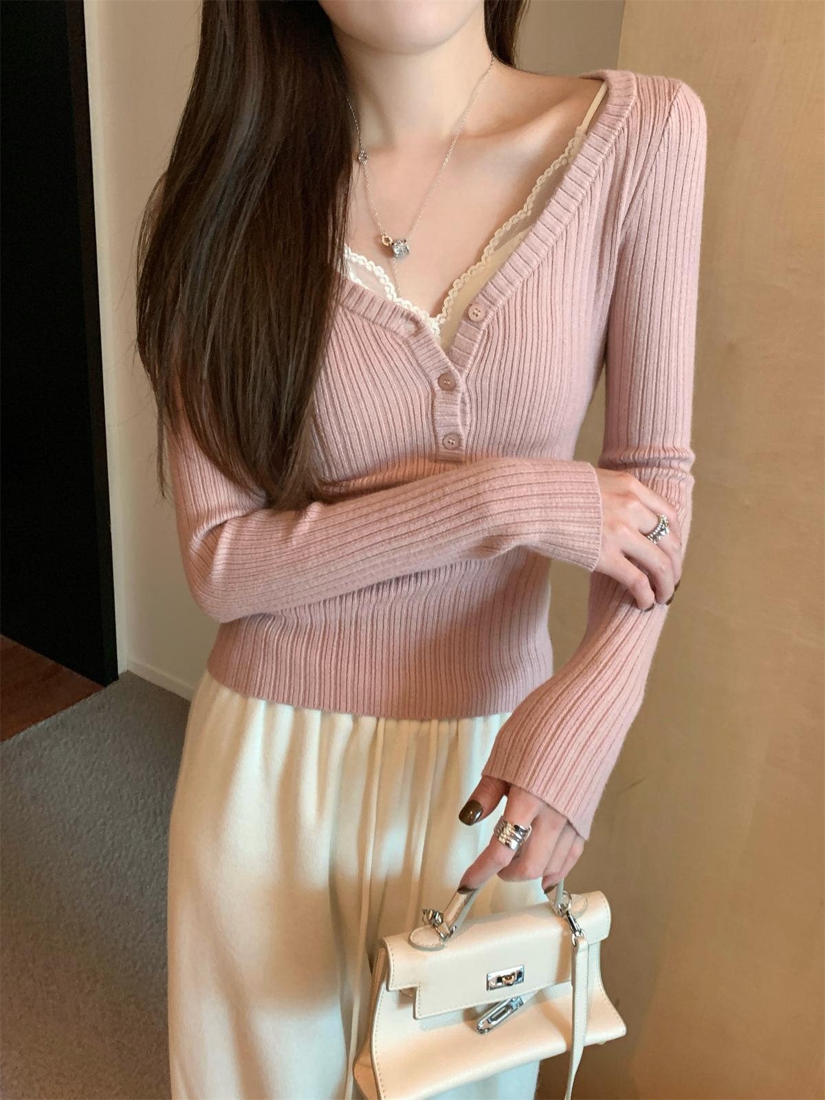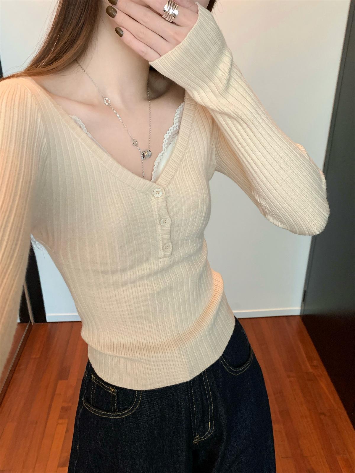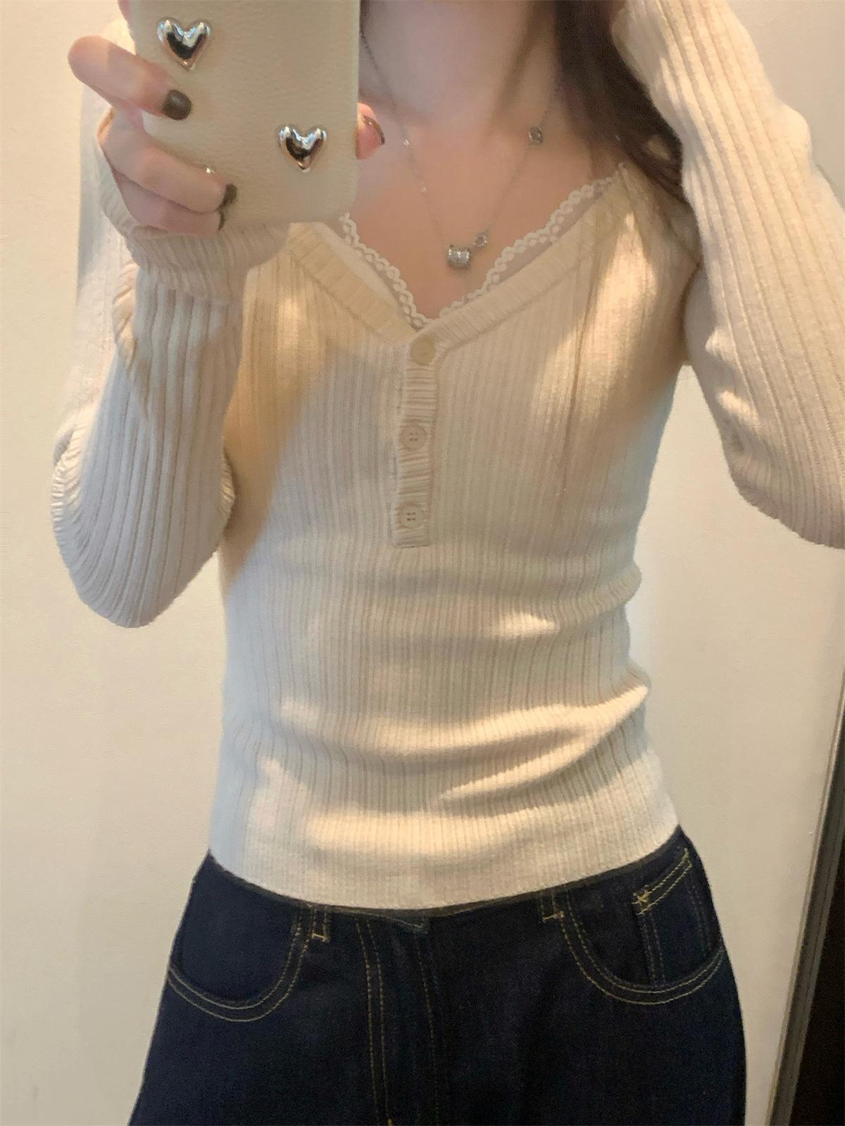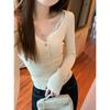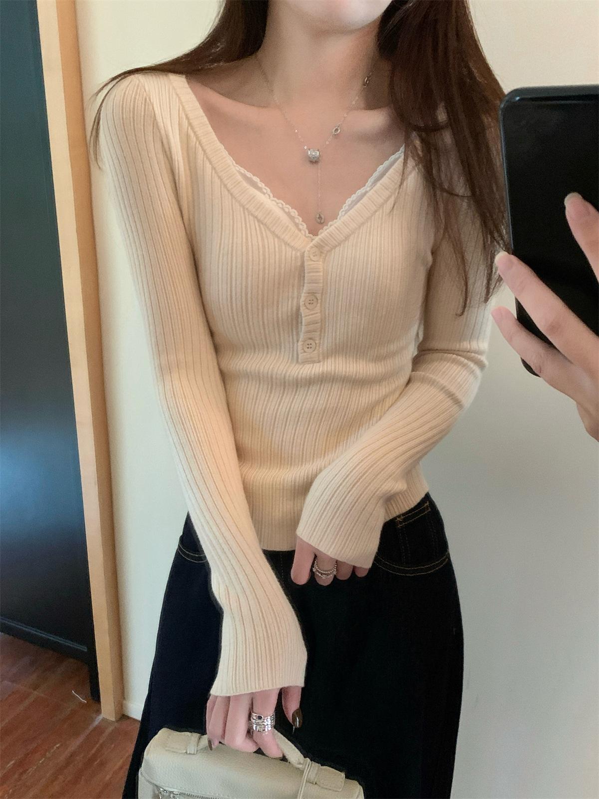 Foto Real Otoño Nuevo Estilo Coreano Temperamento Suave Cuello en V Botón Adelgazante Tejido Camiseta Base Manga Larga Suéter Mujer 88695