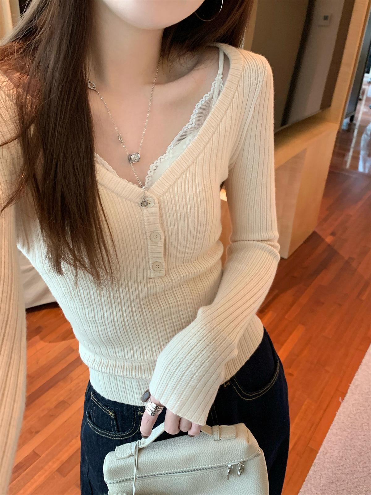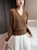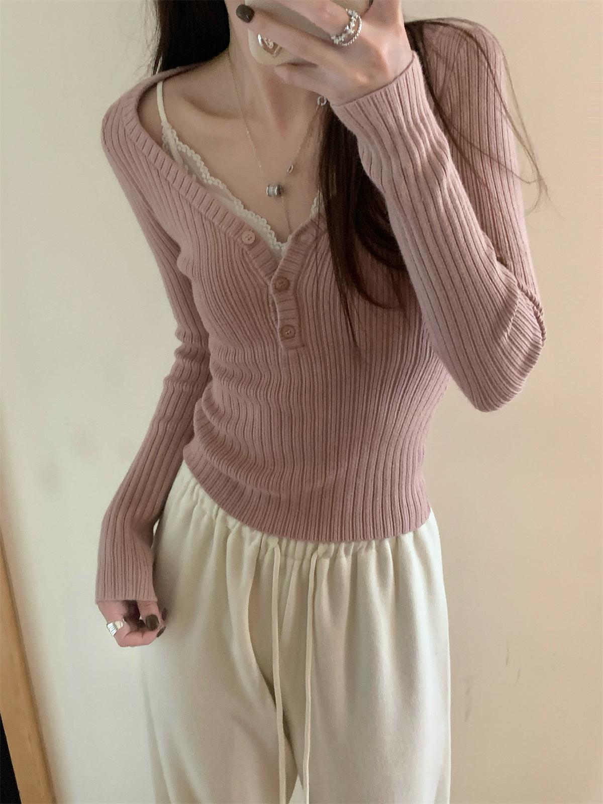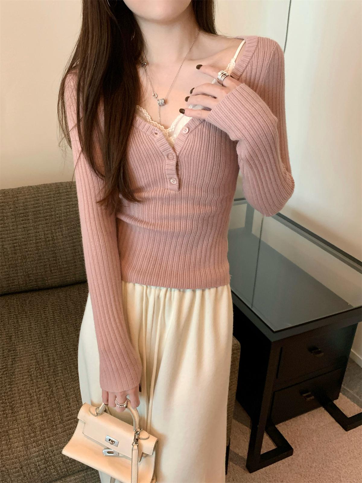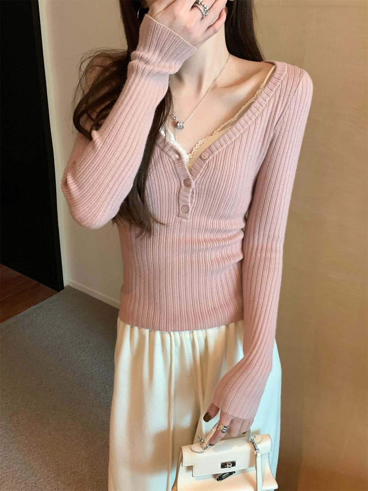 Foto Real Otoño Nuevo Estilo Coreano Temperamento Suave Cuello en V Botón Adelgazante Tejido Camiseta Base Manga Larga Suéter Mujer 88695