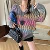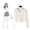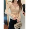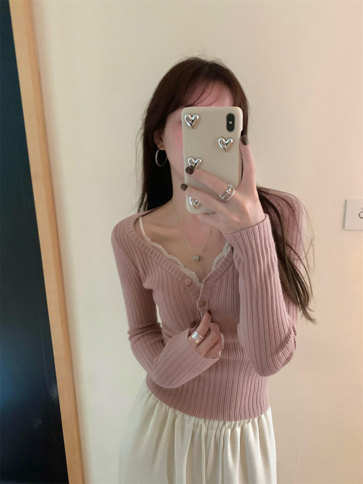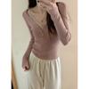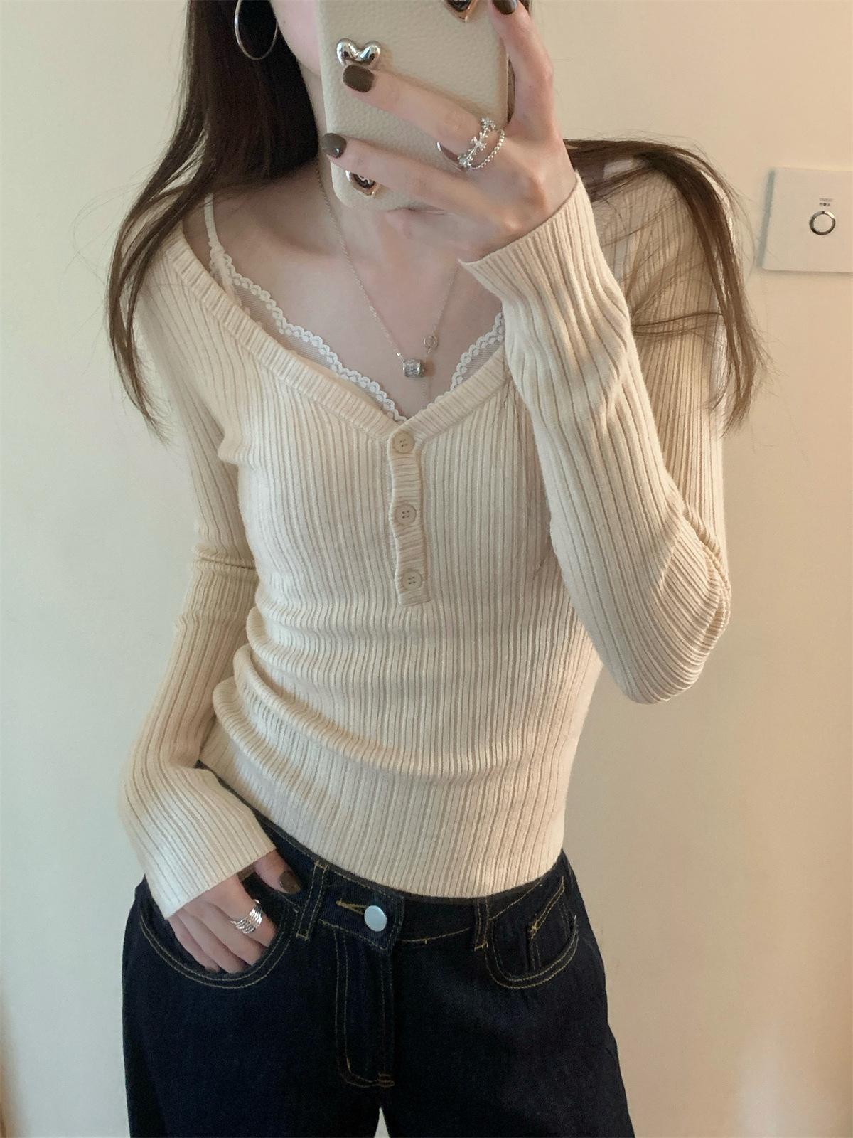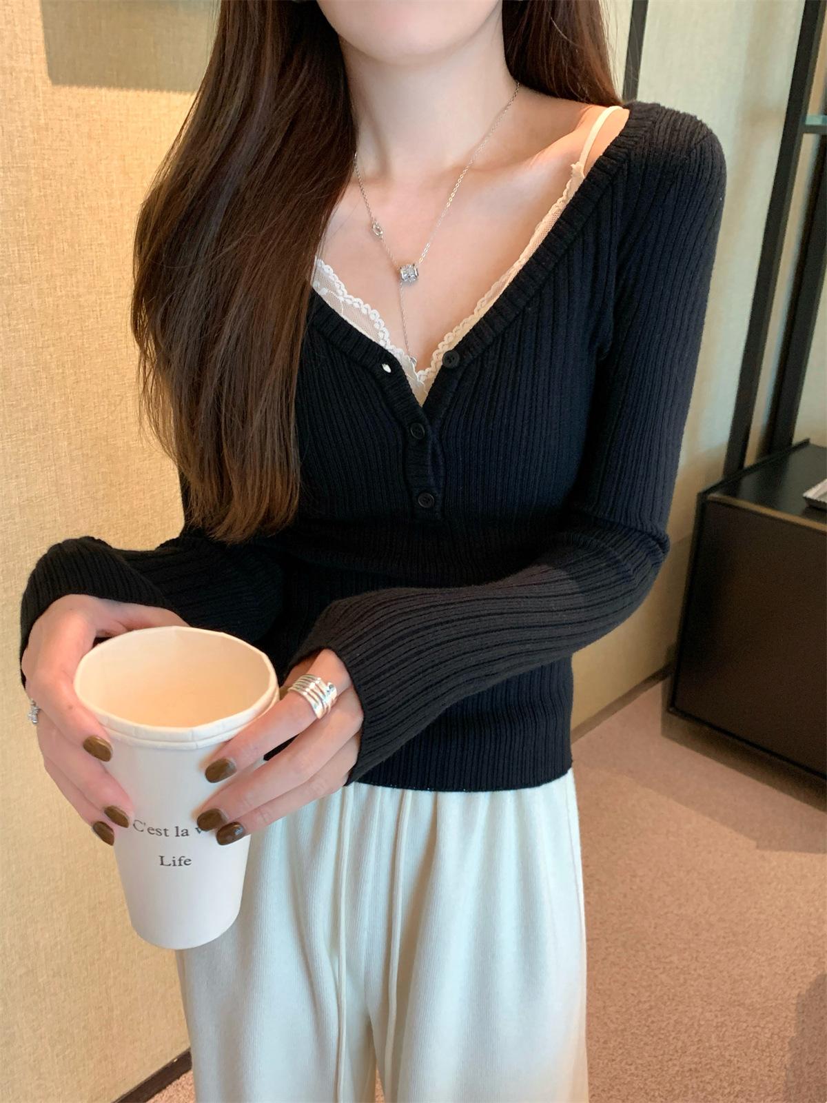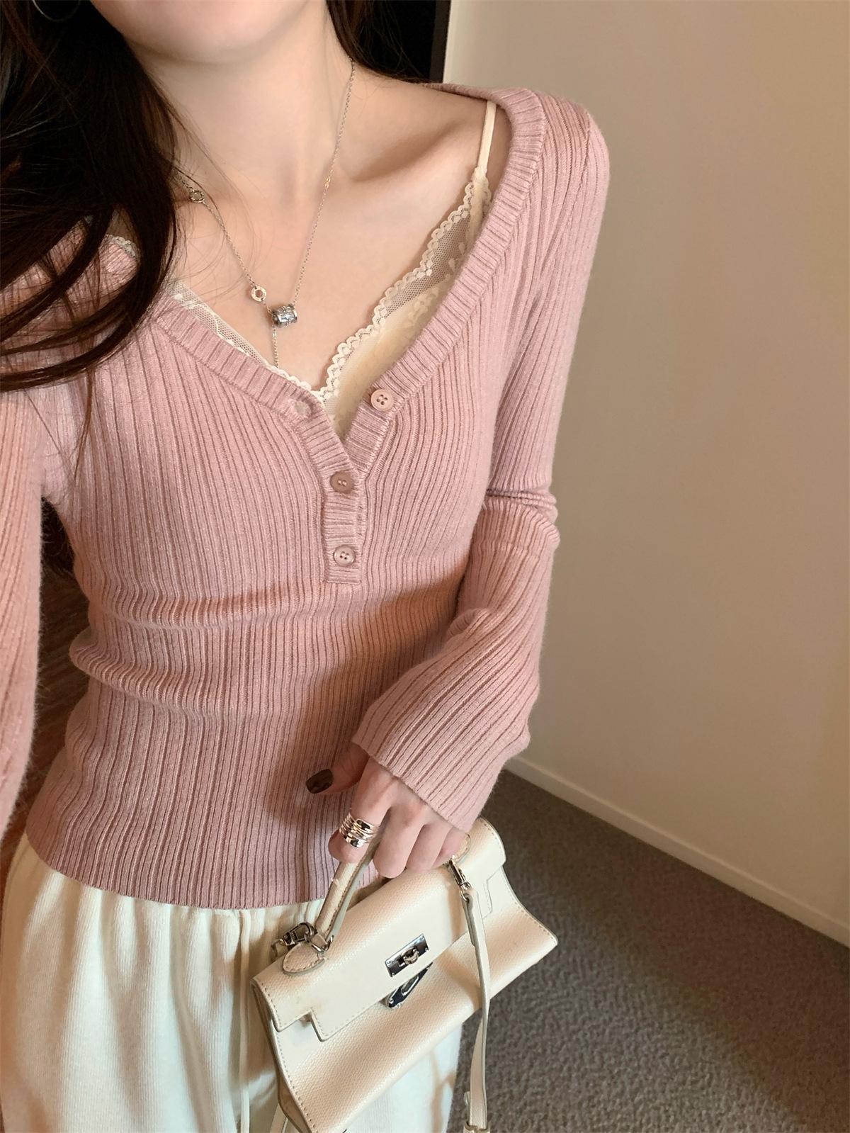 Foto Real Otoño Nuevo Estilo Coreano Temperamento Suave Cuello en V Botón Adelgazante Tejido Camiseta Base Manga Larga Suéter Mujer 88695