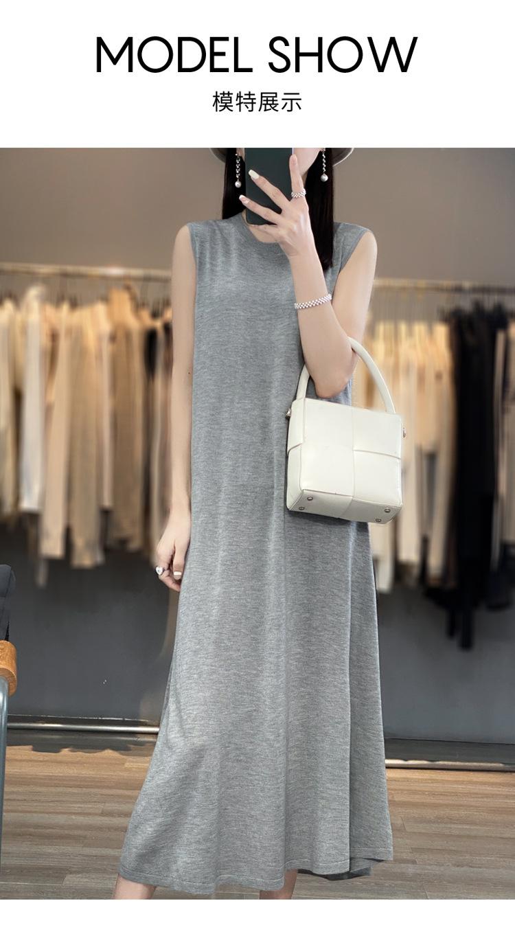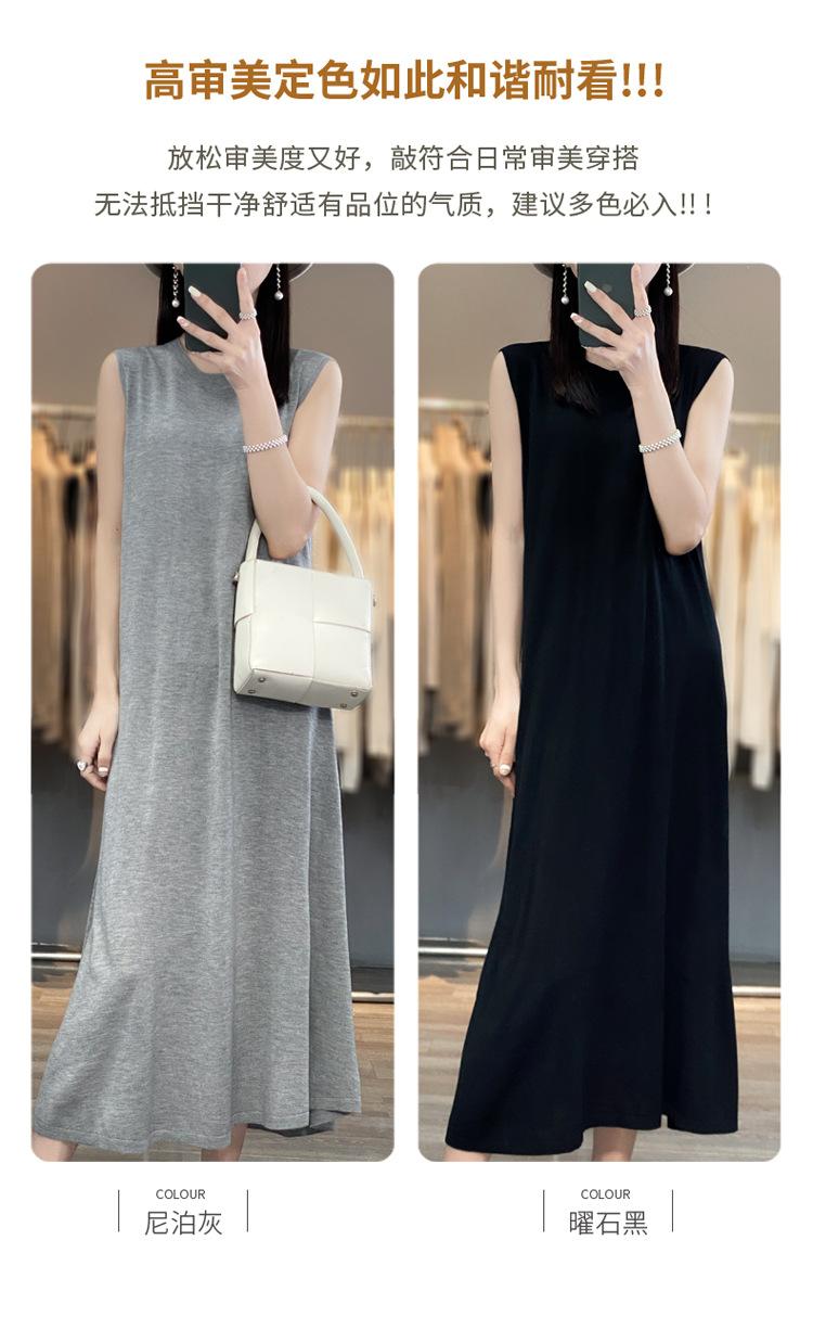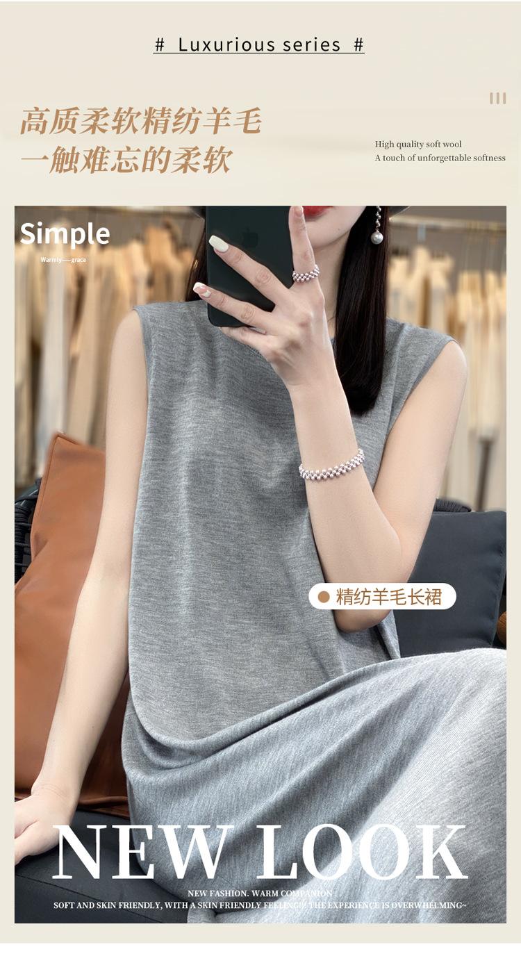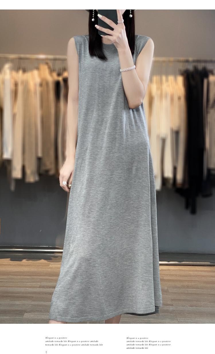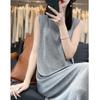 Vestido largo de lana peinada primavera 2024 color sólido elegante ajustado sin mangas holgado cuello redondo
