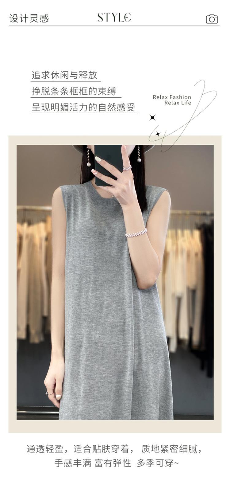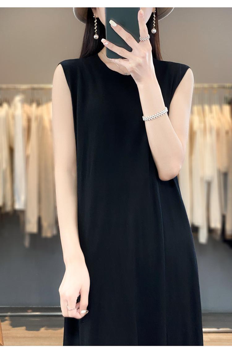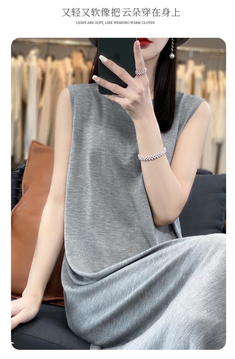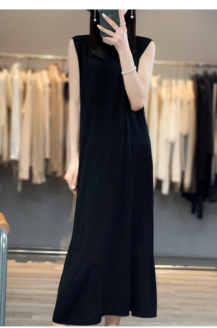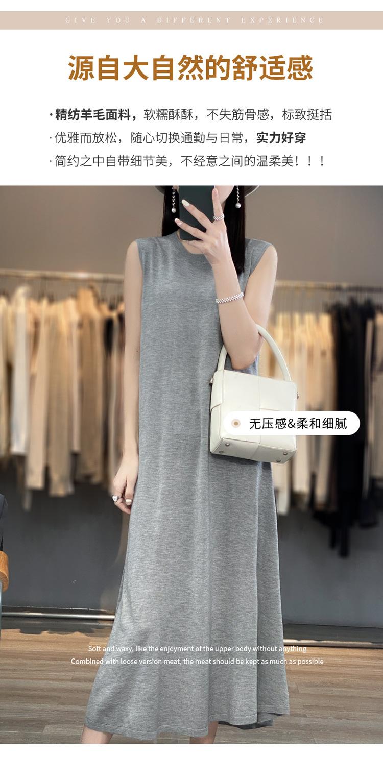 Vestido largo de lana peinada primavera 2024 color sólido elegante ajustado sin mangas holgado cuello redondo