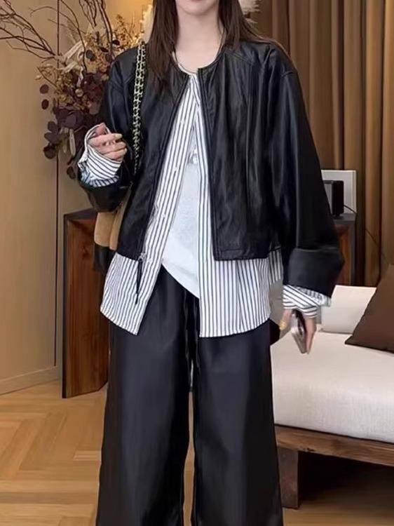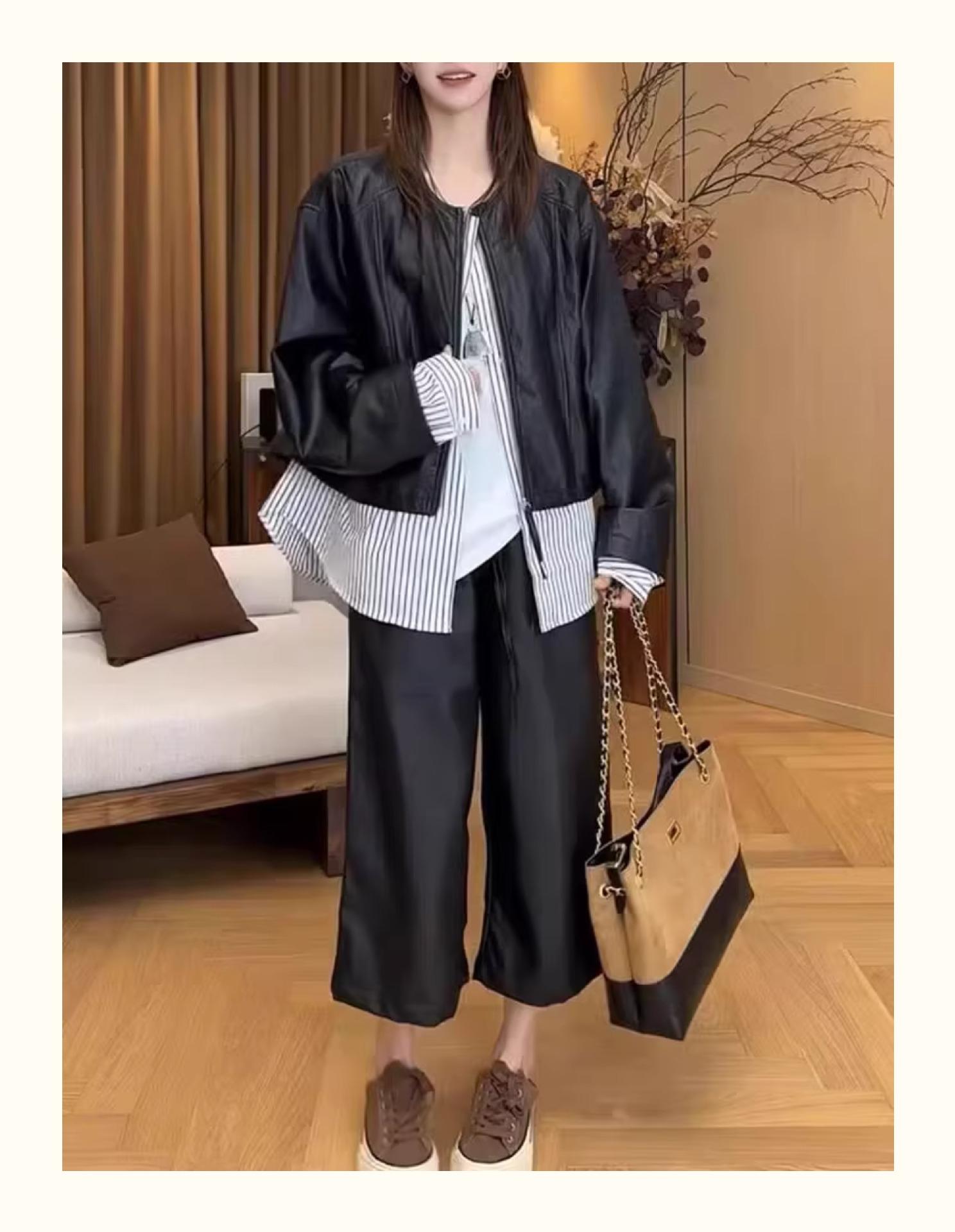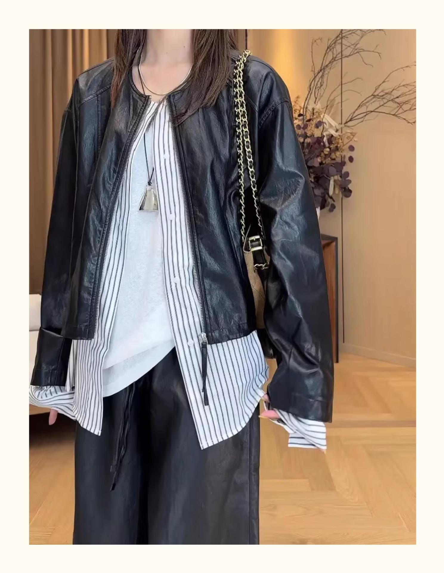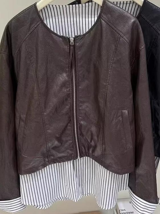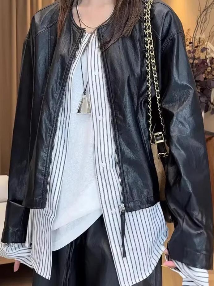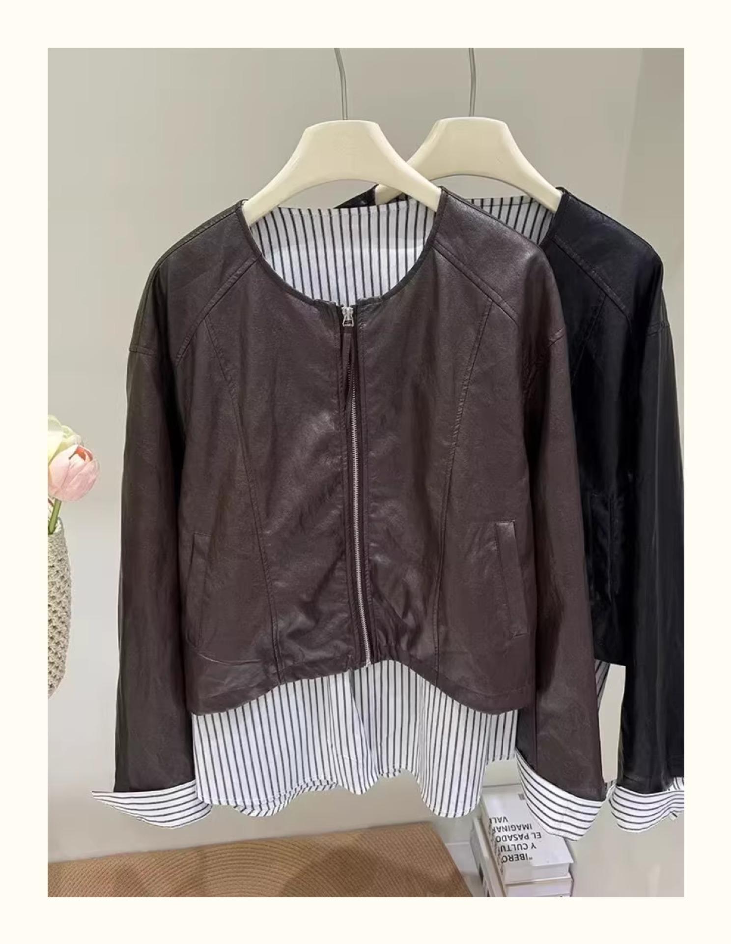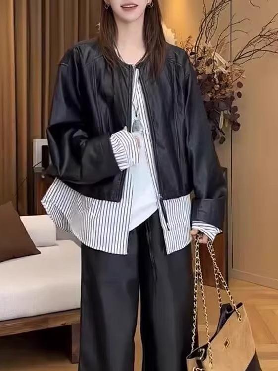 Chaqueta de Cuero Sintético Patchwork Rayada Estilo Europeo para Mujer Otoño 2025 Nueva Holgada Adelgazante Top