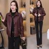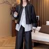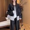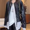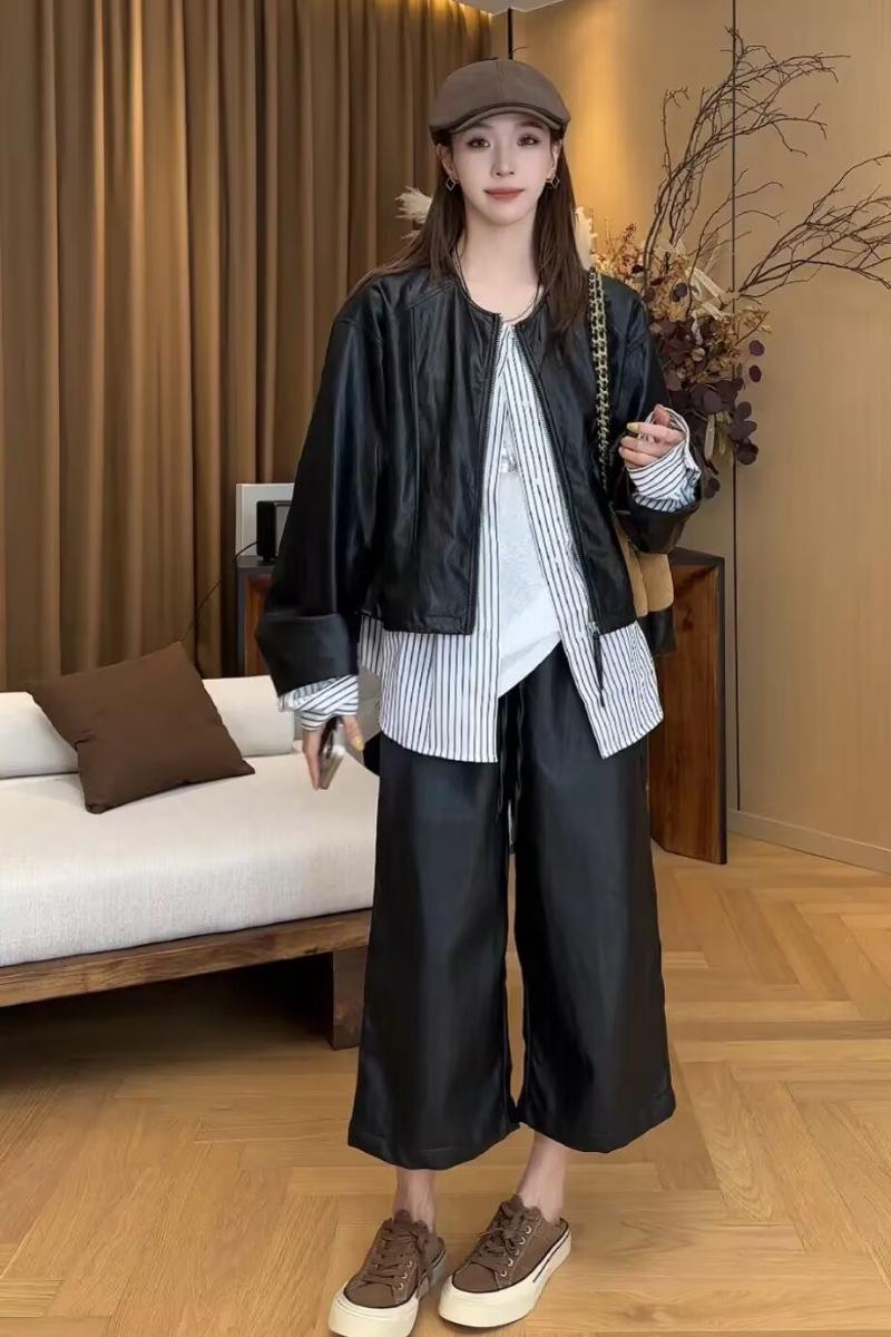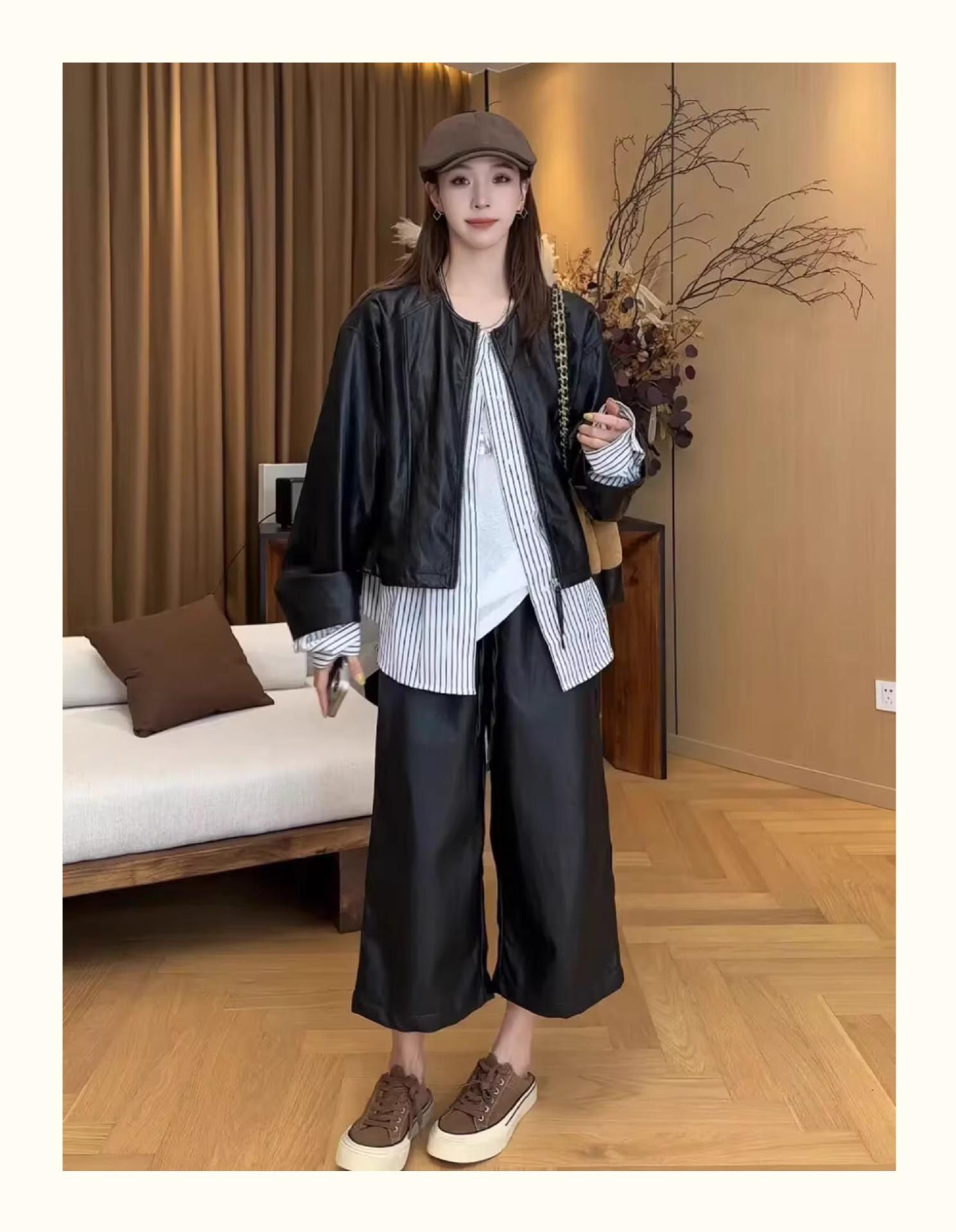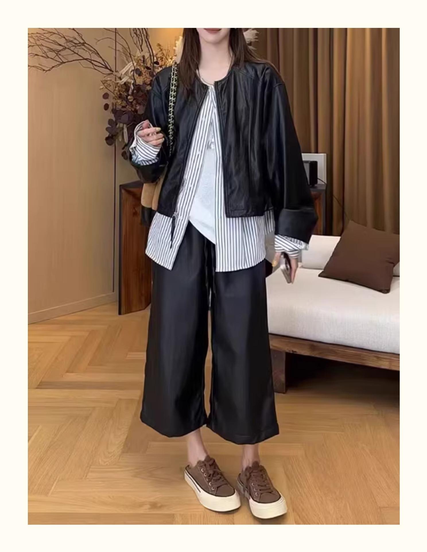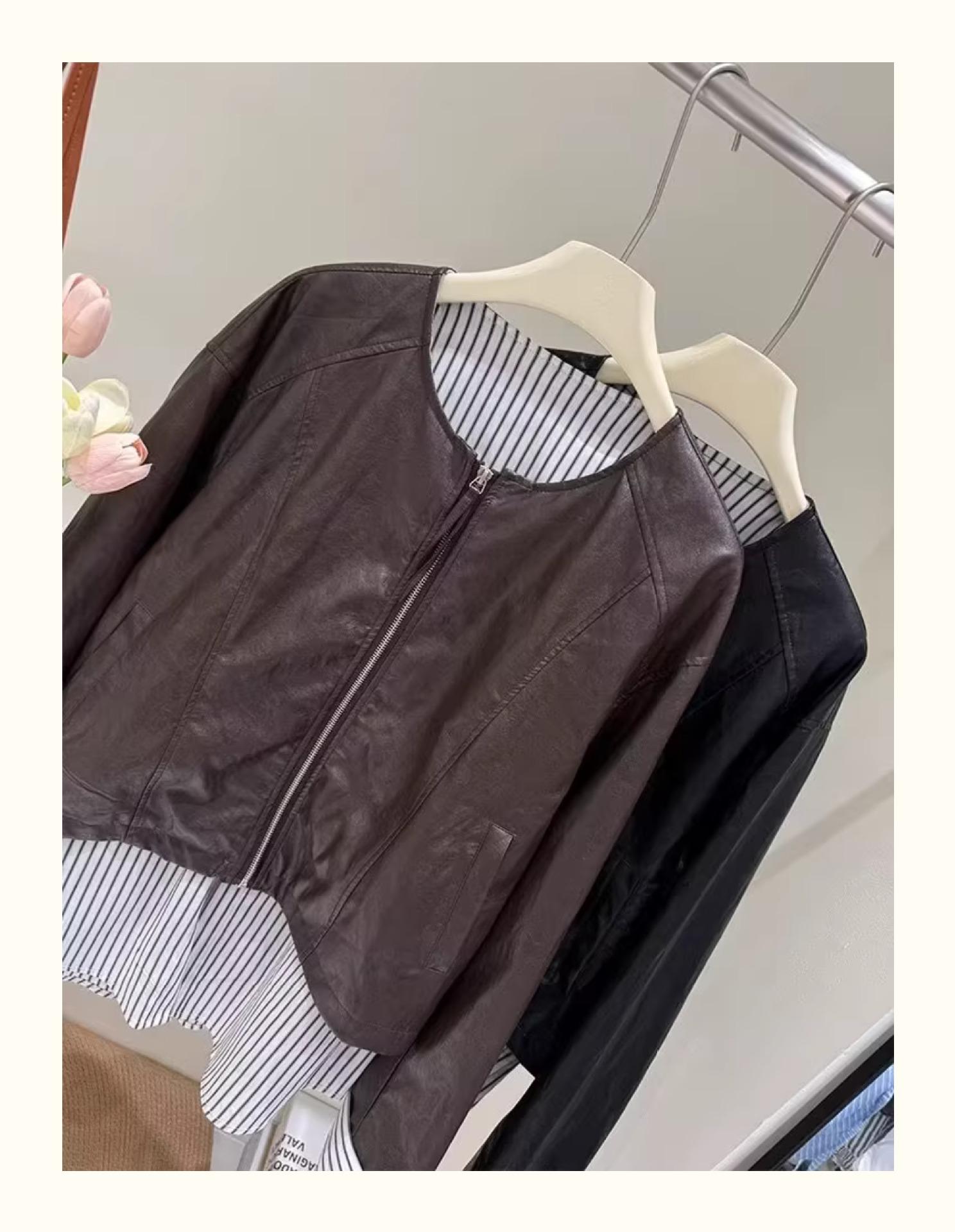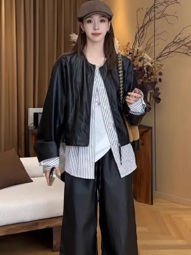 Chaqueta de Cuero Sintético Patchwork Rayada Estilo Europeo para Mujer Otoño 2025 Nueva Holgada Adelgazante Top