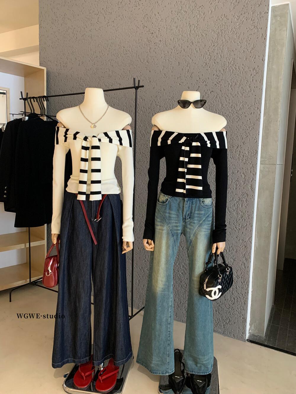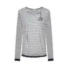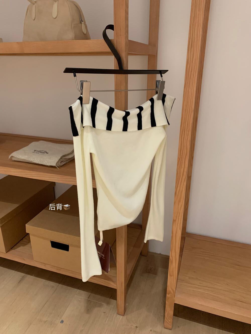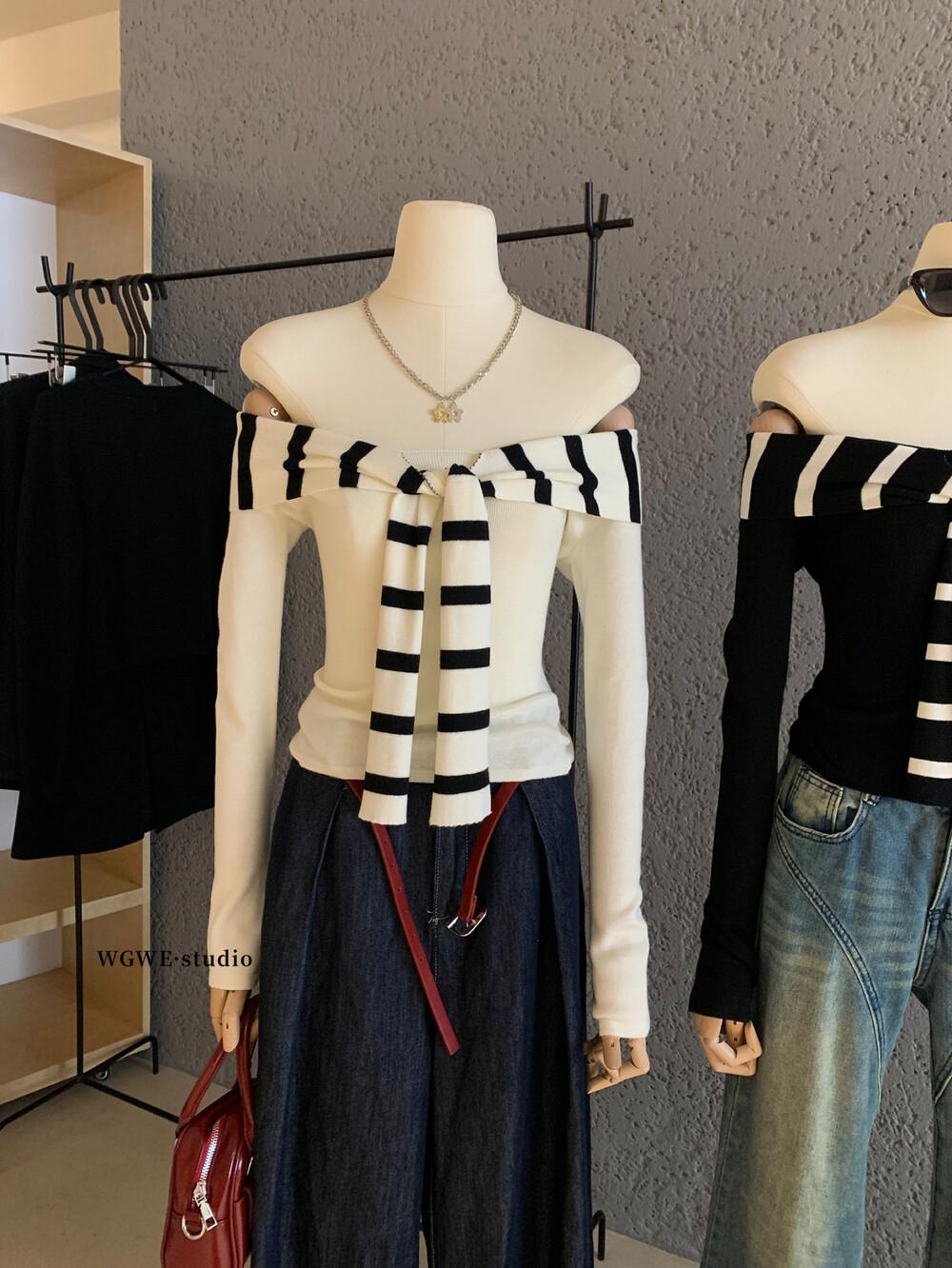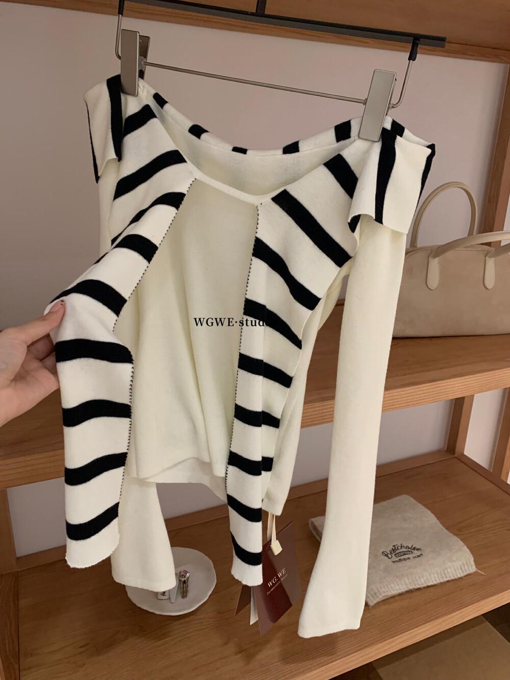 WGWE Otoño Coreano Puro y Sexy Chica Caliente Rayas Patchwork Encaje con Cordones Adelgazante Un Hombro Manga Larga Camiseta W7135