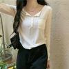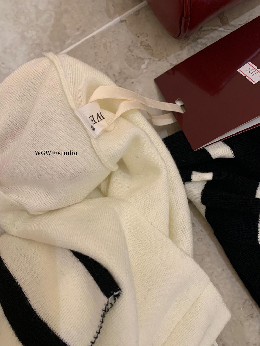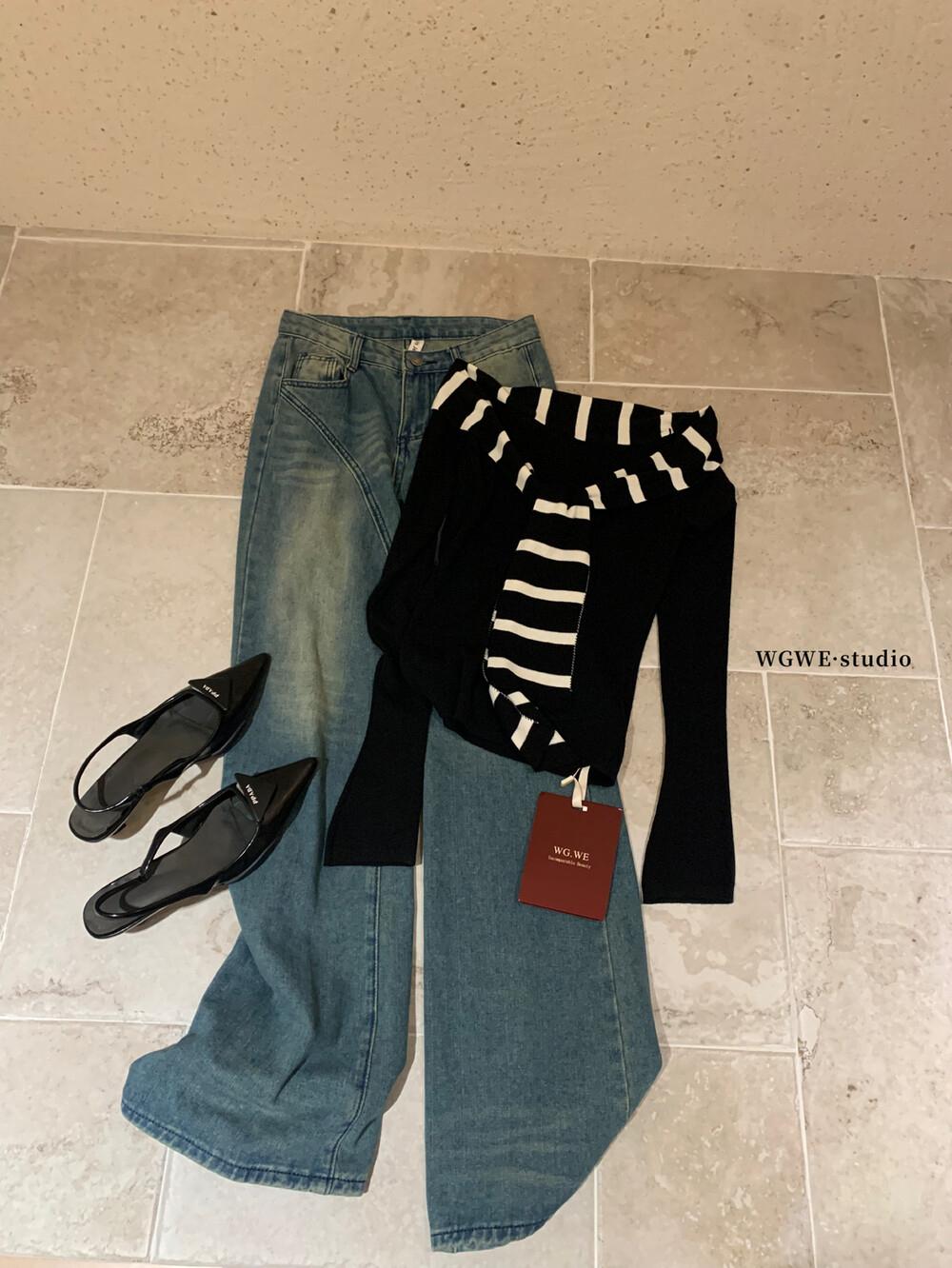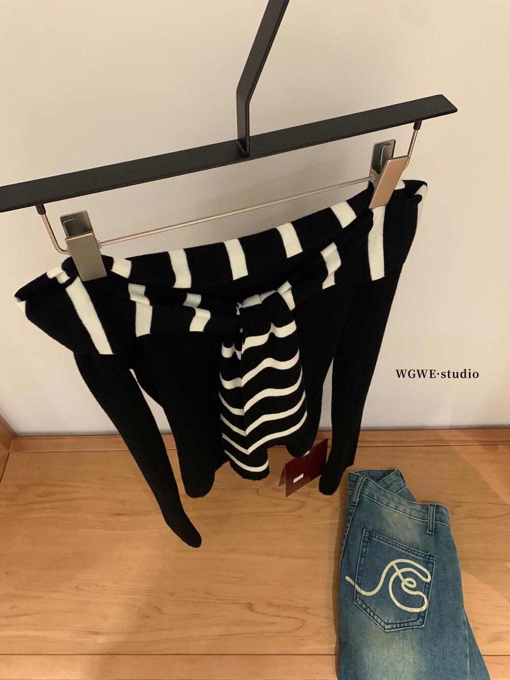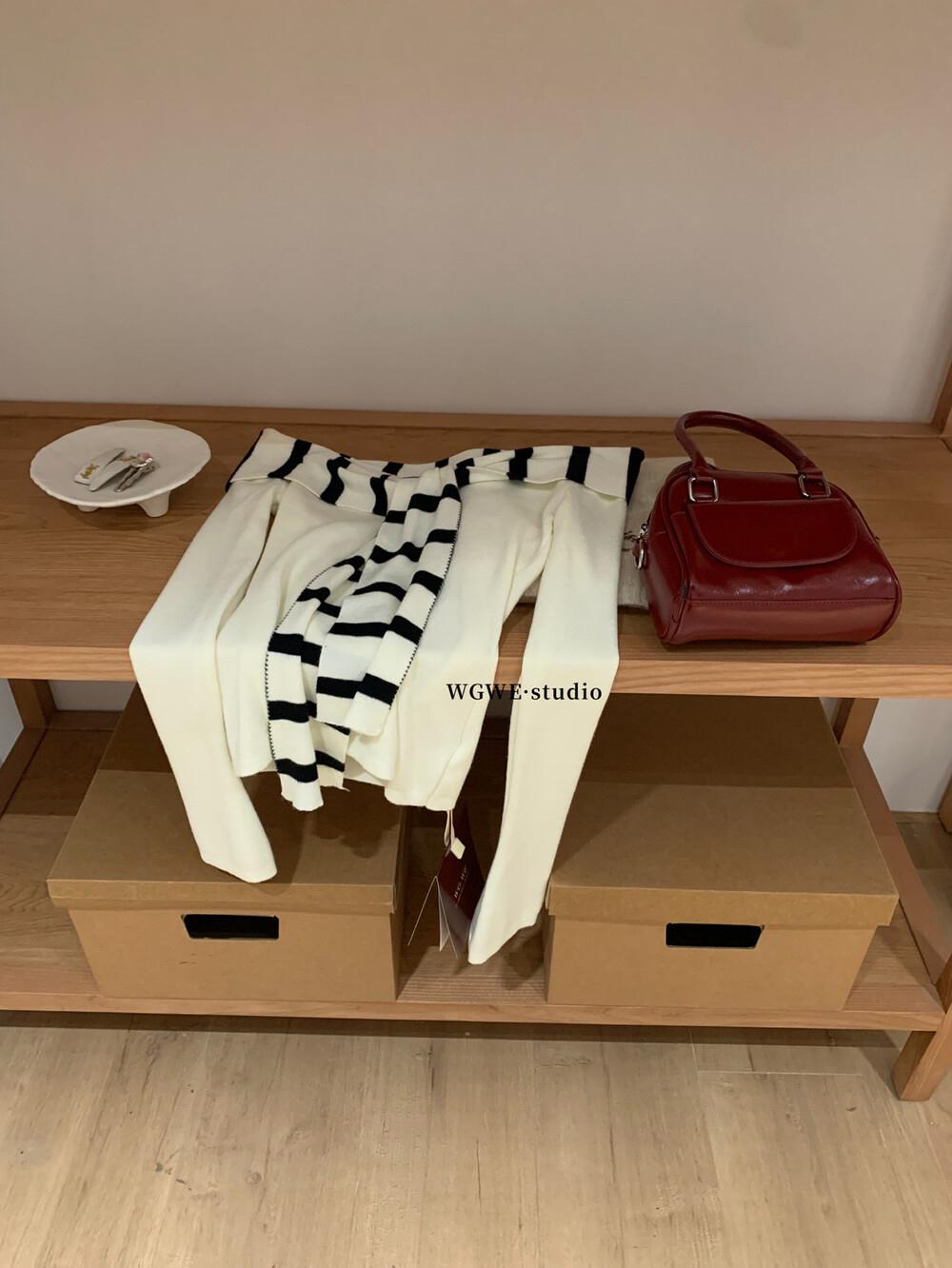 WGWE Otoño Coreano Puro y Sexy Chica Caliente Rayas Patchwork Encaje con Cordones Adelgazante Un Hombro Manga Larga Camiseta W7135