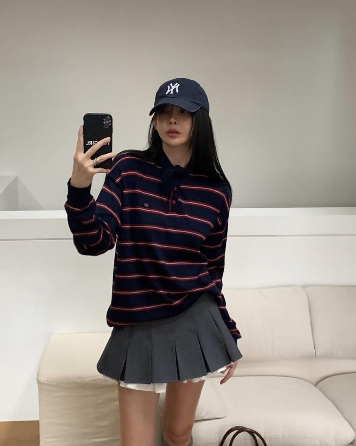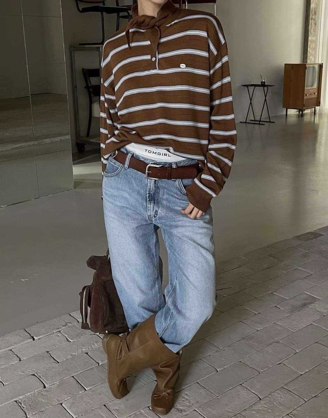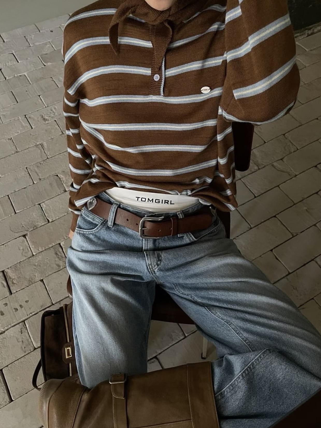 Punto chic coreano otoño nuevo retro a rayas abotonado cuello puntiagudo holgado perezoso manga larga prendas de punto ropa de mujer